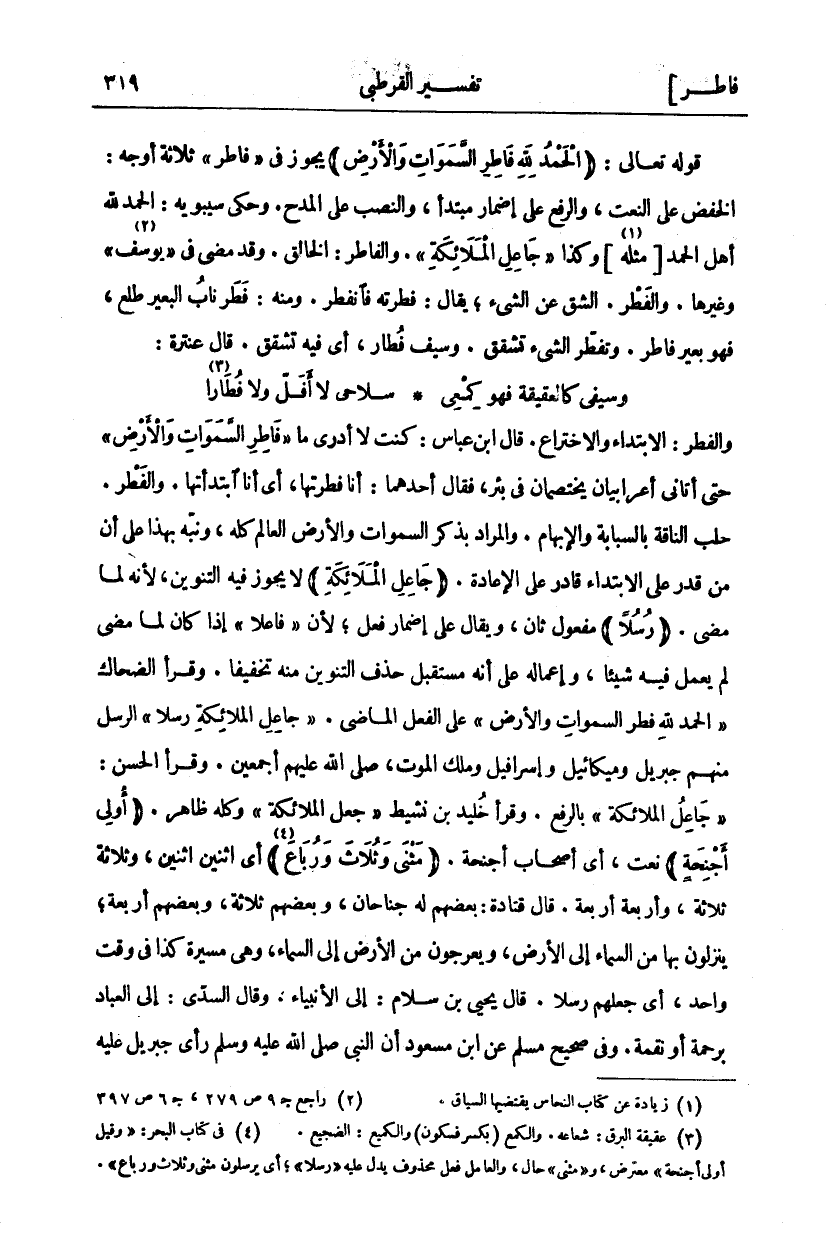 وَالْفَطْرُ: الِابْتِدَاءُ وَالِاخْتِرَاعُ. قَالَ ابْنُ عَبَّاسٍ: كُنْتُ لَا أَدْرِي مَا" فاطِرِ السَّماواتِ وَالْأَرْضِ" حَتَّى أَتَانِي أَعْرَابِيَّانِ يَخْتَصِمَانِ في بئر، فقال أحدهما: أنا فطرتها، أي أَنَا ابْتَدَأْتُهَا. وَالْفَطْرُ. حَلْبُ النَّاقَةِ بِالسَّبَّابَةِ وَالْإِبْهَامِ. وَالْمُرَادُ بِذِكْرِ السَّمَاوَاتِ وَالْأَرْضِ الْعَالَمُ كُلُّهُ، وَنَبَّهَ بِهَذَا عَلَى أَنَّ مَنْ قَدَرَ عَلَى الِابْتِدَاءِ قَادِرٌ عَلَى الْإِعَادَةِ." جاعِلِ الْمَلائِكَةِ" لَا يَجُوزُ فِيهِ التَّنْوِينُ، لِأَنَّهُ لِمَا مَضَى." رُسُلًا" مَفْعُولٌ ثَانٍ، وَيُقَالُ عَلَى إِضْمَارِ فِعْلٍ، لِأَنَّ" فَاعِلًا" إِذَا كَانَ لِمَا مَضَى لَمْ يَعْمَلْ فِيهِ شَيْئًا، وَإِعْمَالُهُ عَلَى أَنَّهُ مُسْتَقْبَلٌ حُذِفَ التَّنْوِينُ مِنْهُ تَخْفِيفًا. وَقَرَأَ الضَّحَّاكُ" الْحَمْدُ لِلَّهِ فَطَرَ السماوات والأرض" على الفصل الْمَاضِي. (جاعِلِ الْمَلائِكَةِ رُسُلًا) الرُّسُلُ مِنْهُمْ جِبْرِيلُ وَمِيكَائِيلُ وَإِسْرَافِيلُ وَمَلَكُ الْمَوْتِ، صَلَّى اللَّهُ عَلَيْهِمْ أَجْمَعِينَ. وَقَرَأَ الْحَسَنُ:" جَاعِلُ الْمَلَائِكَةِ" بِالرَّفْعِ. وَقَرَأَ خُلَيْدُ بْنُ نَشِيطٍ" جَعَلَ الْمَلَائِكَةَ" وَكُلُّهُ ظَاهِرٌ. (أُولِي أَجْنِحَةٍ) نَعْتٌ، أَيْ أَصْحَابُ أَجْنِحَةٍ. (مَثْنى وَثُلاثَ وَرُباعَ) «٤» أَيِ اثْنَيْنِ اثْنَيْنِ، وَثَلَاثَةً ثَلَاثَةً، وَأَرْبَعَةً أَرْبَعَةً. قَالَ قَتَادَةُ: بَعْضُهُمْ لَهُ جَنَاحَانِ، وَبَعْضُهُمْ ثَلَاثَةٌ، وَبَعْضُهُمْ أَرْبَعَةٌ، يَنْزِلُونَ بِهِمَا مِنَ السَّمَاءِ إِلَى الْأَرْضِ، وَيَعْرُجُونَ مِنَ الْأَرْضِ إِلَى السَّمَاءِ، وَهِيَ مَسِيرَةُ كَذَا فِي وَقْتٍ وَاحِدٍ، أَيْ جَعَلَهُمْ رُسُلًا. قَالَ يَحْيَى بْنُ سَلَّامٍ: إِلَى الْأَنْبِيَاءِ. وَقَالَ السُّدِّيُّ: إِلَى الْعِبَادِ بِرَحْمَةٍ أَوْ نِقْمَةٍ. وَفِي صَحِيحِ مُسْلِمٍ عَنِ ابْنِ مَسْعُودٍ أَنَّ النَّبِيَّ صَلَّى اللَّهُ عَلَيْهِ وَسَلَّمَ رَأَى جبريل عليه
