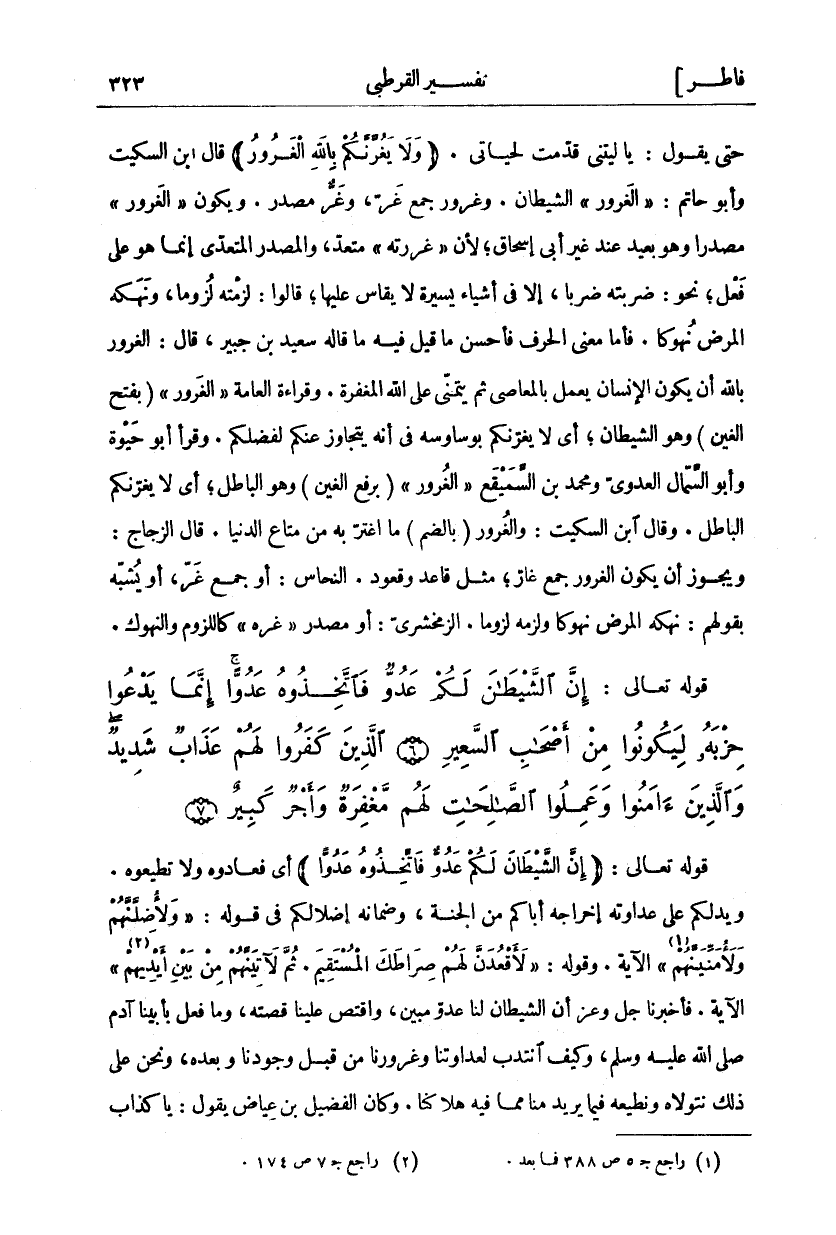 حتى يقول: يا لَيْتَنِي قَدَّمْتُ لِحَياتِي. قَالَ ابْنُ السِّكِّيتِ وَأَبُو حَاتِمٍ:" الْغَرُورُ" الشَّيْطَانُ. وَغَرُورٌ جَمْعُ غَرٍّ، وَغَرٌّ مَصْدَرٌ. وَيَكُونُ" الْغَرُورُ" مَصْدَرًا وَهُوَ بَعِيدٌ عِنْدَ غَيْرِ أَبِي إِسْحَاقَ، لِأَنَّ" غَرَرْتُهُ" مُتَعَدٍّ، وَالْمَصْدَرُ الْمُتَعَدِّي إِنَّمَا هُوَ عَلَى فَعْلٍ، نَحْوُ: ضَرَبْتُهُ ضَرْبًا، إِلَّا فِي أَشْيَاءَ يَسِيرَةٍ لَا يُقَاسُ عَلَيْهَا، قَالُوا: لَزِمْتُهُ لُزُومًا، وَنَهَكَهُ الْمَرَضُ نُهُوكًا. فَأَمَّا مَعْنَى الْحَرْفِ فَأَحْسَنُ مَا قِيلَ فِيهِ مَا قَالَهُ سَعِيدُ بْنُ جُبَيْرٍ، قَالَ: الْغُرُورُ بِاللَّهِ أَنْ يَكُونَ الْإِنْسَانُ يَعْمَلُ بِالْمَعَاصِي ثُمَّ يَتَمَنَّى عَلَى اللَّهِ الْمَغْفِرَةَ. وَقِرَاءَةُ الْعَامَّةِ" الْغَرُورُ" (بِفَتْحِ الْغَيْنِ) وَهُوَ الشَّيْطَانُ، أَيْ لَا يَغُرَّنَّكُمْ بِوَسَاوِسِهِ فِي أَنَّهُ يَتَجَاوَزُ عَنْكُمْ لِفَضْلِكُمْ. وَقَرَأَ أَبُو حَيْوَةَ وَأَبُو المال العدوي ومحمد بن المقع" الْغُرُورُ" (بِرَفْعِ الْغَيْنِ) وَهُوَ الْبَاطِلُ، أَيْ لَا يَغُرَّنَّكُمُ الْبَاطِلُ. وَقَالَ ابْنُ السِّكِّيتِ: وَالْغُرُورُ (بِالضَّمِّ) مَا اغْتُرَّ بِهِ مِنْ مَتَاعِ الدُّنْيَا. قَالَ الزَّجَّاجُ: وَيَجُوزُ أَنْ يَكُونَ الْغُرُورُ جَمْعَ غَارٍّ، مِثْلُ قَاعِدٍ وَقُعُودٍ. النَّحَّاسُ: أَوْ جَمْعَ غَرٍّ، أَوْ يُشَبَّهُ بِقَوْلِهِمْ: نَهَكَهُ الْمَرَضُ نُهُوكًا وَلَزِمَهُ لُزُومًا. الزَّمَخْشَرِيُّ: أَوْ مَصْدَرَ" غَرَّهُ" كَاللُّزُومِ وَالنُّهُوكِ.