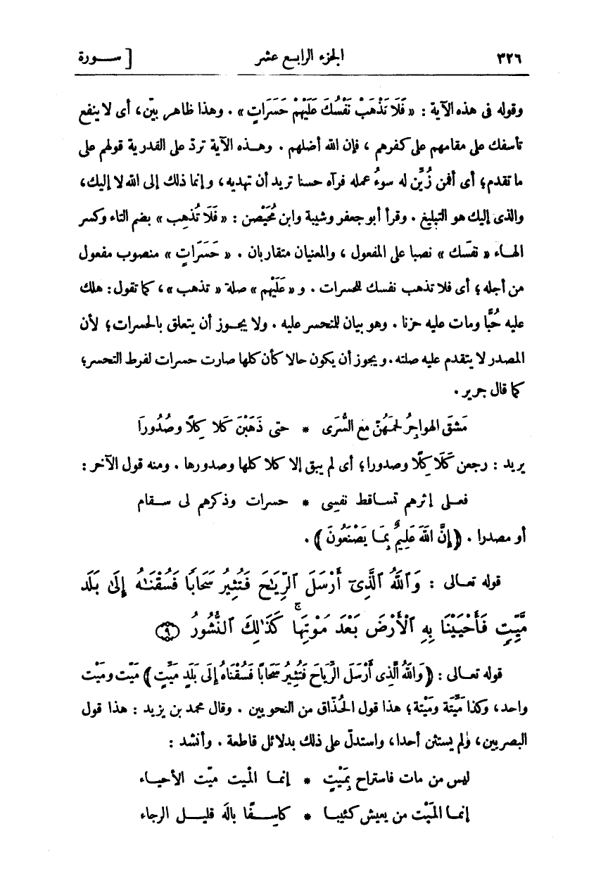 وقوله في هذه الآية: وَهَذَا ظَاهِرٌ بَيِّنٌ، أَيْ لَا يَنْفَعُ تَأَسُّفُكَ عَلَى مُقَامِهِمْ عَلَى كُفْرِهِمْ، فَإِنَّ اللَّهَ أَضَلَّهُمْ. وَهَذِهِ الْآيَةُ تَرُدُّ عَلَى الْقَدَرِيَّةِ قَوْلَهُمْ عَلَى مَا تَقَدَّمَ، أَيْ أَفَمَنْ زُيِّنَ لَهُ سُوءُ عَمَلِهِ فَرَآهُ حَسَنًا تُرِيدُ أَنْ تَهْدِيَهُ، وَإِنَّمَا ذَلِكَ إِلَى اللَّهِ لَا إِلَيْكَ، وَالَّذِي إِلَيْكَ هُوَ التَّبْلِيغُ. وَقَرَأَ أَبُو جَعْفَرٍ وَشَيْبَةُ وَابْنُ مُحَيْصِنٍ:" فَلَا تُذْهِبْ" بِضَمِّ التَّاءِ وَكَسْرِ الْهَاءِ" نَفْسُكَ" نَصْبًا عَلَى الْمَفْعُولِ، وَالْمَعْنَيَانِ مُتَقَارِبَانِ." حَسَراتٍ" مَنْصُوبٌ مَفْعُولٌ مِنْ أَجْلِهِ، أَيْ فَلَا تَذْهَبُ نَفْسُكَ لِلْحَسَرَاتِ. وَ" عَلَيْهِمْ" صِلَةُ" تَذْهَبْ"، كَمَا تَقُولُ: هَلَكَ عَلَيْهِ حُبًّا وَمَاتَ عَلَيْهِ حُزْنًا. وَهُوَ بَيَانٌ لِلْمُتَحَسَّرِ عَلَيْهِ. وَلَا يَجُوزُ أَنْ يَتَعَلَّقَ بِالْحَسَرَاتِ، لِأَنَّ الْمَصْدَرَ لَا يَتَقَدَّمُ عَلَيْهِ صلته. ويجوز أن يكون حالا كأن كلها صَارَتْ حَسَرَاتٍ لِفَرْطِ التَّحَسُّرِ، كَمَا قَالَ جَرِيرٌ: