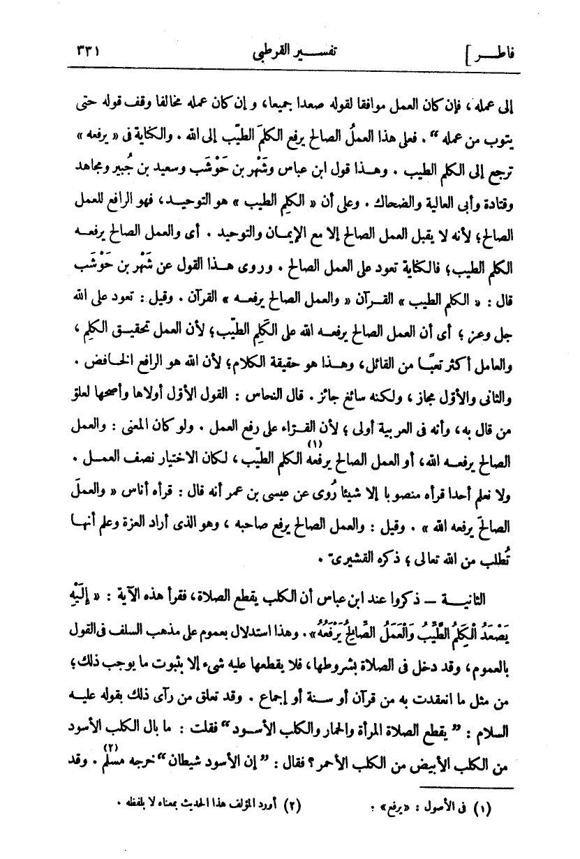 إِلَى عَمَلِهِ، فَإِنْ كَانَ الْعَمَلُ مُوَافِقًا لِقَوْلِهِ صَعِدَا جَمِيعًا، وَإِنْ كَانَ عَمَلُهُ. مُخَالِفًا وُقِفَ قَوْلُهُ حَتَّى يَتُوبَ مِنْ عَمَلِهِ (. فَعَلَى هَذَا الْعَمَلُ الصَّالِحُ يَرْفَعُ الْكَلِمَ الطَّيِّبَ إِلَى اللَّهِ. وَالْكِنَايَةُ فِي" يَرْفَعُهُ" تَرْجِعُ إِلَى الْكَلِمِ الطَّيِّبِ. وَهَذَا قَوْلُ ابْنِ عَبَّاسٍ وَشَهْرِ بْنِ حَوْشَبٍ وَسَعِيدِ بْنِ جُبَيْرٍ وَمُجَاهِدٍ وَقَتَادَةَ وَأَبِي الْعَالِيَةِ وَالضَّحَّاكِ. وَعَلَى أَنَّ" الْكَلِمُ الطَّيِّبُ" هُوَ التَّوْحِيدُ، فَهُوَ الرَّافِعُ لِلْعَمَلِ الصَّالِحِ، لِأَنَّهُ لَا يُقْبَلُ الْعَمَلُ الصَّالِحُ إِلَّا مَعَ الْإِيمَانِ وَالتَّوْحِيدِ. أَيْ وَالْعَمَلُ الصَّالِحُ يَرْفَعُهُ الْكَلِمُ الطَّيِّبُ، فَالْكِنَايَةُ تَعُودُ عَلَى الْعَمَلِ الصَّالِحِ. وَرُوِيَ هَذَا الْقَوْلُ عَنْ شَهْرِ بْنِ حَوْشَبٍ قَالَ:" الْكَلِمُ الطَّيِّبُ" الْقُرْآنُ" وَالْعَمَلُ الصَّالِحُ يَرْفَعُهُ" الْقُرْآنُ. وَقِيلَ: تَعُودُ عَلَى اللَّهِ جَلَّ وَعَزَّ، أَيْ أَنَّ الْعَمَلَ الصَّالِحَ يَرْفَعُهُ اللَّهُ عَلَى الْكَلِمِ الطَّيِّبِ، لِأَنَّ الْعَمَلَ تَحْقِيقُ الْكَلِمِ، وَالْعَامِلُ أَكْثَرُ تَعَبًا مِنَ الْقَائِلِ، وَهَذَا هُوَ حَقِيقَةُ الْكَلَامِ، لِأَنَّ اللَّهَ هُوَ الرَّافِعُ الْخَافِضُ. وَالثَّانِي وَالْأَوَّلُ مَجَازٌ، وَلَكِنَّهُ سَائِغٌ جَائِزٌ. قَالَ النَّحَّاسُ: الْقَوْلُ الْأَوَّلُ أَوْلَاهَا وَأَصَحُّهَا لِعُلُوِّ مَنْ قَالَ بِهِ، وَأَنَّهُ فِي الْعَرَبِيَّةِ أَوْلَى، لِأَنَّ الْقُرَّاءَ عَلَى رَفْعِ الْعَمَلِ. وَلَوْ كَانَ الْمَعْنَى: وَالْعَمَلُ الصَّالِحُ يَرْفَعُهُ اللَّهُ، أَوِ الْعَمَلُ الصَّالِحُ يَرْفَعُهُ الْكَلِمُ الطَّيِّبُ، لَكَانَ الِاخْتِيَارُ نِصْفَ الْعَمَلِ. وَلَا نَعْلَمُ أَحَدًا قَرَأَهُ مَنْصُوبًا إِلَّا شَيْئًا رُوِيَ عَنْ عِيسَى، بْنِ عُمَرَ أَنَّهُ قَالَ: قَرَأَهُ أُنَاسٌ" وَالْعَمَلَ الصَّالِحَ يَرْفَعُهُ اللَّهُ". وَقِيلَ: وَالْعَمَلُ الصَّالِحُ يَرْفَعُ صَاحِبَهُ، وَهُوَ الَّذِي أَرَادَ الْعِزَّةَ وَعَلِمَ أَنَّهَا تُطْلَبُ مِنَ اللَّهِ تَعَالَى، ذَكَرَهُ الْقُشَيْرِيُّ. الثَّانِيَةُ: ذَكَرُوا عِنْدَ ابْنِ عَبَّاسٍ أَنَّ الْكَلْبَ يَقْطَعُ الصَّلَاةَ، فَقَرَأَ هَذِهِ الْآيَةَ:" إِلَيْهِ يَصْعَدُ الْكَلِمُ الطَّيِّبُ وَالْعَمَلُ الصَّالِحُ يَرْفَعُهُ". وَهَذَا اسْتِدْلَالٌ بِعُمُومٍ عَلَى مَذْهَبِ السَّلَفِ فِي الْقَوْلِ بِالْعُمُومِ، (وَقَدْ دَخَلَ فِي الصلاة بشروطها، فلا يقطعها عليه شي إِلَّا بِثُبُوتِ مَا يُوجِبُ ذَلِكَ، مِنْ مِثْلِ مَا انْعَقَدَتْ بِهِ مِنْ قُرْآنٍ أَوْ سُنَّةٍ أَوْ إِجْمَاعٍ. وَقَدْ تَعَلَّقَ مَنْ رَأَى، ذَلِكَ بِقَوْلِهِ عَلَيْهِ السَّلَامُ: (يَقْطَعُ الصَّلَاةَ الْمَرْأَةُ وَالْحِمَارُ وَالْكَلْبُ الْأَسْوَدُ) فَقُلْتُ: مَا بَالُ الْكَلْبِ الْأَسْوَدِ مِنَ الْكَلْبِ الْأَبْيَضِ مِنَ الْكَلْبِ الْأَحْمَرِ؟ فَقَالَ: (إِنَّ الْأَسْوَدَ شَيْطَانٌ) خَرَّجَهُ مُسْلِمٌ. وَقَدْ