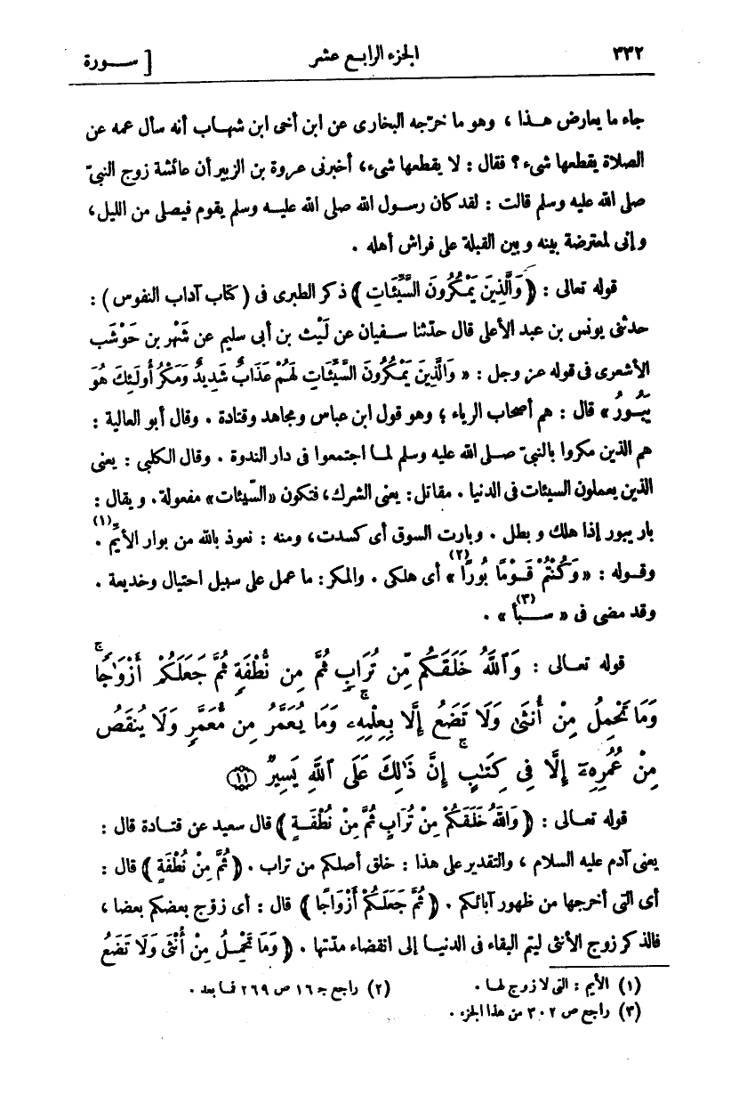 قَوْلُهُ تَعَالَى (وَاللَّهُ خَلَقَكُمْ مِنْ تُرابٍ ثُمَّ مِنْ نُطْفَةٍ) قَالَ سَعِيدٌ عَنْ قَتَادَةَ قَالَ: يَعْنِي آدَمَ عَلَيْهِ السَّلَامُ، وَالتَّقْدِيرُ عَلَى هَذَا: خَلَقَ أصلكم من تراب. قَالَ: أَيِ الَّتِي أَخْرَجَهَا مِنْ ظُهُورِ آبَائِكُمْ. قَالَ: أَيْ زَوَّجَ بَعْضَكُمْ بَعْضًا، فَالذَّكَرُ زَوْجُ الْأُنْثَى لِيُتِمَّ الْبَقَاءَ فِي الدُّنْيَا إِلَى انْقِضَاءِ مُدَّتِهَا. (وَما تَحْمِلُ مِنْ أُنْثى وَلا تَضَعُ إِلَّا بِعِلْمِهِ)