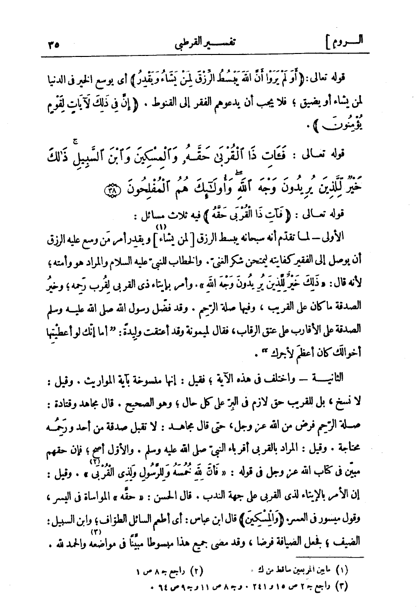 قَوْلُهُ تَعَالَى: (فَآتِ ذَا الْقُرْبى حَقَّهُ) فِيهِ ثَلَاثُ مَسَائِلَ: الْأُولَى- لَمَّا تَقَدَّمَ أَنَّهُ سُبْحَانَهُ يَبْسُطُ الرِّزْقَ [لِمَنْ يَشَاءُ «١»] وَيَقْدِرُ أَمَرَ مَنْ وَسَّعَ عَلَيْهِ الرِّزْقَ أَنْ يُوَصِّلَ إِلَى الْفَقِيرِ كِفَايَتَهُ لِيَمْتَحِنَ شُكْرَ الْغَنِيِّ. وَالْخِطَابُ لِلنَّبِيِّ عَلَيْهِ السَّلَامُ وَالْمُرَادُ هُوَ وَأُمَّتُهُ، لِأَنَّهُ قَالَ:" ذلِكَ خَيْرٌ لِلَّذِينَ يُرِيدُونَ وَجْهَ اللَّهِ". وَأَمَرَ بِإِيتَاءِ ذِي الْقُرْبَى لِقُرْبِ رَحِمِهِ، وَخَيْرُ الصَّدَقَةِ مَا كَانَ عَلَى الْقَرِيبِ، وَفِيهَا صِلَةُ الرَّحِمِ. وَقَدْ فَضَّلَ رَسُولُ اللَّهِ صَلَّى اللَّهُ عَلَيْهِ وَسَلَّمَ الصَّدَقَةَ عَلَى الْأَقَارِبِ عَلَى عِتْقِ الرِّقَابِ، فَقَالَ لِمَيْمُونَةَ وَقَدْ أَعْتَقَتْ وَلِيدَةً: (أَمَا إِنَّكِ لَوْ أَعْطَيْتِهَا أَخْوَالَكِ كَانَ أَعْظَمَ لِأَجْرِكِ). الثَّانِيَةُ- وَاخْتُلِفَ فِي هَذِهِ الْآيَةِ، فَقِيلَ: إِنَّهَا مَنْسُوخَةٌ بِآيَةِ الْمَوَارِيثِ. وَقِيلَ: لَا نَسْخَ، بَلْ لِلْقَرِيبِ حَقٌّ لَازِمٌ فِي الْبِرِّ عَلَى كُلِّ حَالٍ، وَهُوَ الصَّحِيحُ. قَالَ مُجَاهِدٌ وَقَتَادَةُ: صِلَةُ الرَّحِمِ فَرْضٌ مِنَ اللَّهِ عَزَّ وَجَلَّ، حَتَّى قَالَ مُجَاهِدٌ: لَا تُقْبَلُ صَدَقَةٌ مِنْ أَحَدٍ وَرَحِمُهُ مُحْتَاجَةٌ. وَقِيلَ: الْمُرَادُ بِالْقُرْبَى أَقْرِبَاءُ النَّبِيِّ صَلَّى اللَّهُ عَلَيْهِ وَسَلَّمَ. وَالْأَوَّلُ أَصَحُّ، فَإِنَّ حَقَّهُمْ مُبَيَّنٌ فِي كِتَابِ اللَّهِ عَزَّ وَجَلَّ فِي قَوْلِهِ:" فَأَنَّ لِلَّهِ خُمُسَهُ وَلِلرَّسُولِ وَلِذِي الْقُرْبى " «٢» [الأنفال: ٤١]. وَقِيلَ: إِنَّ الْأَمْرَ بِالْإِيتَاءِ لِذِي الْقُرْبَى عَلَى جِهَةِ النَّدْبِ. قَالَ الْحَسَنُ:" حَقَّهُ" الْمُوَاسَاةُ فِي اليسر، وقول ميسور في العسر. (وَالْمِسْكِينَ) قَالَ ابْنُ عَبَّاسٍ: أَيْ أَطْعِمِ السَّائِلَ الطَّوَّافَ، وَابْنَ السَّبِيلِ: الضَّيْفَ، فَجَعَلَ الضِّيَافَةَ فَرْضًا، وَقَدْ مَضَى جَمِيعُ هَذَا مَبْسُوطًا مُبَيَّنًا فِي مَوَاضِعِهِ «٣» والحمد لله.