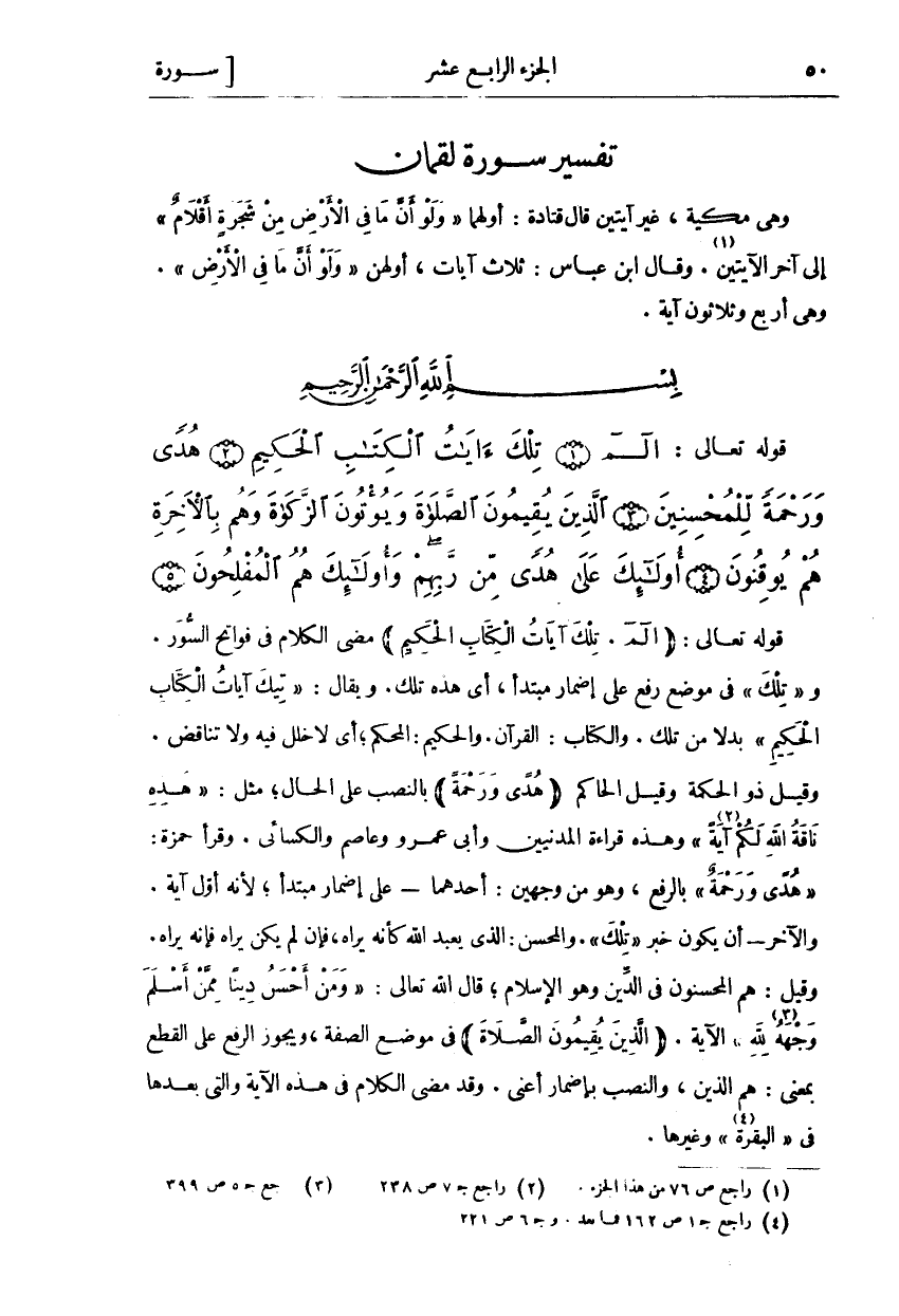 قَوْلُهُ تَعَالَى: (الم. تِلْكَ آياتُ الْكِتابِ الْحَكِيمِ) مَضَى الْكَلَامُ فِي فَوَاتِحِ السُّوَرِ وَ" تِلْكَ" فِي مَوْضِعِ رَفْعٍ عَلَى إِضْمَارِ مُبْتَدَأٍ، أَيْ هَذِهِ تِلْكَ. وَيُقَالُ:" تِيكَ آيَاتُ الْكِتَابِ الْحَكِيمِ" بَدَلًا مِنْ تِلْكَ. وَالْكِتَابُ: الْقُرْآنُ. وَالْحَكِيمُ: الْمُحْكَمُ، أَيْ لَا خَلَلَ فِيهِ وَلَا تَنَاقُضَ. وَقِيلَ ذو الحكمة وقيل الحاكم (هُدىً وَرَحْمَةً) بِالنَّصْبِ عَلَى الْحَالِ، مِثْلُ:" هذِهِ ناقَةُ اللَّهِ لَكُمْ آيَةً" «٢» [الأعراف: ٧٣] وَهَذِهِ قِرَاءَةُ الْمَدَنِيِّينَ وَأَبِي عَمْرٍو وَعَاصِمٍ وَالْكِسَائِيِّ. وَقَرَأَ حَمْزَةُ:" هُدًى وَرَحْمَةٌ" بِالرَّفْعِ، وَهُوَ مِنْ وَجْهَيْنِ: أَحَدُهُمَا- عَلَى إِضْمَارِ مُبْتَدَأٍ، لِأَنَّهُ أَوَّلُ آيَةٍ. وَالْآخَرُ- أَنْ يَكُونَ خَبَرَ" تِلْكَ". وَالْمُحْسِنُ: الَّذِي يَعْبُدُ اللَّهَ كَأَنَّهُ يَرَاهُ، فَإِنْ لَمْ يَكُنْ يَرَاهُ فَإِنَّهُ يَرَاهُ. وَقِيلَ: هُمُ الْمُحْسِنُونَ فِي الدِّينِ وَهُوَ الْإِسْلَامُ، قَالَ اللَّهُ تَعَالَى:" وَمَنْ أَحْسَنُ دِيناً مِمَّنْ أَسْلَمَ وَجْهَهُ لِلَّهِ" «٣» [النساء: ١٢٥] الْآيَةَ. (الَّذِينَ يُقِيمُونَ الصَّلاةَ) فِي مَوْضِعِ الصِّفَةِ، وَيَجُوزُ الرَّفْعُ عَلَى الْقَطْعِ بِمَعْنَى: هُمُ الَّذِينَ، وَالنَّصْبُ بِإِضْمَارٍ أَعْنِي. وَقَدْ مَضَى الْكَلَامُ فِي هَذِهِ الْآيَةِ وَالَّتِي بَعْدَهَا فِي (الْبَقَرَةِ) «٤» وَغَيْرِهَا.