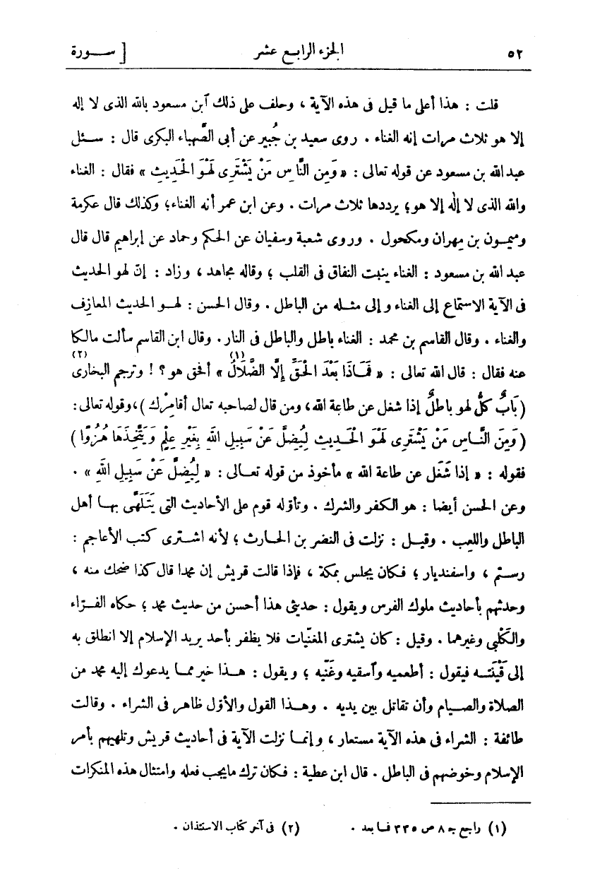 قُلْتُ: هَذَا أَعْلَى مَا قِيلَ فِي هَذِهِ الْآيَةِ، وَحَلَفَ عَلَى ذَلِكَ ابْنُ مَسْعُودٍ بِاللَّهِ الَّذِي لَا إِلَهَ إِلَّا هُوَ ثَلَاثَ مَرَّاتٍ إِنَّهُ الْغِنَاءُ. رَوَى سَعِيدِ بْنِ جُبَيْرٍ عَنْ أَبِي الصَّهْبَاءِ الْبَكْرِيِّ قَالَ: سُئِلَ عَبْدُ اللَّهِ بْنُ مَسْعُودٍ عَنْ قَوْلِهِ تَعَالَى:" وَمِنَ النَّاسِ مَنْ يَشْتَرِي لَهْوَ الْحَدِيثِ" فَقَالَ: الْغِنَاءُ وَاللَّهِ الَّذِي لَا إِلَهَ إِلَّا هُوَ، يُرَدِّدُهَا ثَلَاثَ مَرَّاتٍ. وَعَنِ ابْنِ عُمَرَ أَنَّهُ الْغِنَاءُ، وَكَذَلِكَ قَالَ عِكْرِمَةُ وَمَيْمُونُ بْنُ مِهْرَانَ وَمَكْحُولٌ. وَرَوَى شُعْبَةُ وَسُفْيَانُ عَنِ الْحَكَمِ وَحَمَّادٍ عَنْ إِبْرَاهِيمَ قَالَ قَالَ عَبْدُ اللَّهِ بْنُ مَسْعُودٍ: الْغِنَاءُ يُنْبِتُ النِّفَاقَ فِي الْقَلْبِ، وَقَالَهُ مُجَاهِدٌ، وَزَادَ: إِنَّ لَهْوَ الْحَدِيثِ فِي الْآيَةِ الِاسْتِمَاعِ إِلَى الْغِنَاءِ وَإِلَى مِثْلِهِ مِنَ الْبَاطِلِ. وَقَالَ الْحَسَنُ: لَهْوُ الْحَدِيثِ الْمَعَازِفُ وَالْغِنَاءُ. وَقَالَ الْقَاسِمُ بْنُ مُحَمَّدٍ: الْغِنَاءُ بَاطِلٌ وَالْبَاطِلُ فِي النَّارِ. وَقَالَ ابْنُ الْقَاسِمِ سَأَلْتُ مَالِكًا عَنْهُ فَقَالَ: قَالَ الله تعالى:"فَماذا بَعْدَ الْحَقِّ إِلَّا الضَّلالُ" «١» [يونس: ٣٢] أَفَحَقٌّ هُوَ؟! وَتَرْجَمَ الْبُخَارِيُّ «٢» (بَابٌ كُلُّ لَهْوٍ بَاطِلٍ إِذَا شَغَلَ عَنْ طَاعَةِ اللَّهِ، وَمَنْ قال لصاحبه تعال أُقَامِرْكَ)، وَقَوْلُهُ تَعَالَى:" وَمِنَ النَّاسِ مَنْ يَشْتَرِي لَهْوَ الْحَدِيثِ لِيُضِلَّ عَنْ سَبِيلِ اللَّهِ بِغَيْرِ عِلْمٍ وَيَتَّخِذَها هُزُواً" فَقَوْلُهُ: (إِذَا شَغَلَ عَنْ طَاعَةِ اللَّهِ) مَأْخُوذٌ مِنْ قَوْلِهِ تَعَالَى:" لِيُضِلَّ عَنْ سَبِيلِ اللَّهِ". وَعَنِ الْحَسَنِ أَيْضًا: هُوَ الْكُفْرُ وَالشِّرْكُ. وَتَأَوَّلَهُ قَوْمٌ عَلَى الْأَحَادِيثِ الَّتِي يَتَلَهَّى بِهَا أَهْلُ الْبَاطِلِ وَاللَّعِبِ. وَقِيلَ: نَزَلَتْ فِي النَّضْرِ بْنِ الْحَارِثِ، لِأَنَّهُ اشْتَرَى كُتُبَ الْأَعَاجِمِ: رُسْتُمَ، وَإسْفِنْدِيَارَ، فَكَانَ يَجْلِسُ بِمَكَّةَ، فَإِذَا قَالَتْ قُرَيْشٌ إِنَّ مُحَمَّدًا قَالَ كَذَا ضَحِكَ مِنْهُ، وَحَدَّثَهُمْ بِأَحَادِيثِ مُلُوكِ الْفُرْسِ وَيَقُولُ: حَدِيثِي هَذَا أَحْسَنُ مِنْ حَدِيثِ مُحَمَّدٍ، حَكَاهُ الْفَرَّاءُ وَالْكَلْبِيُّ وَغَيْرُهُمَا. وَقِيلَ: كَانَ يَشْتَرِي الْمُغَنِّيَاتِ فَلَا يَظْفَرُ بِأَحَدٍ يُرِيدُ الْإِسْلَامَ إِلَّا انْطَلَقَ بِهِ إِلَى قَيْنَتِهِ فَيَقُولُ: أَطْعِمِيهِ وَاسْقِيهِ وَغَنِّيهِ، وَيَقُولُ: هَذَا خَيْرٌ مِمَّا يَدْعُوكَ إِلَيْهِ مُحَمَّدٌ مِنَ الصَّلَاةِ وَالصِّيَامِ وَأَنْ تُقَاتِلَ بَيْنَ يَدَيْهِ. وَهَذَا الْقَوْلُ وَالْأَوَّلُ ظَاهِرٌ فِي الشِّرَاءِ. وَقَالَتْ طَائِفَةٌ: الشِّرَاءُ فِي هَذِهِ الْآيَةِ مُسْتَعَارٌ، وَإِنَّمَا نَزَلَتِ الْآيَةُ فِي أَحَادِيثَ قُرَيْشٍ وَتَلَهِّيهِمْ بِأَمْرِ الْإِسْلَامِ وَخَوْضِهِمْ فِي الْبَاطِلِ. قَالَ ابْنُ عَطِيَّةَ: فَكَانَ تَرْكُ مَا يَجِبُ فِعْلُهُ وَامْتِثَالُ هَذِهِ الْمُنْكَرَاتِ
