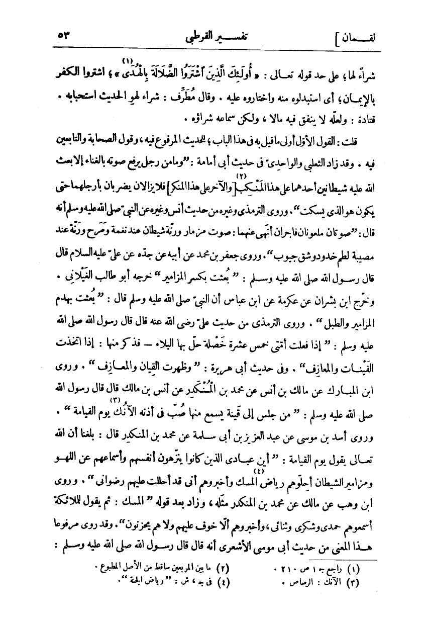 شِرَاءٌ لَهَا، عَلَى حَدِّ قَوْلُهُ تَعَالَى:" أُولئِكَ الَّذِينَ اشْتَرَوُا الضَّلالَةَ بِالْهُدى " «١» [البقرة: ١٦]، اشْتَرَوُا الْكُفْرَ بِالْإِيمَانِ، أَيِ اسْتَبْدَلُوهُ مِنْهُ وَاخْتَارُوهُ عَلَيْهِ. وَقَالَ مُطَرِّفٌ: شِرَاءُ لَهْوِ الْحَدِيثِ اسْتِحْبَابُهُ. قَتَادَةُ: وَلَعَلَّهُ لَا يُنْفِقُ فِيهِ مَالًا، وَلَكِنَّ سَمَاعَهُ شِرَاؤُهُ. قُلْتُ: الْقَوْلُ الْأَوَّلُ أَوْلَى مَا قِيلَ بِهِ فِي هَذَا الْبَابِ، لِلْحَدِيثِ الْمَرْفُوعِ فِيهِ، وَقَوْلُ الصَّحَابَةِ وَالتَّابِعِينَ فِيهِ. وَقَدْ زَادَ الثَّعْلَبِيُّ وَالْوَاحِدِيُّ فِي حَدِيثِ أَبِي أُمَامَةَ: (وَمَا مِنْ رَجُلٍ يَرْفَعُ صَوْتَهُ بِالْغِنَاءِ إِلَّا بَعَثَ اللَّهُ عَلَيْهِ شَيْطَانَيْنِ أَحَدُهُمَا عَلَى هَذَا الْمَنْكِبِ «٢» [والآخر على هذا المنكر] فَلَا يَزَالَانِ يَضْرِبَانِ بِأَرْجُلِهِمَا حَتَّى يَكُونَ هُوَ الَّذِي يَسْكُتُ). وَرَوَى التِّرْمِذِيُّ وَغَيْرُهُ مِنْ حَدِيثِ أَنَسٍ وَغَيْرُهُ عَنِ النَّبِيِّ صَلَّى اللَّهُ عَلَيْهِ وَسَلَّمَ أَنَّهُ قَالَ: (صَوْتَانِ مَلْعُونَانِ فَاجِرَانِ أَنْهَى عَنْهُمَا: صَوْتُ مِزْمَارٍ وَرَنَّةُ شَيْطَانٍ عِنْدَ نَغْمَةٍ وَمَرَحٍ وَرَنَّةٌ عِنْدَ مُصِيبَةٍ لَطْمُ خُدُودٍ وَشَقُّ جُيُوبٍ). وَرَوَى جَعْفَرُ بْنُ مُحَمَّدٍ عَنْ أَبِيهِ عَنْ جَدِّهِ عَنْ عَلِيٍّ عَلَيْهِ السَّلَامَ قَالَ قَالَ رَسُولُ اللَّهِ صَلَّى اللَّهُ عَلَيْهِ وَسَلَّمَ: (بُعِثْتُ بِكَسْرِ الْمَزَامِيرِ) خَرَّجَهُ أَبُو طَالِبٍ الْغَيْلَانِيُّ. وَخَرَّجَ ابْنُ بَشْرَانَ عَنْ عِكْرِمَةَ عَنِ ابْنِ عَبَّاسٍ أَنَّ النَّبِيَّ صَلَّى اللَّهُ عَلَيْهِ وَسَلَّمَ قَالَ: (بُعِثْتُ بِهَدْمِ الْمَزَامِيرِ وَالطَّبْلِ). وَرَوَى التِّرْمِذِيُّ مِنْ حَدِيثِ عَلِيٍّ رَضِيَ اللَّهُ عَنْهُ قَالَ قَالَ رَسُولُ اللَّهِ صَلَّى اللَّهُ عَلَيْهِ وَسَلَّمَ: (إِذَا فَعَلَتْ أُمَّتِي خَمْسَ عَشْرَةَ خَصْلَةً حَلَّ بِهَا الْبَلَاءُ- فَذَكَرَ مِنْهَا: إِذَا اتُّخِذَتِ الْقَيْنَاتُ وَالْمَعَازِفُ (. وَفِي حَدِيثِ أَبِي هُرَيْرَةَ:) وَظَهَرَتِ الْقِيَانُ وَالْمَعَازِفُ (. وَرَوَى ابْنُ الْمُبَارَكِ عَنْ مَالِكِ بْنِ أَنَسٍ عَنْ مُحَمَّدِ بْنِ الْمُنْكَدِرِ عَنْ أَنَسِ بْنِ مَالِكٍ قَالَ قَالَ رَسُولُ اللَّهِ صَلَّى اللَّهُ عَلَيْهِ وَسَلَّمَ: (مَنْ جَلَسَ إِلَى قَيْنَةٍ يَسْمَعُ مِنْهَا صُبَّ فِي أُذُنِهِ الْآنُكُ «٣» يَوْمَ الْقِيَامَةِ). وَرَوَى أَسَدُ بْنُ مُوسَى عَنْ عَبْدِ الْعَزِيزِ بْنِ أَبِي سَلَمَةَ عَنْ مُحَمَّدِ بْنِ الْمُنْكَدِرِ قَالَ: بَلَغَنَا أَنَّ اللَّهَ تَعَالَى يَقُولُ يَوْمَ الْقِيَامَةِ: (أَيْنَ عِبَادِي الَّذِينَ كَانُوا يُنَزِّهُونَ أَنْفُسَهُمْ وَأَسْمَاعَهُمْ عَنِ اللَّهْوِ وَمَزَامِيرِ الشَّيْطَانِ أَحِلُّوهُمْ رِيَاضَ «٤» الْمِسْكِ وَأَخْبِرُوهُمْ أَنِّي قَدْ أَحْلَلْتُ عَلَيْهِمْ رِضْوَانِي). وَرَوَى ابْنُ وَهْبٍ عَنْ مَالِكٍ عَنْ مُحَمَّدِ بْنِ الْمُنْكَدِرِ مِثْلَهَ، وَزَادَ بَعْدَ قَوْلِهِ (الْمِسْكِ: ثُمَّ يَقُولُ لِلْمَلَائِكَةِ أَسْمِعُوهُمْ حَمْدِي وَشُكْرِي وَثَنَائِي، وَأَخْبِرُوهُمْ أَلَّا خَوْفٌ عَلَيْهِمْ وَلَا هُمْ يَحْزَنُونَ). وَقَدْ رُوِيَ مَرْفُوعًا هَذَا الْمَعْنَى مِنْ حَدِيثِ أَبِي مُوسَى الْأَشْعَرِيِّ أَنَّهُ قَالَ قَالَ رَسُولُ اللَّهِ صَلَّى اللَّهُ عَلَيْهِ وَسَلَّمَ: