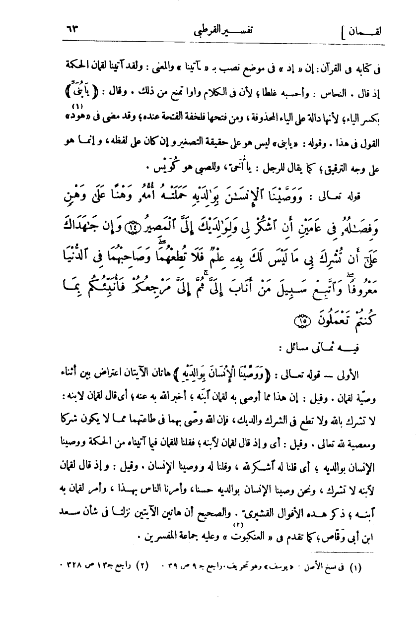 فِيهِ ثَمَانِي مَسَائِلَ: الْأُولَى- قَوْلُهُ تَعَالَى: (وَوَصَّيْنَا الْإِنْسانَ بِوالِدَيْهِ) هَاتَانِ الْآيَتَانِ اعْتِرَاضٌ بَيِّنٌ أَثْنَاءَ وَصِيَّةِ لُقْمَانَ. وَقِيلَ: إِنَّ هَذَا مِمَّا أَوْصَى بِهِ لُقْمَانُ ابْنَهُ، أَخْبَرَ اللَّهُ بِهِ عَنْهُ، أَيْ قَالَ لُقْمَانُ لِابْنِهِ: لَا تُشْرِكْ بِاللَّهِ وَلَا تُطِعْ فِي الشِّرْكِ وَالِدَيْكَ، فَإِنَّ اللَّهَ وَصَّى بِهِمَا فِي طَاعَتِهِمَا مِمَّا لَا يَكُونُ شِرْكًا وَمَعْصِيَةً لِلَّهِ تَعَالَى. وَقِيلَ: أَيْ وَإِذْ قَالَ لُقْمَانُ لِابْنِهِ، فَقُلْنَا لِلُقْمَانَ فِيمَا آتَيْنَاهُ مِنَ الْحِكْمَةِ وَوَصَّيْنَا الْإِنْسَانَ بِوَالِدَيْهِ، أَيْ قُلْنَا لَهُ اشْكُرْ لِلَّهِ، وَقُلْنَا لَهُ وَوَصَّيْنَا الْإِنْسَانَ. وَقِيلَ: وَإِذْ قَالَ لُقْمَانُ لِابْنِهِ، لَا تُشْرِكْ، وَنَحْنُ وَصَّيْنَا الْإِنْسَانَ بِوَالِدَيْهِ حُسْنًا، وَأَمَرْنَا النَّاسَ بِهَذَا، وَأَمَرَ لُقْمَانُ بِهِ ابْنَهُ، ذَكَرَ هَذِهِ الْأَقْوَالَ الْقُشَيْرِيُّ. وَالصَّحِيحُ أَنَّ هَاتَيْنِ الْآيَتَيْنِ نَزَلَتَا فِي شَأْنِ سَعْدِ ابن أَبِي وَقَّاصٍ، كَمَا تَقَدَّمَ فِي" الْعَنْكَبُوتِ" «٢» وَعَلَيْهِ جماعة المفسرين.