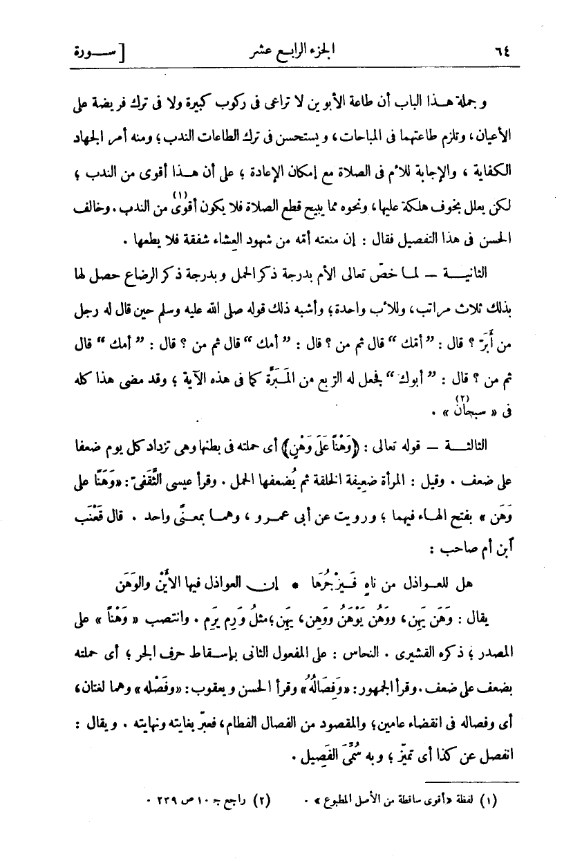 وَجُمْلَةُ هَذَا الْبَابِ أَنَّ طَاعَةَ الْأَبَوَيْنِ لَا تُرَاعَى فِي رُكُوبِ كَبِيرَةٍ وَلَا فِي تَرْكِ فَرِيضَةٍ عَلَى الْأَعْيَانِ، وَتَلْزَمُ طَاعَتُهُمَا فِي الْمُبَاحَاتِ، وَيُسْتَحْسَنُ فِي تَرْكِ الطَّاعَاتِ النَّدْبِ، وَمِنْهُ أَمْرُ الْجِهَادِ الْكِفَايَةِ، وَالْإِجَابَةُ لِلْأُمِّ فِي الصَّلَاةِ مَعَ إِمْكَانِ الْإِعَادَةِ، عَلَى أَنَّ هَذَا أَقْوَى مِنَ النَّدْبِ، لَكِنْ يُعَلَّلُ بِخَوْفِ هَلَكَةٍ عَلَيْهَا، وَنَحْوِهِ مِمَّا يُبِيحُ قَطْعَ الصَّلَاةِ فَلَا يَكُونُ أَقْوَى «١» مِنَ النَّدْبِ. وَخَالَفَ الْحَسَنُ فِي هَذَا التَّفْصِيلِ فَقَالَ: إِنْ مَنَعَتْهُ أُمُّهُ مِنْ شُهُودِ الْعِشَاءِ شَفَقَةً فَلَا يُطِعْهَا. الثَّانِيَةُ- لَمَّا خَصَّ تَعَالَى الْأُمَّ بِدَرَجَةِ ذِكْرِ الْحَمْلِ وَبِدَرَجَةِ ذِكْرِ الرَّضَاعِ حَصَلَ لَهَا بِذَلِكَ ثَلَاثُ مَرَاتِبَ، وَلِلْأَبِ وَاحِدَةٌ، وَأَشْبَهَ ذَلِكَ قَوْلُهُ صَلَّى اللَّهُ عَلَيْهِ وَسَلَّمَ حِينَ قَالَ لَهُ رَجُلٌ مَنْ أَبِرُّ؟ قَالَ: (أُمُّكَ) قَالَ ثُمَّ مَنْ؟ قَالَ: (أُمُّكَ) قَالَ ثُمَّ مَنْ؟ قَالَ: (أُمُّكَ) قَالَ ثُمَّ مَنْ؟ قَالَ: (أَبُوكَ) فَجَعَلَ لَهُ الرُّبُعَ مِنَ الْمَبَرَّةِ كَمَا فِي هَذِهِ الْآيَةِ، وَقَدْ مَضَى هَذَا كله في" سبحان" «٢». الثالثة- قوله تعالى: (وَهْناً عَلى وَهْنٍ) أَيْ حَمَلَتْهُ فِي بَطْنِهَا وَهِيَ تَزْدَادُ كُلَّ يَوْمٍ ضَعْفًا عَلَى ضَعْفٍ. وَقِيلَ: الْمَرْأَةُ ضَعِيفَةُ الْخِلْقَةِ ثُمَّ يُضْعِفُهَا الْحَمْلُ. وَقَرَأَ عِيسَى الثَّقَفِيُّ:" وَهْناً عَلى وَهْنٍ" بِفَتْحِ الْهَاءِ فِيهِمَا، وَرُوِيَتْ عَنْ أَبِي عَمْرٍو، وَهُمَا بمعنى واحد. قال قعنب ابن أُمِّ صَاحِبٍ: