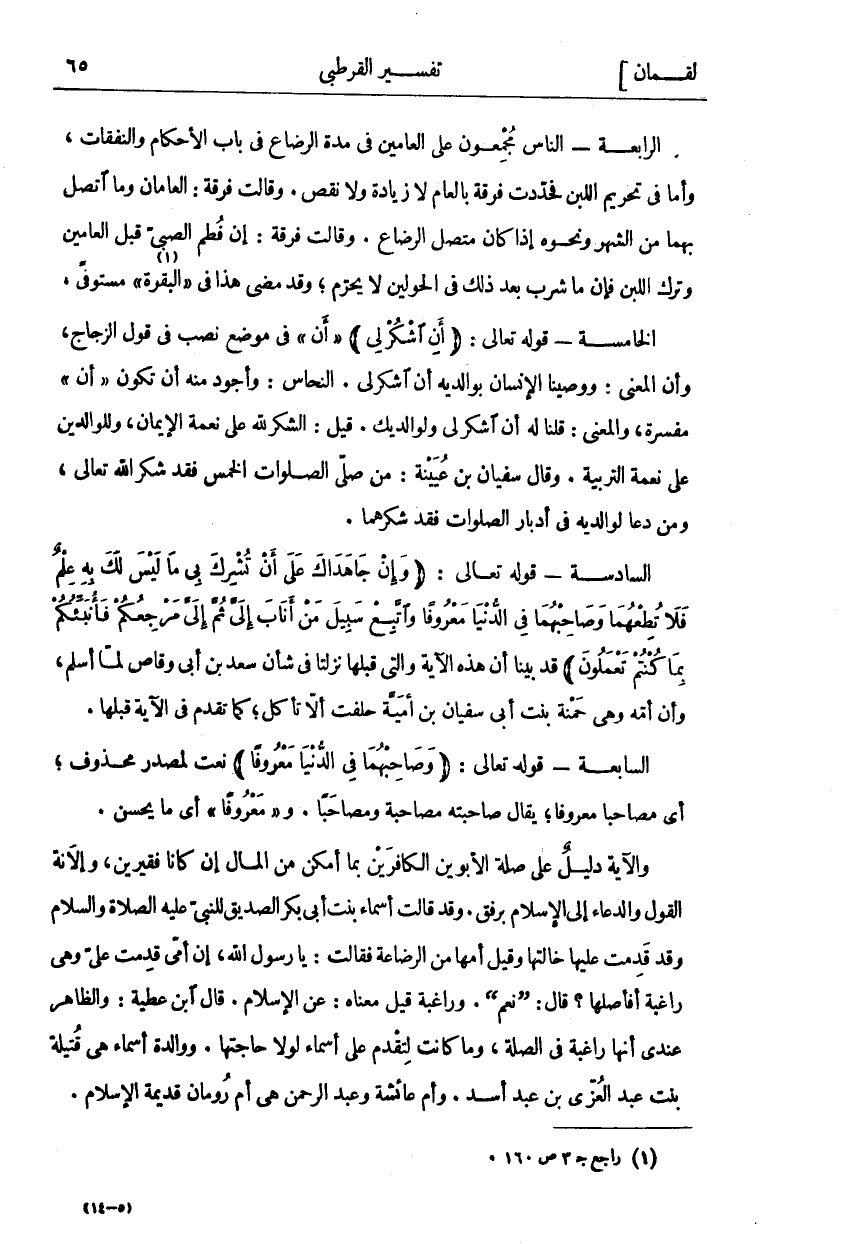 الرَّابِعَةُ- النَّاسُ مُجْمِعُونَ عَلَى الْعَامَيْنِ فِي مُدَّةِ الرَّضَاعِ فِي بَابِ الْأَحْكَامِ وَالنَّفَقَاتِ، وَأَمَّا فِي تَحْرِيمِ اللَّبَنِ فَحَدَّدَتْ فِرْقَةٌ بِالْعَامِ لَا زِيَادَةَ وَلَا نَقْصَ. وَقَالَتْ فِرْقَةٌ: الْعَامَانِ وَمَا اتَّصَلَ بِهِمَا مِنَ الشَّهْرِ وَنَحْوِهِ إِذَا كَانَ مُتَّصِلَ الرَّضَاعِ. وَقَالَتْ فِرْقَةٌ: إِنْ فُطِمَ الصَّبِيُّ قَبْلَ الْعَامَيْنِ وَتَرَكَ اللَّبَنَ فَإِنَّ مَا شُرِبَ بَعْدَ ذلك في الحو لين لَا يُحَرِّمُ، وَقَدْ مَضَى هَذَا فِي" الْبَقَرَةِ" «١» مُسْتَوْفًى. الْخَامِسَةُ- قَوْلُهُ تَعَالَى: (أَنِ اشْكُرْ لِي) " أَنِ" فِي مَوْضِعِ نَصْبٍ فِي قَوْلِ الزَّجَّاجِ، وَأَنَّ الْمَعْنَى: وَوَصَّيْنَا الْإِنْسَانَ بِوَالِدَيْهِ أَنِ اشْكُرْ لِي. النَّحَّاسُ: وَأَجْوَدُ مِنْهُ أَنْ تَكُونَ" أَنِ" مُفَسِّرَةً، وَالْمَعْنَى: قُلْنَا لَهُ أَنِ اشْكُرْ لِي وَلِوَالِدَيْكَ. قِيلَ: الشُّكْرُ لِلَّهِ عَلَى نِعْمَةِ الْإِيمَانِ، وَلِلْوَالِدَيْنِ عَلَى نِعْمَةِ التَّرْبِيَةِ. وَقَالَ سُفْيَانُ بْنُ عُيَيْنَةَ: مَنْ صَلَّى الصَّلَوَاتِ الْخَمْسَ فَقَدْ شَكَرَ اللَّهَ تَعَالَى، وَمَنْ دَعَا لِوَالِدَيْهِ فِي أَدْبَارِ الصَّلَوَاتِ فَقَدْ شَكَرَهُمَا. السَّادِسَةُ- قَوْلُهُ تَعَالَى: (وَإِنْ جاهَداكَ عَلى أَنْ تُشْرِكَ بِي ما لَيْسَ لَكَ بِهِ عِلْمٌ فَلا تُطِعْهُما وَصاحِبْهُما فِي الدُّنْيا مَعْرُوفاً وَاتَّبِعْ سَبِيلَ مَنْ أَنابَ إِلَيَّ ثُمَّ إِلَيَّ مَرْجِعُكُمْ فَأُنَبِّئُكُمْ بِما كُنْتُمْ تَعْمَلُونَ) قَدْ بَيَّنَّا أَنَّ هَذِهِ الْآيَةَ وَالَّتِي قَبْلَهَا نَزَلَتَا فِي شَأْنِ سَعْدِ بْنِ أَبِي وَقَّاصٍ لَمَّا أَسْلَمَ، وَأَنَّ أُمَّهُ وَهِيَ حَمْنَةُ بِنْتُ أَبِي سُفْيَانَ بْنِ أُمَيَّةَ حَلَفَتْ أَلَّا تَأْكُلَ، كَمَا تَقَدَّمَ فِي الْآيَةِ قَبْلَهَا. السَّابِعَةُ- قَوْلُهُ تَعَالَى: (وَصاحِبْهُما فِي الدُّنْيا مَعْرُوفاً) نَعْتٌ لِمَصْدَرٍ مَحْذُوفٍ، أَيْ مُصَاحِبًا مَعْرُوفًا، يُقَالُ صَاحَبْتُهُ مُصَاحَبَةً وَمُصَاحِبًا. وَ" مَعْرُوفاً" أَيْ مَا يَحْسُنُ. وَالْآيَةُ دَلِيلٌ عَلَى صِلَةِ الْأَبَوَيْنِ الْكَافِرَيْنِ بِمَا أَمْكَنَ مِنَ الْمَالِ إِنْ كَانَا فَقِيرَيْنِ، وَإِلَانَةِ الْقَوْلِ وَالدُّعَاءِ إِلَى الْإِسْلَامِ بِرِفْقٍ. وَقَدْ قَالَتْ أَسْمَاءُ بِنْتُ أَبِي بَكْرٍ الصِّدِّيقِ لِلنَّبِيِّ عَلَيْهِ الصَّلَاةُ والسلام وقد قدمت عليه خَالَتُهَا وَقِيلَ أُمُّهَا مِنَ الرَّضَاعَةِ فَقَالَتْ: يَا رَسُولَ اللَّهِ، إِنَّ أُمِّي قَدِمَتْ عَلَيَّ وَهِيَ رَاغِبَةٌ أَفَأَصِلُهَا؟ قَالَ: (نَعَمْ). وَرَاغِبَةٌ قِيلَ مَعْنَاهُ: عَنِ الْإِسْلَامِ. قَالَ ابْنُ عَطِيَّةَ: وَالظَّاهِرُ عِنْدِي أَنَّهَا رَاغِبَةٌ فِي الصِّلَةِ، وَمَا كَانَتْ لِتَقْدُمَ عَلَى أَسْمَاءَ لَوْلَا حَاجَتُهَا. وَوَالِدَةُ أَسْمَاءَ هِيَ قُتَيْلَةُ بِنْتُ عَبْدِ الْعُزَّى بْنِ عَبْدِ أَسَدٍ. وَأُمُّ عَائِشَةَ وَعَبْدِ الرَّحْمَنِ هِيَ أُمُّ رُومَانَ قديمة الإسلام.