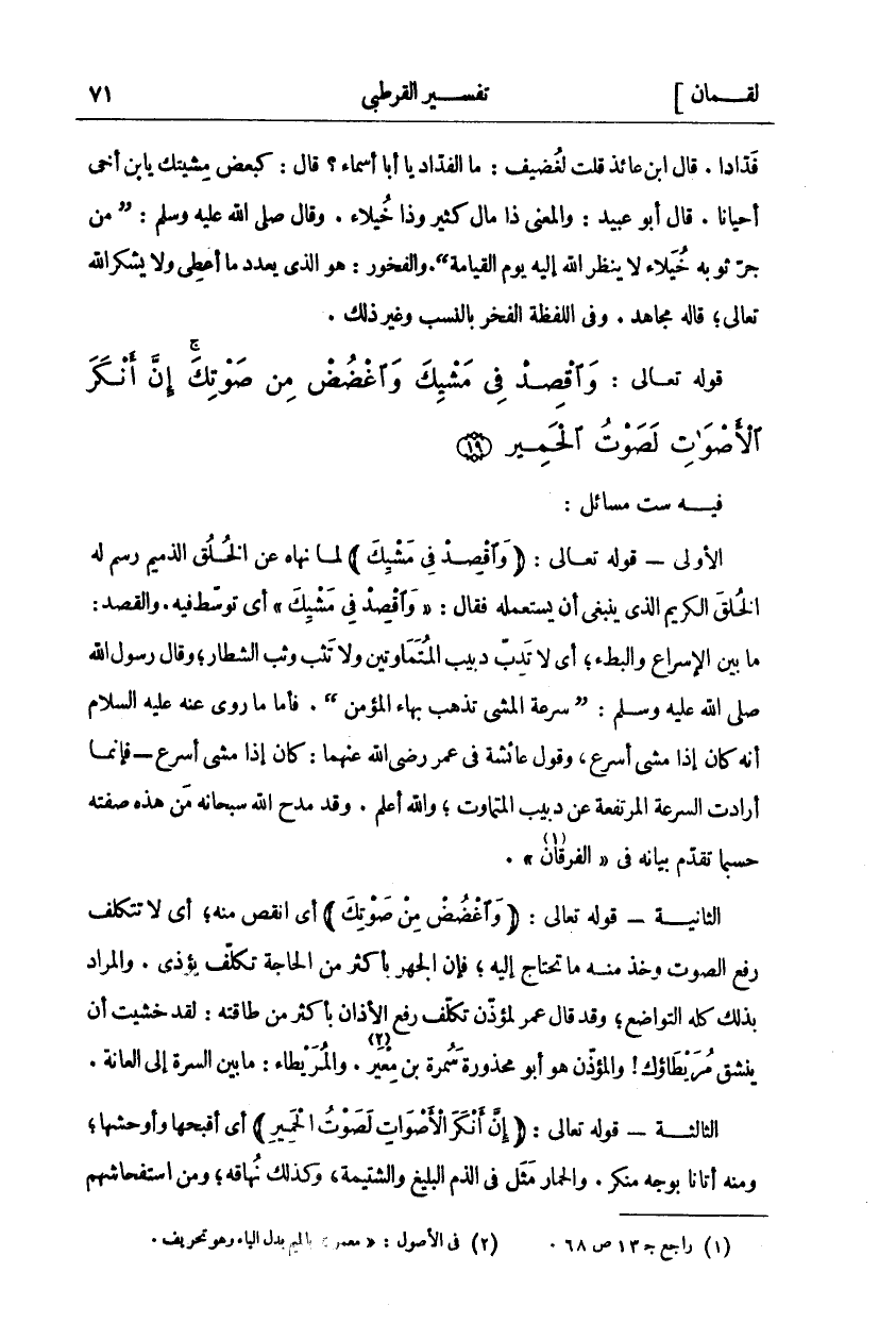 فِيهِ سِتُّ مَسَائِلَ: الْأُولَى- قَوْلُهُ تَعَالَى: (وَاقْصِدْ فِي مَشْيِكَ) لَمَّا نَهَاهُ عَنِ الْخُلُقِ الذَّمِيمِ رَسَمَ لَهُ الْخُلُقَ الْكَرِيمَ الَّذِي يَنْبَغِي أَنْ يَسْتَعْمِلَهُ فَقَالَ:" وَاقْصِدْ فِي مَشْيِكَ" أَيْ تَوَسَّطْ فِيهِ. وَالْقَصْدُ: مَا بَيْنَ الْإِسْرَاعِ وَالْبُطْءِ، أَيْ لَا تَدِبَّ دَبِيبَ الْمُتَمَاوِتِينَ وَلَا تَثِبْ وَثْبَ الشُّطَّارِ، وَقَالَ رَسُولُ اللَّهِ صَلَّى اللَّهُ عَلَيْهِ وَسَلَّمَ: (سُرْعَةُ الْمَشْيِ تُذْهِبُ بَهَاءَ الْمُؤْمِنِ). فَأَمَّا مَا رُوِيَ عَنْهُ عَلَيْهِ السَّلَامُ أَنَّهُ كَانَ إِذَا مَشَى أَسْرَعَ، وَقَوْلُ عَائِشَةَ فِي عُمَرَ رَضِيَ اللَّهُ عَنْهُمَا: كَانَ إِذَا مَشَى أَسْرَعَ- فَإِنَّمَا أَرَادَتِ السُّرْعَةَ الْمُرْتَفِعَةَ عَنْ دَبِيبِ الْمُتَمَاوِتِ، وَاللَّهُ أَعْلَمُ. وَقَدْ مَدَحَ اللَّهُ سُبْحَانَهُ مَنْ هَذِهِ صِفَتُهُ حَسْبَمَا تقدم بيانه في" الفرقان" «١». الثانية- قوله تعالى: (وَاغْضُضْ مِنْ صَوْتِكَ) أَيِ انْقُصْ مِنْهُ، أَيْ لَا تَتَكَلَّفْ رَفْعَ الصَّوْتِ وَخُذْ مِنْهُ مَا تَحْتَاجُ إِلَيْهِ، فَإِنَّ الْجَهْرَ بِأَكْثَرَ مِنَ الْحَاجَةِ تَكَلُّفٌ يُؤْذِي. وَالْمُرَادُ بِذَلِكَ كُلِّهِ التَّوَاضُعُ، وَقَدْ قَالَ عُمَرُ لِمُؤَذِّنٍ تَكَلَّفَ رَفْعَ الْأَذَانِ بِأَكْثَرَ مِنْ طَاقَتِهِ: لَقَدْ خَشِيتُ أَنْ يَنْشَقَّ مُرَيْطَاؤُكَ! وَالْمُؤَذِّنُ هُوَ أَبُو مَحْذُورَةَ سَمُرَةُ بْنُ مِعْيَرٍ «٢». وَالْمُرَيْطَاءُ: مَا بَيْنَ السُّرَّةِ إِلَى الْعَانَةِ. الثَّالِثَةُ- قوله تعالى: (إِنَّ أَنْكَرَ الْأَصْواتِ لَصَوْتُ الْحَمِيرِ) أَيْ أَقْبَحَهَا وَأَوْحَشَهَا، وَمِنْهُ أَتَانَا بِوَجْهٍ مُنْكَرٍ. وَالْحِمَارُ مَثَلٌ فِي الذَّمِّ الْبَلِيغِ وَالشَّتِيمَةِ، وَكَذَلِكَ نُهَاقُهُ، وَمِنِ استفحاشهم