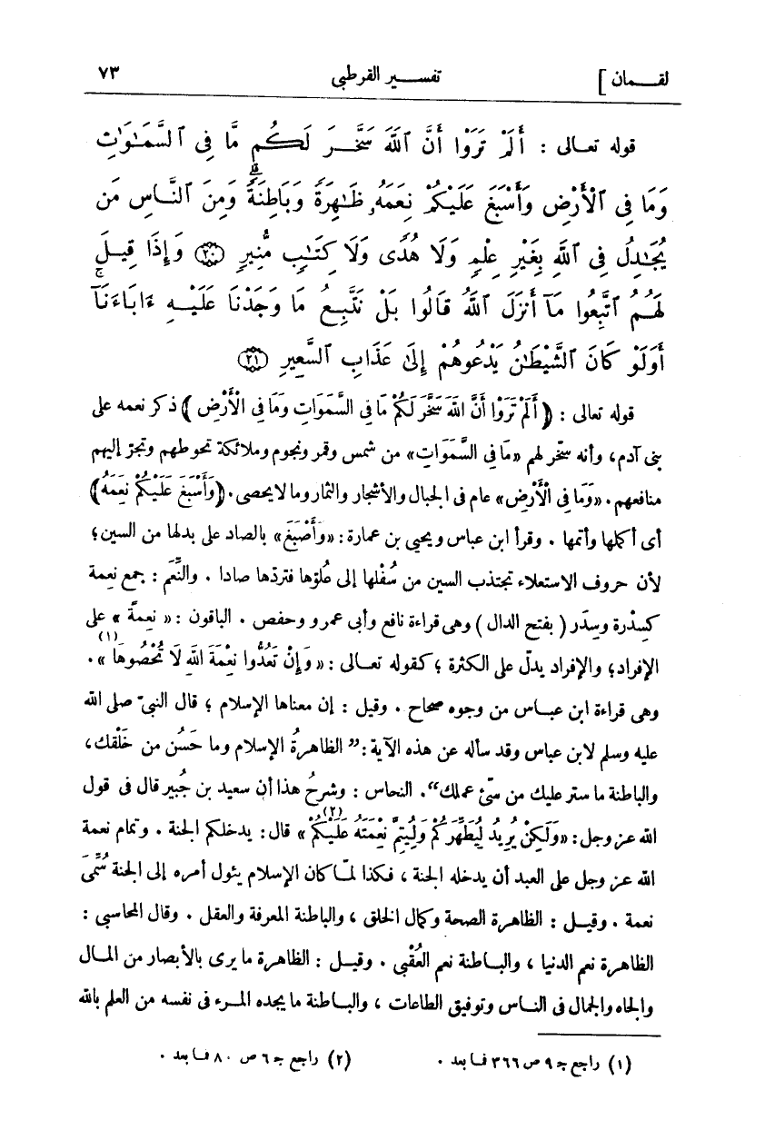 أَلَمْ تَرَوْا أَنَّ اللَّهَ سَخَّرَ لَكُمْ مَا فِي السَّماواتِ وَما فِي الْأَرْضِ وَأَسْبَغَ عَلَيْكُمْ نِعَمَهُ ظاهِرَةً وَباطِنَةً وَمِنَ النَّاسِ مَنْ يُجادِلُ فِي اللَّهِ بِغَيْرِ عِلْمٍ وَلا هُدىً وَلا كِتابٍ مُنِيرٍ (٢٠) وَإِذا قِيلَ لَهُمُ اتَّبِعُوا مَا أَنْزَلَ اللَّهُ قالُوا بَلْ نَتَّبِعُ مَا وَجَدْنا عَلَيْهِ آباءَنا أَوَلَوْ كانَ الشَّيْطانُ يَدْعُوهُمْ إِلى عَذابِ السَّعِيرِ (٢١)