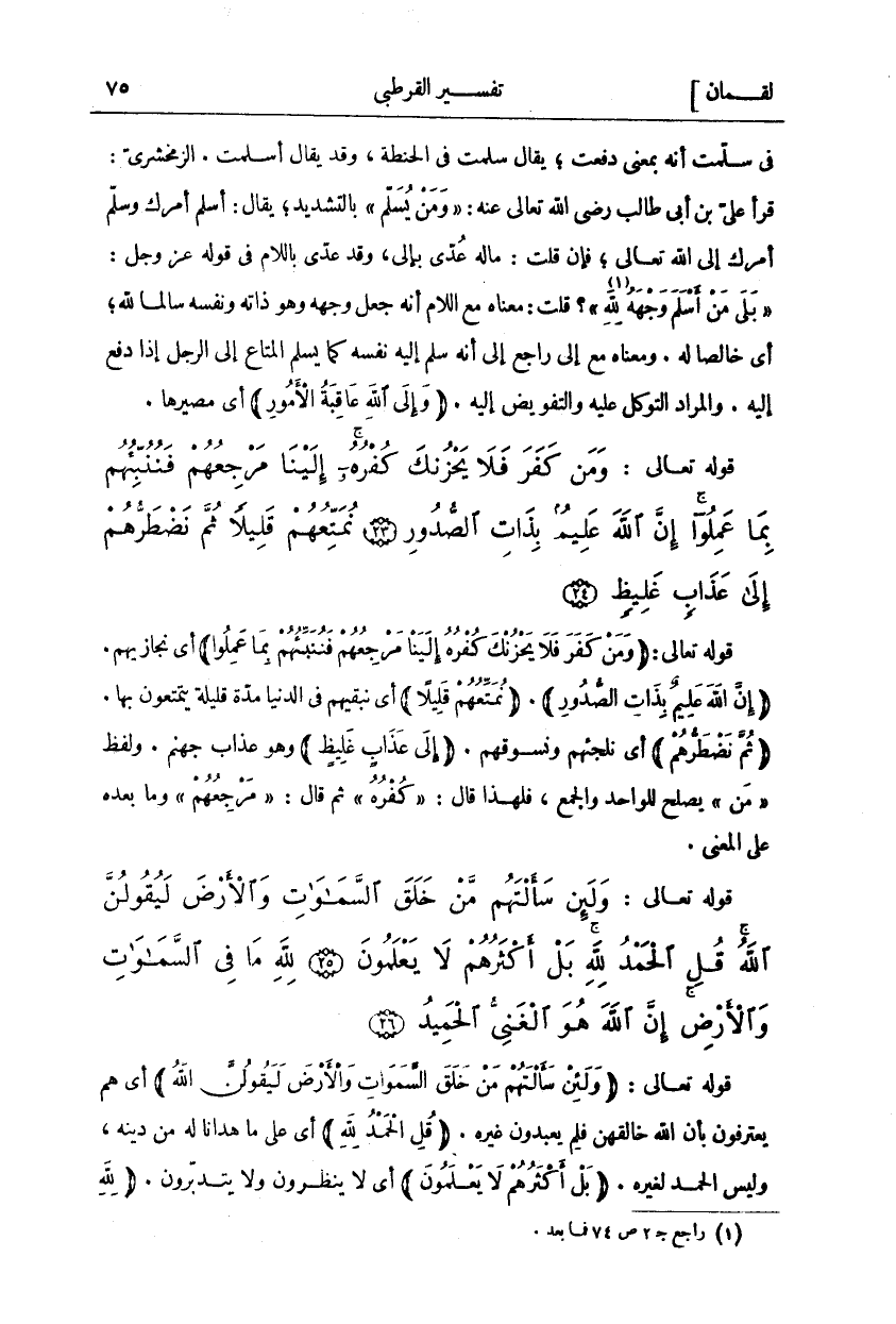 وَلَئِنْ سَأَلْتَهُمْ مَنْ خَلَقَ السَّماواتِ وَالْأَرْضَ لَيَقُولُنَّ اللَّهُ قُلِ الْحَمْدُ لِلَّهِ بَلْ أَكْثَرُهُمْ لَا يَعْلَمُونَ (٢٥) لِلَّهِ مَا فِي السَّماواتِ وَالْأَرْضِ إِنَّ اللَّهَ هُوَ الْغَنِيُّ الْحَمِيدُ (٢٦)
