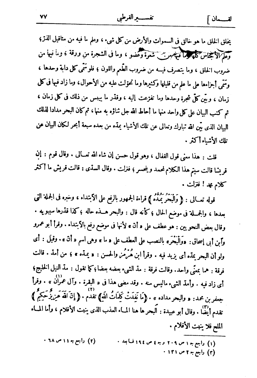 يَخْلُقَ الْخَلْقَ مَا هُوَ خَالِقٌ فِي السَّمَاوَاتِ والأرض من كل شي، وَعَلِمَ مَا فِيهِ مِنْ مَثَاقِيلَ الذَّرِّ، وَعَلِمَ الْأَجْنَاسَ كُلَّهَا وَمَا فِيهَا مِنْ شَعْرَةٍ وَعُضْوٍ، وَمَا فِي الشَّجَرَةِ مِنْ وَرَقَةٍ، وَمَا فِيهَا مِنْ ضُرُوبِ الْخَلْقِ، وَمَا يَتَصَرَّفُ فِيهِ مِنْ ضُرُوبِ الطَّعْمِ وَاللَّوْنِ، فَلَوْ سَمَّى كُلَّ دَابَّةٍ وَحْدَّهَا، وَسَمَّى أَجْزَاءَهَا عَلَى مَا عَلِمَ مِنْ قَلِيلِهَا وَكَثِيرِهَا وَمَا تَحَوَّلَتْ عَلَيْهِ مِنَ الْأَحْوَالِ، وَمَا زَادَ فِيهَا فِي كُلِّ زَمَانٍ، وَبَيَّنَ كُلَّ شَجَرَةٍ وَحْدَّهَا وَمَا تَفَرَّعَتْ إِلَيْهِ، وَقَدْرَ مَا يَيْبَسُ مِنْ ذَلِكَ فِي كُلِّ زَمَانٍ، ثُمَّ كُتِبَ الْبَيَانُ عَلَى كُلِّ وَاحِدٍ مِنْهَا مَا أَحَاطَ اللَّهُ جَلَّ ثَنَاؤُهُ بِهِ مِنْهَا، ثُمَّ كَانَ الْبَحْرُ مِدَادًا لِذَلِكَ الْبَيَانِ الَّذِي بَيَّنَ اللَّهُ تَبَارَكَ وَتَعَالَى عَنْ تِلْكَ الْأَشْيَاءِ يَمُدُّهُ مِنْ بَعْدِهِ سَبْعَةُ أَبْحُرٍ لَكَانَ الْبَيَانُ عَنْ تِلْكَ الْأَشْيَاءِ أَكْثَرَ. قُلْتُ: هَذَا مَعْنَى قَوْلِ الْقَفَّالِ، وَهُوَ قَوْلٌ حَسَنٌ إِنْ شَاءَ اللَّهُ تَعَالَى. وَقَالَ قَوْمٌ: إِنَّ قُرَيْشًا قَالَتْ سَيَتِمُّ هَذَا الْكَلَامُ لِمُحَمَّدٍ وَيَنْحَسِرُ، فَنَزَلَتْ وَقَالَ السُّدِّيُّ: قَالَتْ قُرَيْشُ مَا أَكْثَرَ كَلَامَ مُحَمَّدٍ! فَنَزَلَتْ. قَوْلُهُ تَعَالَى:" وَالْبَحْرُ يَمُدُّهُ" قِرَاءَةُ الْجُمْهُورِ بِالرَّفْعِ عَلَى الِابْتِدَاءِ، وَخَبَرُهُ فِي الْجُمْلَةِ الَّتِي بَعْدَهَا، وَالْجُمْلَةُ فِي مَوْضِعِ الْحَالِ، كَأَنَّهُ قَالَ: وَالْبَحْرُ هَذِهِ حَالُهُ، كَذَا قَدَّرَهَا سِيبَوَيْهِ. وَقَالَ بَعْضُ النَّحْوِيِّينَ: هُوَ عَطْفٌ عَلَى" أَنَّ" لِأَنَّهَا فِي مَوْضِعِ رَفْعٍ بِالِابْتِدَاءِ. وَقَرَأَ أَبُو عَمْرٍو وَابْنُ أَبِي إِسْحَاقَ:" وَالْبَحْرَ" بِالنَّصْبِ عَلَى الْعَطْفِ عَلَى" مَا" وَهِيَ اسْمُ" أَنَّ". وَقِيلَ: أَيْ وَلَوْ أَنَّ الْبَحْرَ يَمُدُّهُ أَيْ يَزِيدُ فِيهِ. وَقَرَأَ ابْنُ هُرْمُزَ وَالْحَسَنُ:" يَمُدُّهُ"، مِنْ أَمَدَّ. قَالَتْ فِرْقَةٌ: هُمَا بِمَعْنًى وَاحِدٍ. وَقَالَتْ فِرْقَةٌ: مَدَّ الشَّيْءُ بَعْضَهُ بَعْضًا، كَمَا تَقُولُ: مَدَّ النِّيلُ الْخَلِيجَ، أَيْ زَادَ فِيهِ. وَأَمَدَّ الشَّيْءَ مَا لَيْسَ مِنْهُ. وَقَدْ مَضَى هَذَا فِي" الْبَقَرَةِ. وَآلِ عِمْرَانَ" «١». وَقَرَأَ جَعْفَرُ بْنُ مُحَمَّدٍ:" وَالْبَحْرُ مِدَادُهُ"." مَا نَفِدَتْ كَلِماتُ اللَّهِ" تَقَدَّمَ «٢». (إِنَّ اللَّهَ عَزِيزٌ حَكِيمٌ) تَقَدَّمَ أَيْضًا «٣». وَقَالَ أبو عبيدة: البحر ها هنا الْمَاءُ الْعَذْبُ الَّذِي يُنْبِتُ الْأَقْلَامَ، وَأَمَّا الْمَاءُ الملح فلا ينبت الأقلام.