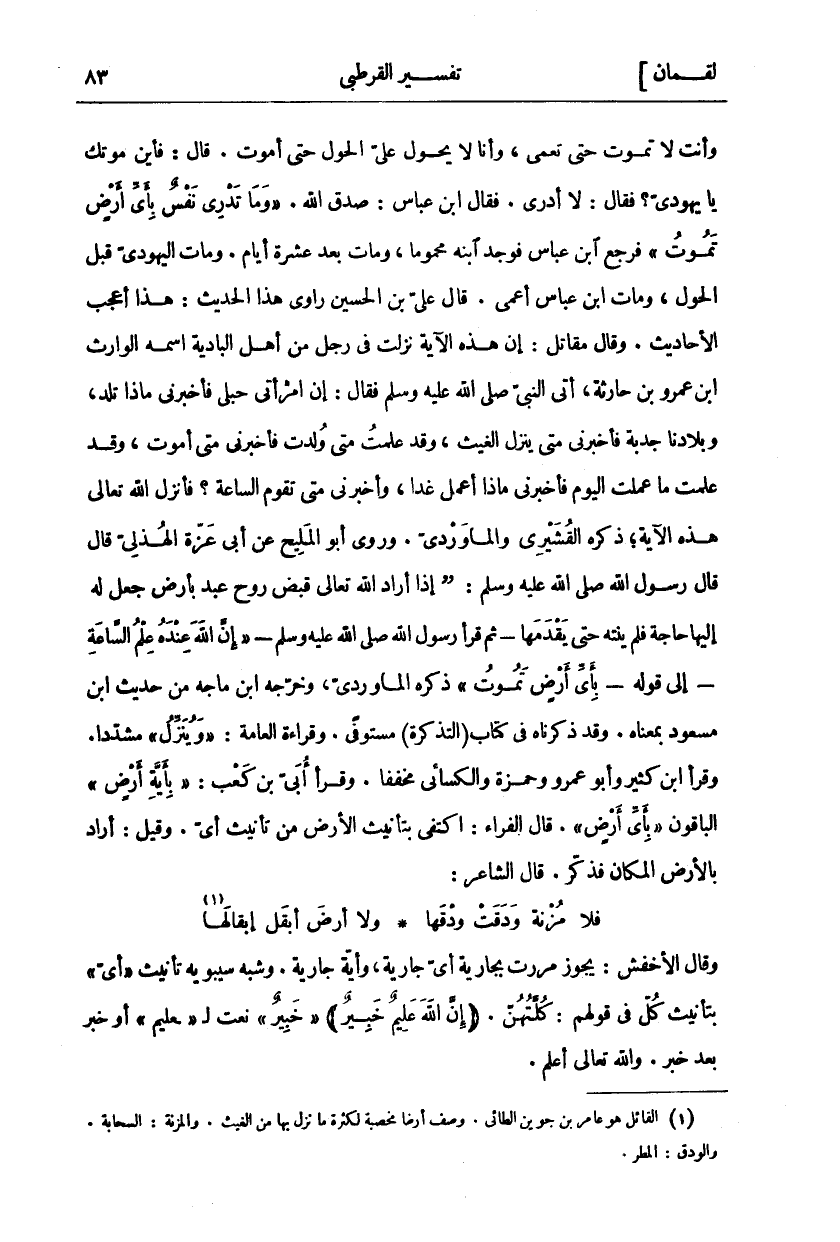 وَأَنْتَ لَا تَمُوتُ حَتَّى تَعْمَى، وَأَنَا لَا يَحُولُ عَلَيَّ الْحَوْلُ حَتَّى أَمُوتَ. قَالَ: فَأَيْنَ مَوْتُكَ يَا يَهُودِيُّ؟ فَقَالَ: لَا أَدْرِي. فَقَالَ ابْنُ عَبَّاسٍ: صَدَقَ اللَّهُ." وَما تَدْرِي نَفْسٌ بِأَيِّ أَرْضٍ تَمُوتُ" فَرَجَعَ ابْنُ عَبَّاسٍ فَوَجَدَ ابْنَهُ مَحْمُومًا، وَمَاتَ بَعْدَ عَشَرَةِ أَيَّامٍ. وَمَاتَ الْيَهُودِيُّ قَبْلَ الْحَوْلِ، وَمَاتَ ابْنُ عَبَّاسٍ أَعْمَى. قَالَ عَلِيُّ بْنُ الْحُسَيْنِ رَاوِي هَذَا الْحَدِيثِ: هَذَا أَعْجَبُ الْأَحَادِيثِ. وَقَالَ مُقَاتِلٌ: إِنَّ هَذِهِ الْآيَةَ نَزَلَتْ فِي رَجُلٍ مِنْ أَهْلِ الْبَادِيَةِ اسمه الوارث ابن عَمْرِو بْنِ حَارِثَةَ، أَتَى النَّبِيَّ صَلَّى اللَّهُ عَلَيْهِ وَسَلَّمَ فَقَالَ: إِنَّ امْرَأَتِي حُبْلَى فَأَخْبِرْنِي مَاذَا تَلِدُ، وَبِلَادَنَا جَدْبَةٌ فَأَخْبِرْنِي مَتَى يَنْزِلُ الْغَيْثُ، وَقَدْ عَلِمْتُ مَتَى وُلِدْتُ فَأَخْبِرْنِي مَتَى أَمُوتُ، وَقَدْ عَلِمْتُ مَا عَمِلْتُ الْيَوْمَ فَأَخْبِرْنِي مَاذَا أَعْمَلُ غَدًا، وَأَخْبِرْنِي مَتَى تَقُومُ السَّاعَةُ؟ فَأَنْزَلَ اللَّهُ تَعَالَى هَذِهِ الْآيَةَ، ذَكَرَهُ الْقُشَيْرِيُّ وَالْمَاوَرْدِيُّ. وَرَوَى أَبُو الْمَلِيحِ عَنْ أَبِي عَزَّةَ الْهُذَلِيِّ قَالَ قَالَ رَسُولُ صَلَّى اللَّهُ عَلَيْهِ وَسَلَّمَ: (إِذَا أَرَادَ اللَّهُ تَعَالَى قَبْضَ رُوحِ عَبْدٍ بِأَرْضٍ جَعَلَ لَهُ إِلَيْهَا حَاجَةً فَلَمْ يَنْتَهِ حَتَّى يَقْدُمَهَا- ثُمَّ قَرَأَ رَسُولُ اللَّهِ صَلَّى اللَّهُ عَلَيْهِ وَسَلَّمَ-" إِنَّ اللَّهَ عِنْدَهُ عِلْمُ السَّاعَةِ"- إِلَى قَوْلِهِ-" بِأَيِّ أَرْضٍ تَمُوتُ" (ذَكَرَهُ الْمَاوَرْدِيُّ، وَخَرَّجَهُ ابْنُ مَاجَهْ مِنْ حَدِيثِ ابْنِ مَسْعُودٍ بِمَعْنَاهُ. وَقَدْ ذَكَرْنَاهُ فِي كِتَابِ (التَّذْكِرَةِ) مُسْتَوْفًى. وَقِرَاءَةُ الْعَامَّةِ:" وَيُنَزِّلُ" مُشَدَّدًا. وَقَرَأَ ابْنُ كَثِيرٍ وَأَبُو عَمْرٍو وَحَمْزَةُ وَالْكِسَائِيُّ مُخَفَّفًا. وَقَرَأَ أُبَيُّ بْنُ كَعْبٍ:" بِأَيَّةِ أَرْضٍ" الْبَاقُونَ" بِأَيِّ أَرْضٍ". قَالَ الْفَرَّاءُ: اكْتَفَى بِتَأْنِيثِ الْأَرْضِ مِنْ تَأْنِيثِ أَيٍّ. وَقِيلَ: أَرَادَ بِالْأَرْضِ الْمَكَانَ فذكر. قال الشَّاعِرِ: