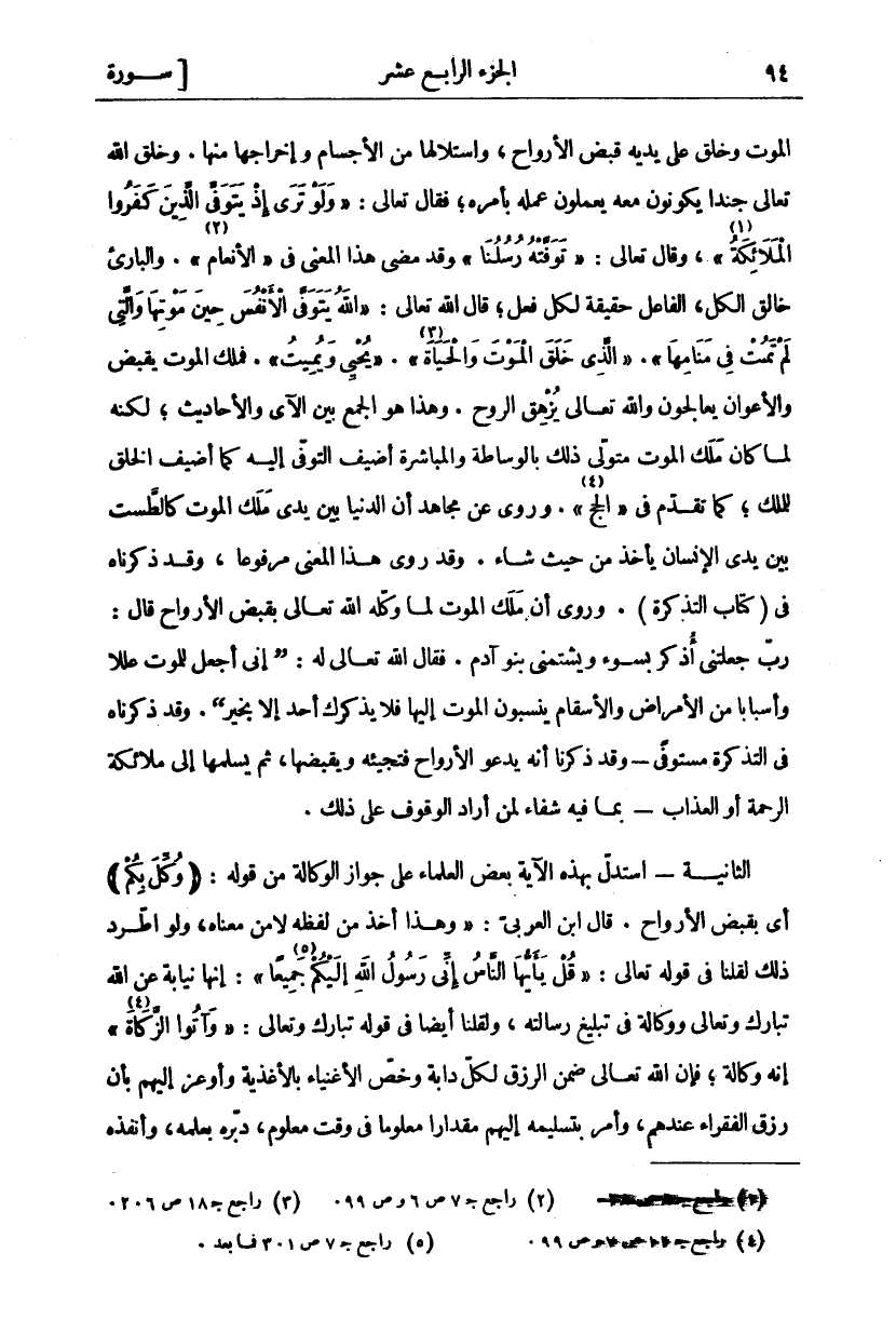الْمَوْتِ وَخَلَقَ عَلَى يَدَيْهِ قَبْضَ الْأَرْوَاحِ، وَاسْتِلَالَهَا مِنَ الْأَجْسَامِ وَإِخْرَاجَهَا مِنْهَا. وَخَلَقَ اللَّهُ تَعَالَى جُنْدًا يَكُونُونَ مَعَهُ يَعْمَلُونَ عَمَلَهُ بِأَمْرِهِ، فَقَالَ تَعَالَى:" وَلَوْ تَرى إِذْ يَتَوَفَّى الَّذِينَ كَفَرُوا الْمَلائِكَةُ" «١» [الأنفال: ٥٠]، وقال تعالى:" تَوَفَّتْهُ رُسُلُنا" [الانعام: ٦١] وَقَدْ مَضَى هَذَا الْمَعْنَى فِي" الْأَنْعَامِ" «٢». وَالْبَارِئُ خَالِقُ الْكُلِّ، الْفَاعِلُ حَقِيقَةً لِكُلِّ فِعْلٍ، قَالَ اللَّهُ تَعَالَى:" اللَّهُ يَتَوَفَّى الْأَنْفُسَ حِينَ مَوْتِها وَالَّتِي لَمْ تَمُتْ فِي مَنامِها" [الزمر: ٤٢]." الذي خلق الموت والحياة" «٣» [الملك: ٢]." يُحيِي وَيُمِيتُ" [الأعراف: ١٥٨]. فَمَلَكُ الْمَوْتِ يَقْبِضُ وَالْأَعْوَانُ يُعَالِجُونَ وَاللَّهُ تَعَالَى يُزْهِقُ الرُّوحَ. وَهَذَا هُوَ الْجَمْعُ بَيْنَ الْآيِ وَالْأَحَادِيثِ، لَكِنَّهُ لَمَّا كَانَ مَلَكُ الْمَوْتِ مُتَوَلِّيَ ذَلِكَ بِالْوَسَاطَةِ وَالْمُبَاشَرَةِ أُضِيفَ التَّوَفِّي إِلَيْهِ كَمَا أُضِيفَ الْخَلْقُ لِلْمَلَكِ، كَمَا تَقَدَّمَ فِي" الْحَجِّ" «٤». وَرُوِيَ عَنْ مُجَاهِدٍ أَنَّ الدُّنْيَا بَيْنَ يَدَيْ مَلَكِ الْمَوْتِ كَالطَّسْتِ بَيْنَ يَدَيِ الْإِنْسَانِ يَأْخُذُ مِنْ حَيْثُ شَاءَ. وَقَدْ رُوِيَ هَذَا الْمَعْنَى مَرْفُوعًا، وَقَدْ ذَكَرْنَاهُ فِي (كِتَابِ التَّذْكِرَةِ). وَرُوِيَ أَنَّ مَلَكَ الْمَوْتِ لَمَّا وَكَّلَهُ اللَّهُ تَعَالَى بِقَبْضِ الْأَرْوَاحِ قَالَ: رَبِّ جَعَلْتِنِي أُذْكَرُ بِسُوءٍ وَيَشْتُمُنِي بَنُو آدَمَ. فَقَالَ اللَّهُ تَعَالَى لَهُ: (إِنِّي أَجْعَلُ لِلْمَوْتِ عِلَلًا وَأَسْبَابًا مِنَ الْأَمْرَاضِ وَالْأَسْقَامِ يَنْسُبُونَ الْمَوْتَ إِلَيْهَا فَلَا يَذْكُرُكَ أَحَدٌ إِلَّا بِخَيْرٍ). وَقَدْ ذَكَرْنَاهُ فِي التَّذْكِرَةِ مُسْتَوْفًى- وَقَدْ ذَكَرْنَا أَنَّهُ يَدْعُو الْأَرْوَاحَ فَتَجِيئُهُ وَيَقْبِضُهَا، ثُمَّ يُسَلِّمُهَا إِلَى مَلَائِكَةِ الرَّحْمَةِ أَوِ الْعَذَابِ- بِمَا فِيهِ شِفَاءٌ لِمَنْ أَرَادَ الْوُقُوفَ عَلَى ذَلِكَ. الثَّانِيَةُ- اسْتَدَلَّ بِهَذِهِ الْآيَةِ بَعْضُ الْعُلَمَاءِ عَلَى جَوَازِ الْوَكَالَةِ مِنْ قَوْلِهِ:" وُكِّلَ بِكُمْ" أَيْ بِقَبْضِ الْأَرْوَاحِ. قَالَ ابْنُ الْعَرَبِيِّ:" وَهَذَا أُخِذَ مِنْ لَفْظِهِ لَا مِنْ مَعْنَاهُ، وَلَوِ اطَّرَدَ ذَلِكَ لَقُلْنَا فِي قَوْلُهُ تَعَالَى:" قُلْ يَا أَيُّهَا النَّاسُ إِنِّي رَسُولُ اللَّهِ إِلَيْكُمْ «٥» جَمِيعاً" [الأعراف: ١٥٨]: إِنَّهَا نِيَابَةٌ عَنِ اللَّهِ تَبَارَكَ وَتَعَالَى وَوَكَالَةٌ فِي تَبْلِيغِ رِسَالَتِهِ، وَلَقُلْنَا أَيْضًا فِي قَوْلِهِ تبارك وتعالى:" وَآتُوا الزَّكاةَ" «٦» [النور: ٥٦] إِنَّهُ وَكَالَةٌ، فَإِنَّ اللَّهَ تَعَالَى ضَمِنَ الرِّزْقَ لِكُلِّ دَابَّةٍ وَخَصَّ الْأَغْنِيَاءَ بِالْأَغْذِيَةِ وَأَوْعَزَ إِلَيْهِمْ بِأَنَّ رِزْقَ الْفُقَرَاءِ عِنْدَهُمْ، وَأَمَرَ بِتَسْلِيمِهِ إِلَيْهِمْ مِقْدَارًا مَعْلُومًا فِي وَقْتٍ مَعْلُومٍ، دَبَّرَهُ بِعِلْمِهِ، وأنفذه