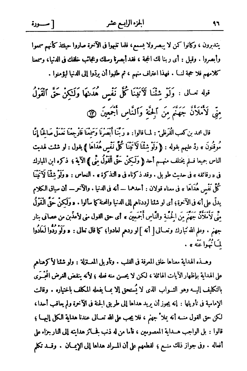 قَالَ مُحَمَّدُ بْنُ كَعْبٍ الْقُرَظِيُّ: لَمَّا قَالُوا:" رَبَّنا أَبْصَرْنا وَسَمِعْنا فَارْجِعْنا نَعْمَلْ صالِحاً إِنَّا مُوقِنُونَ" رَدَ عَلَيْهِمْ بِقَوْلِهِ:" وَلَوْ شِئْنا لَآتَيْنا كُلَّ نَفْسٍ هُداها" يَقُولُ: لَوْ شِئْتُ لَهَدَيْتُ النَّاسَ جَمِيعًا فَلَمْ يَخْتَلِفْ مِنْهُمْ أَحَدٌ" وَلكِنْ حَقَّ الْقَوْلُ مِنِّي" الْآيَةَ، ذَكَرَهُ ابْنُ الْمُبَارَكِ فِي (رَقَائِقِهِ) فِي حَدِيثٍ طَوِيلٍ. وَقَدْ ذَكَرْنَاهُ فِي التَّذْكِرَةِ. النَّحَّاسُ:" وَلَوْ شِئْنا لَآتَيْنا كُلَّ نَفْسٍ هُداها" فِي مَعْنَاهُ قَوْلَانِ: أَحَدُهُمَا: أَنَّهُ فِي الدُّنْيَا. وَالْآخَرُ: أَنَّ سِيَاقَ الْكَلَامِ يَدُلُّ عَلَى أَنَّهُ فِي الْآخِرَةِ، أَيْ لَوْ شِئْنَا لَرَدَدْنَاهُمْ إِلَى الدُّنْيَا وَالْمِحْنَةِ كَمَا سَأَلُوا" وَلكِنْ حَقَّ الْقَوْلُ مِنِّي لَأَمْلَأَنَّ جَهَنَّمَ مِنَ الْجِنَّةِ وَالنَّاسِ أَجْمَعِينَ" أَيْ حَقَّ الْقَوْلُ مِنِّي لَأُعَذِّبَنَّ مَنْ عَصَانِي بِنَارِ جَهَنَّمَ. وَعَلِمَ اللَّهُ تَبَارَكَ وَتَعَالَى [أَنَّهُ] لَوْ رَدَّهُمْ لَعَادُوا، كَمَا قَالَ تَعَالَى:" وَلَوْ رُدُّوا لَعادُوا لِما نُهُوا عَنْهُ" [الانعام: ٢٨]. وَهَذِهِ الْهِدَايَةُ مَعْنَاهَا خَلْقُ الْمَعْرِفَةِ فِي الْقَلْبِ. وَتَأْوِيلُ الْمُعْتَزِلَةِ: وَلَوْ شِئْنَا لَأَكْرَهْنَاهُمْ عَلَى الْهِدَايَةِ بِإِظْهَارِ الْآيَاتِ الْهَائِلَةِ، لَكِنْ لَا يَحْسُنُ مِنْهُ فِعْلُهُ، لِأَنَّهُ يَنْقُضُ الْغَرَضَ الْمُجْرَى بِالتَّكْلِيفِ إِلَيْهِ وَهُوَ الثَّوَابُ الَّذِي لَا يُسْتَحَقُّ إِلَّا بِمَا يَفْعَلُهُ الْمُكَلَّفُ بِاخْتِيَارِهِ. وَقَالَتِ الْإِمَامِيَّةُ فِي تَأْوِيلِهَا: إِنَّهُ يَجُوزُ أَنْ يُرِيدَ هُدَاهَا إِلَى طَرِيقِ الْجَنَّةِ فِي الْآخِرَةِ وَلَمْ يُعَاقِبْ أَحَدًا، لَكِنْ حَقَّ الْقَوْلُ مِنْهُ أَنَّهُ يَمْلَأُ جَهَنَّمَ، فَلَا يَجِبُ عَلَى اللَّهِ تَعَالَى عِنْدَنَا هِدَايَةُ الْكُلِّ إِلَيْهَا، قَالُوا: بَلِ الْوَاجِبُ هِدَايَةُ الْمَعْصُومِينَ، فَأَمَّا مَنْ لَهُ ذَنْبٌ فَجَائِزٌ هِدَايَتُهُ إِلَى النَّارِ جَزَاءً عَلَى أَفْعَالِهِ. وَفِي جَوَازِ ذَلِكَ مَنْعٌ، لِقَطْعِهِمْ عَلَى أَنَّ الْمُرَادَ هُدَاهَا إِلَى الْإِيمَانِ. وقد تكلم
