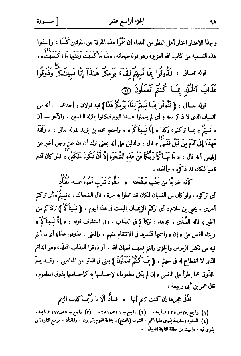 قَوْلُهُ تَعَالَى: (فَذُوقُوا بِما نَسِيتُمْ لِقاءَ يَوْمِكُمْ هَذَا) فِيهِ قَوْلَانِ: أَحَدُهُمَا- أَنَّهُ مِنَ النِّسْيَانِ الَّذِي لَا ذِكْرَ مَعَهُ، أَيْ لَمْ يَعْمَلُوا لِهَذَا الْيَوْمِ فَكَانُوا بِمَنْزِلَةِ النَّاسِينَ. وَالْآخَرُ: أَنَّ" نَسِيتُمْ" بِمَا تَرَكْتُمْ، وَكَذَا" إِنَّا نَسِيناكُمْ". وَاحْتَجَّ مُحَمَّدُ بْنُ يَزِيدَ بِقَوْلِهِ تَعَالَى:" وَلَقَدْ عَهِدْنا إِلى آدَمَ مِنْ قَبْلُ فَنَسِيَ" «٢» [طه: ١١٥] قَالَ: وَالدَّلِيلُ عَلَى أَنَّهُ بِمَعْنَى تَرَكَ أَنَّ اللَّهَ عَزَّ وَجَلَّ أَخْبَرَ عَنْ إِبْلِيسَ أَنَّهُ قَالَ:" مَا نَهاكُما رَبُّكُما عَنْ هذِهِ الشَّجَرَةِ إِلَّا أَنْ تَكُونا مَلَكَيْنِ" «٣» [الأعراف: ٢٠] فَلَوْ كَانَ آدَمُ نَاسِيًا لَكَانَ قَدْ ذَكَّرَهُ. وأنشد: