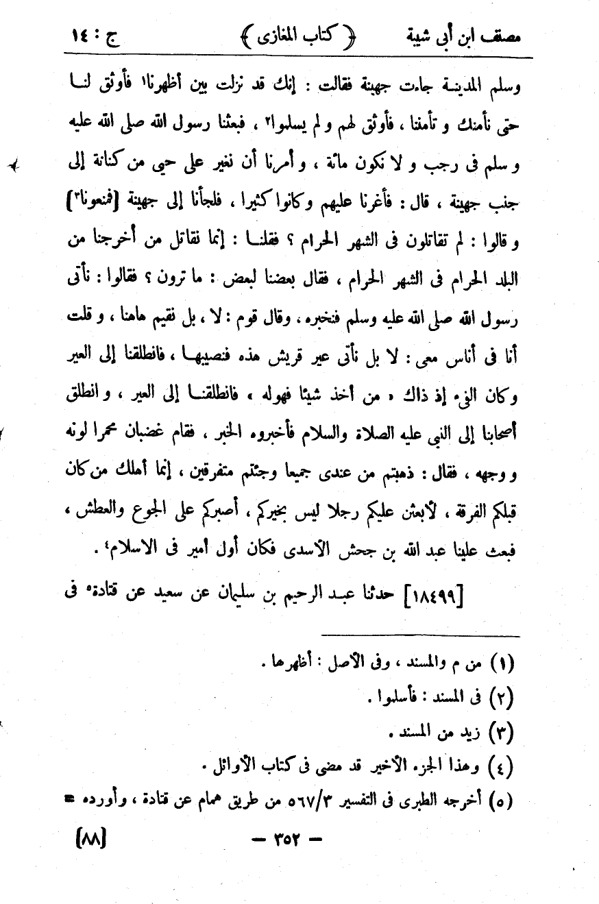 37806- حَدَّثَنَا أَبُو أُسَامَةَ ، عَنْ مُجَالِدٍ ، عَنْ زِيَادِ بْنِ عِلاَقَةَ ، عَنْ سَعْدِ بْنِ أَبِي وَقَّاصٍ ، قَالَ : لَمَّا قَدِمَ رَسُولُ اللهِ صلى الله عليه وسلم الْمَدِينَةَ ، جَاءَتْ جُهَيْنَةُ ، فَقَالَتْ : إِنَّك قَدْ نَزَلْتَ بَيْنَ أَظْهُرِنَا ، فَأَوْثِقْ لَنَا حَتَّى نَأْمَنَكَ وَتَأْمَنَنَا ، فَأَوْثَقَ لَهُمْ وَلَمْ يُسْلِمُوا ، فَبَعَثَنَا رَسُولُ اللهِ صلى الله عليه وسلم فِي رَجَبٍ ، وَلاَ نَكُونُ مِئَةً ، وَأَمَرَنَا أَنْ نُغِيرَ عَلَى حَيٍّ مِنْ كِنَانَةَ إِلَى جَنْبِ جُهَيْنَةَ ، قَالَ : فَأَغَرْنَا عَلَيْهِمْ ، وَكَانُوا كَثِيرًا ، فَلَجَأْنَا إِلَى جُهَيْنَةَ ، فَمَنَعُونَا وَقَالُوا : لِمَ تُقَاتِلُونَ فِي الشَّهْرِ الْحَرَامِ ؟ فَقُلْنَا : إِنَّمَا نُقَاتِلُ مَنْ أَخْرَجَنَا مِنَ الْبَلَدِ الْحَرَامِ فِي الشَّهْرِ الْحَرَامِ ، فَقَالَ بَعْضُنَا لِبَعْضٍ : مَا تَرَوْنَ ؟ فَقَالُوا : نَأْتِي رَسُولَ اللهِ صلى الله عليه وسلم فَنُخْبِرُهُ ، وَقَالَ قَوْمٌ : لاَ ، بَلْ نُقِيمُ هَاهُنَا ، وَقُلْتُ أَنَا فِي أُنَاسٍ مَعِي : لاَ ، بَلْ نَأْتِي عِيرَ قُرَيْشٍ هَذِهِ فَنُصِيبُهَا ، فَانْطَلَقْنَا إِلَى الْعِيرِ ، وَكَانَ الْفَيْءُ إِذْ ذَاكَ : مَنْ أَخَذَ شَيْئًا فَهُوَ لَهُ ، فَانْطَلَقْنَا إِلَى الْعِيرِ ، وَانْطَلَقَ أَصْحَابُنَا إِلَى النَّبِيِّ صلى الله عليه وسلم فَأَخْبَرُوهُ الْخَبَرَ ، فَقَامَ غَضْبَانَ مُحْمَرًّا لَوْنُهُ وَوَجْهُهُ ، فَقَالَ : ذَهَبْتُمْ مِنْ عِنْدِي جَمِيعًا ، وَجِئْتُمْ مُتَفَرِّقِينَ ؟ إِنَّمَا أَهْلَكَ مَنْ كَانَ قَبْلَكُمَ الْفُرْقَةُ ، لأَبْعَثَنَّ عَلَيْكُمْ رَجُلاً لَيْسَ بِخَيْرِكُمْ ، أَصْبَرُكُمْ عَلَى الْجُوعِ وَالْعَطَشِ ، فَبَعَثَ عَلَيْنَا عَبْدَ اللهِ بْنَ جَحْشٍ الأَسَدِيَّ ، فَكَانَ أَوَّلَ أَمِيرٍ فِي الإِسْلاَمِ.