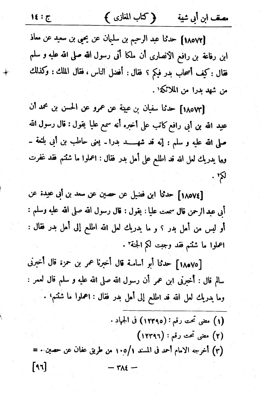 37882- حَدَّثَنَا ابْنُ فُضَيْلٍ ، عَنْ حُصَيْنٍ ، عَنْ سَعْدِ بْنِ عُبَيْدَةَ ، عَنْ أَبِي عَبْدِ الرَّحْمَنِ ، قَالَ : سَمِعْتُ عَلِيًّا : يَقُولُ : قَالَ رَسُولُ اللهِ صلى الله عليه وسلم : أَوَلَيْسَ مِنْ أَهْلِ بَدْرٍ ؟ وَمَا يُدْرِيكَ لَعَلَّ اللَّهَ اطَّلَعَ إِلَى أَهْلِ بَدْرٍ ، فَقَالَ : اعْمَلُوا مَا شِئْتُمْ فَقَدْ وَجَبَتْ لَكُمُ الْجَنَّةُ.