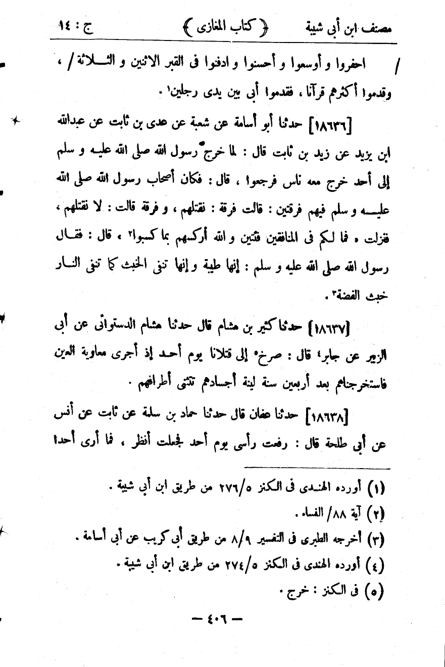 37944- حَدَّثَنَا أَبُو أُسَامَةَ ، عَنْ شُعْبَةَ ، عَنْ عَدِيِّ بْنِ ثَابِتٍ ، عَنْ عَبْدِ اللهِ بْنِ يَزِيدَ ، عَنْ زَيْدِ بْنِ ثَابِتٍ ، قَالَ : لَمَّا خَرَجَ رَسُولُ اللهِ صلى الله عليه وسلم إِلَى أُحُدٍ ، خَرَجَ مَعَهُ نَاسٌ ، فَرَجَعُوا ، قَالَ : فَكَانَ أَصْحَابُ رَسُولِ اللهِ صلى الله عليه وسلم فِيهِمْ فِرْقَتَيْنِ ؛ قَالَتْ فِرْقَةٌ : نَقْتُلُهُمْ , وَفِرْقَةٌ قَالَتْ : لاَ نَقْتُلُهُمْ , فَنَزَلَتْ : {فَمَا لَكُمْ فِي الْمُنَافِقِينَ فِئَتَيْنِ وَاللَّهُ أَرْكَسَهُمْ بِمَا كَسَبُوا} قَالَ : فَقَالَ رَسُولُ اللهِ صلى الله عليه وسلم : إِنَّهَا طَيْبَةُ ، وَإِنَّهَا تَنْفِي الْخَبَثَ ، كَمَا تَنْفِي النَّارُ خَبَثَ الْفِضَّةِ.