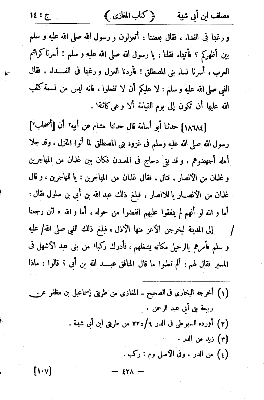 37992- حَدَّثَنَا أَبُو أُسَامَةَ ، قَالَ : حدَّثَنَا هِشَامٌ ، عَنْ أَبِيهِ ؛ أَنَّ أَصْحَابَ رَسُولِ اللهِ صلى الله عليه وسلم فِي غَزْوَةِ بَنِي الْمُصْطَلِقِ لَمَّا أَتَوْا الْمَنْزِلَ ، وَقَدْ جَلاَ أَهْلُهُ ، أَجْهَضُوهُمْ ، وَقَدْ بَقِيَ دَجَاجٌ فِي الْمَعْدِنِ ، فَكَانَ بَيْنَ غِلْمَانٍ مِنَ الْمُهَاجِرِينَ وَغِلْمَانٍ مِنَ الأَنْصَارِ قِتَالٌ ، فَقَالَ غِلْمَانٌ مِنَ الْمُهَاجِرِينَ : يَا لَلْمُهَاجِرِينَ ، وَقَالَ غِلْمَانٌ مِنَ الأَنْصَارِ : يَا لَلأَنْصَارِ ، فَبَلَغَ ذَلِكَ عَبْدَ اللهِ بْنَ أُبَيِّ ابْنَ سَلُولَ ، فَقَالَ : أَمَا وَاللهِ لَوْ أَنَّهُمْ لَمْ يُنْفِقُوا عَلَيْهِمَ انْفَضُّوا مِنْ حَوْلِهِ ، أَمَا وَاللهِ : {لَئِنْ رَجَعَنَّا إِلَى الْمَدِينَةِ لَيُخْرِجَنَّ الأَعَزُّ مِنْهَا الأَذَلَّ} فَبَلَغَ ذَلِكَ النَّبِيَّ صلى الله عليه وسلم فَأَمَرَهُمْ بِالرَّحِيلِ ، فَكَأَنَّهُ يَشْغَلُهُمْ ، فَأَدْرَكَ رَكْبًا مِنْ بَنِي عَبْدِ الأَشْهَلِ فِي الْمَسِيرِ ، فَقَالَ لَهُمْ : أَلَمْ تَعْلَمُوا مَا قَالَ الْمُنَافِقُ عَبْدُ اللهِ بْنُ أُبَيٍّ ؟ قَالُوا : وَمَاذَا قَالَ يَا رَسُولَ اللهِ ؟ قَالَ : قَالَ : أَمَا وَاللهِ لَوْ لَمْ تُنْفِقُوا عَلَيْهِمْ لاَنْفَضُّوا مِنْ حَوْلِهِ ، أَمَا وَاللهِ لَئِنْ رَجَعَنَّا إِلَى الْمَدِينَةِ لَيُخْرِجَنَّ الأَعَزُّ مِنْهَا الأَذَلَّ ، قَالُوا : صَدَقَ يَا رَسُولَ اللهِ ، فَأَنْتَ وَاللهِ الْعَزِيزُ ، وَهُوَ الذَّلِيلُ.