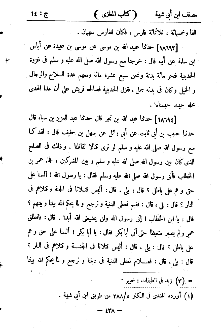 38002- حَدَّثَنَا عَبْدُ اللهِ بْنُ نُمَيْرٍ ، قَالَ : حدَّثَنَا عَبْدُ الْعَزِيزِ بْنُ سِيَاهٍ ، قَالَ : حَدَّثَنَا حَبِيبُ بْنُ أَبِي ثَابِتٍ ، عَنْ أَبِي وَائِلٍ ، عَنْ سَهْلِ بْنِ حُنَيْفٍ ، قَالَ : لَقَدْ كُنَّا مَعَ رَسُولِ اللهِ صلى الله عليه وسلم لَوْ نَرَى قِتَالاً لَقَاتَلْنَا ، وَذَلِكَ فِي الصُّلْحِ الَّذِي كَانَ بَيْنَ رَسُولِ اللهِ صلى الله عليه وسلم وَبَيْنَ الْمُشْرِكِينَ ، فَجَاءَ عُمَرُ بْنُ الْخَطَّابِ فَأَتَى رَسُولَ اللهِ صلى الله عليه وسلم ، فَقَالَ : يَا رَسُولَ اللهِ ، أَلَسْنَا عَلَى حَقٍّ وَهُمْ عَلَى بَاطِلٍ ؟ قَالَ : بَلَى ، قَالَ : أَلَيْسَ قَتْلاَنَا فِي الْجَنَّةِ وَقَتْلاَهُمْ فِي النَّارِ ؟ قَالَ : بَلَى ، قَالَ : فَفِيمَ نُعْطِي الدَّنِيَّةَ ، وَنَرْجِعُ وَلَمَّا يَحْكُمَ اللَّهُ بَيْنَنَا وَبَيْنَهُمْ ؟ قَالَ : يَابْنَ الْخَطَّابِ ، إِنِّي رَسُولُ اللهِ ، وَلَنْ يُضَيِّعَنِي اللَّهُ أَبَدًا ، قَالَ : فَانْطَلَقَ عُمَرُ ، وَلَمْ يَصْبِرْ ، مُتَغَيِّظًا حَتَّى أَتَى أَبَا بَكْرٍ ، فَقَالَ : يَا أَبَا بَكْرٍ ، أَلَسْنَا عَلَى حَقٍّ وَهُمْ عَلَى بَاطِلٍ ؟ قَالَ : بَلَى ، قَالَ : أَلَيْسَ قَتْلاَنَا فِي الْجَنَّةِ وَقَتْلاَهُمْ فِي النَّارِ ؟ قَالَ : بَلَى ، قَالَ : فَعَلَى مَ نُعْطِي الدَّنِيَّةَ فِي دِينِنَا ، وَنَرْجِعُ وَلَمَّا يَحْكُمَ اللَّهُ بَيْنَنَا