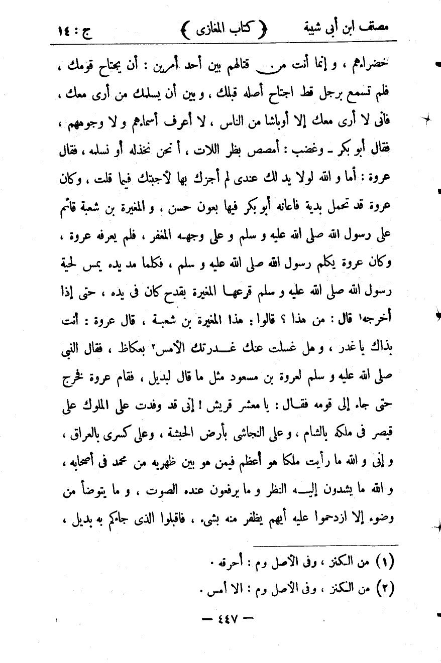 فَقَالَ أَبُو بَكْرٍ ، وَغَضِبَ : اُمْصُصْ بَظْرَ اللاَتِ ، أَنَحْنُ نَخْذُلُهُ ، أَوْ نُسْلِمُهُ ؟ فَقَالَ عُرْوَةُ : أَمَّا وَاللهِ لَوْلاَ يَدٌ لَكَ عِنْدِي لَمْ أَجْزِكَ بِهَا لأَجَبْتُكَ فِيمَا قُلْتَ ، وَكَانَ عُرْوَةُ قَدْ تَحَمَّلَ بِدِيَةٍ ، فَأَعَانَهُ أَبُو بَكْرٍ فِيهَا بِعَوْنٍ حَسَنٍ.