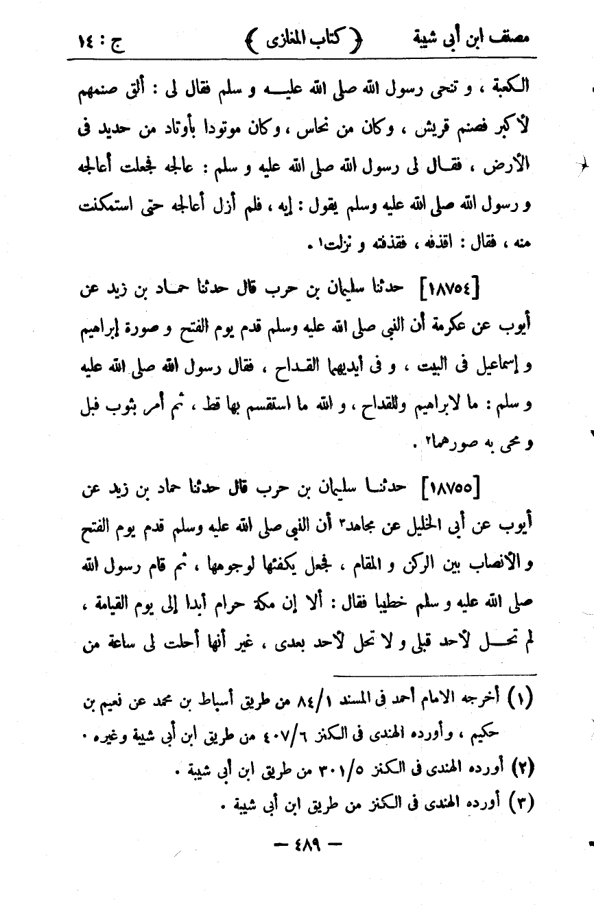 38064- حَدَّثَنَا سُلَيْمَانُ بْنُ حَرْبٍ ، قَالَ : حدَّثَنَا حَمَّادُ بْنُ زَيْدٍ ، عَنْ أَيُّوبَ ، عَنْ أَبِي الْخَلِيلِ ، عَنْ مُجَاهِدٍ ؛ أَنَّ النَّبِيَّ صلى الله عليه وسلم قَدِمَ يَوْمَ الْفَتْحِ وَالأَنْصَابُ بَيْنَ الرُّكْنِ وَالْمَقَامِ ، فَجَعَلَ يُكَفؤهَا لِوُجُوهِهَا ، ثُمَّ قَامَ رَسُولُ اللهِ صلى الله عليه وسلم خَطِيبًا ، فَقَالَ : أَلاَ إِنَّ مَكَّةَ حَرَامٌ أَبَدًا إِلَى يَوْمِ الْقِيَامَةِ ، لَمْ تَحِلَّ لأَحَدٍ قَبْلِي ، وَلاَ تَحِلُّ لأَحَدٍ بَعْدِي ، غَيْرَ أَنَّهَا أُحِلَّتْ لِي سَاعَةً مِنَ