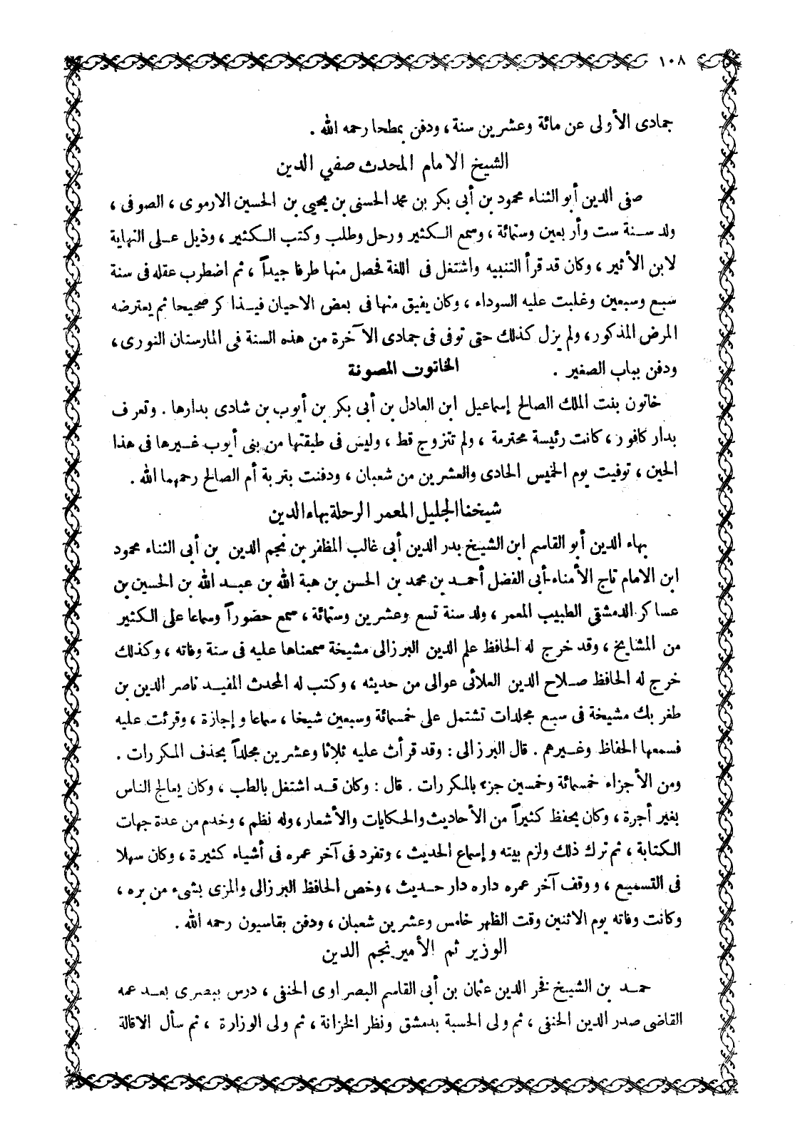 صَفِيُّ الدِّينِ أَبُو الثَّنَاءِ مَحْمُودُ بْنُ أَبِي بَكْرِ بْنِ محمد الحسنى بْنِ يَحْيَى بْنِ الْحُسَيْنِ الْأُرْمَوِيُّ، الصُّوفِيُّ، وُلِدَ سنة ست وَأَرْبَعِينَ وَسِتِّمِائَةٍ، وَسَمِعَ الْكَثِيرَ وَرَحَلَ وَطَلَبَ وَكَتَبَ الْكَثِيرَ، وَذَيَّلَ عَلَى النِّهَايَةِ لِابْنِ الْأَثِيرِ، وَكَانَ قد قرأ التنبيه واشتغل في اللغة فَحَصَّلَ مِنْهَا طَرَفًا جَيِّدًا، ثُمَّ اضْطَرَبَ عَقْلُهُ في سنة سبع وسبعين وَغَلَبَتْ عَلَيْهِ السَّوْدَاءُ، وَكَانَ يُفِيقُ مِنْهَا فِي بَعْضِ الْأَحْيَانِ فَيُذَاكِرُ صَحِيحًا ثُمَّ يَعْتَرِضُهُ الْمَرَضُ الْمَذْكُورُ، وَلَمْ يَزَلْ كَذَلِكَ حَتَّى تُوُفِّيَ فِي جُمَادَى الْآخِرَةِ مِنْ هَذِهِ السَّنَةِ فِي الْمَارَسْتَانِ النُّورِيِّ، وَدُفِنَ بِبَابِ الصَّغِيرِ.