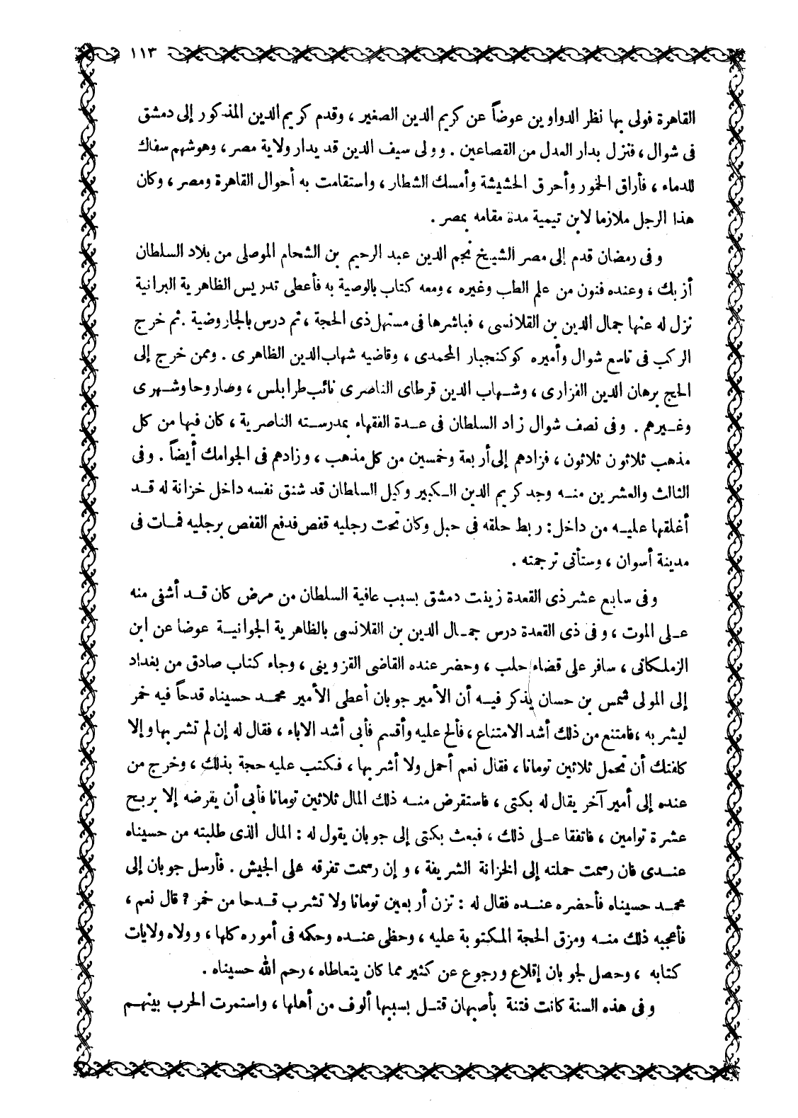 القاهرة فولى بِهَا نَظَرَ الدَّوَاوِينِ عِوَضًا عَنْ كَرِيمِ الدِّينِ الصَّغِيرِ، وَقَدِمَ كَرِيمُ الدِّينِ الْمَذْكُورُ إِلَى دِمَشْقَ فِي شَوَّالٍ، فَنَزَلَ بِدَارِ الْعَدْلِ مَنَ الْقَصَّاعِينَ. وَوَلِيَ سَيْفُ الدِّينِ قُدَيْدَارُ وِلَايَةَ مِصْرَ، وَهُوَ شَهْمٌ سَفَّاكٌ لِلدِّمَاءِ، فَأَرَاقَ الْخُمُورَ وَأَحْرَقَ الْحَشِيشَةَ وَأَمْسَكَ الشُّطَّارَ، وَاسْتَقَامَتْ بِهِ أَحْوَالُ الْقَاهِرَةِ وَمِصْرَ، وَكَانَ هَذَا الرَّجُلُ مُلَازِمًا لِابْنِ تَيْمِيَّةَ مُدَّةَ مُقَامِهِ بِمِصْرَ.