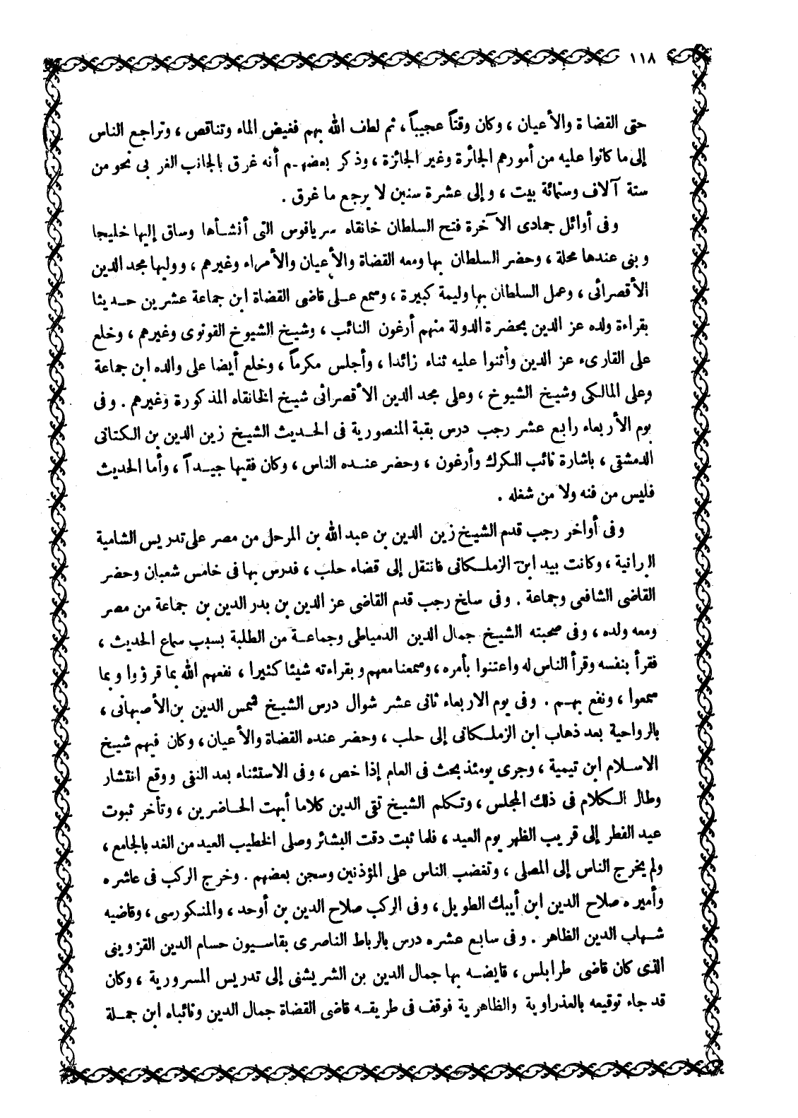 وَفِي أَوَاخِرِ رَجَبٍ قَدِمَ الشَّيْخُ زَيْنُ الدين بْنُ عَبْدِ اللَّهِ بْنِ الْمُرَحِّلِ مِنْ مِصْرَ عَلَى تَدْرِيسِ الشَّامِيَّةِ الْبَرَّانِيَّةِ، وَكَانَتْ بِيَدِ ابْنِ الزَّمْلَكَانِيِّ فَانْتَقَلَ إِلَى قَضَاءِ حَلَبَ، فَدَرَّسَ بِهَا فِي خَامِسِ شَعْبَانَ وَحَضَرَ الْقَاضِي الشَّافِعِيُّ وَجَمَاعَةٌ. وَفِي سَلْخِ رَجَبٍ قَدِمَ الْقَاضِي عِزُّ الدِّينِ بْنُ بَدْرِ الدِّينِ بْنِ جَمَاعَةَ مِنْ مِصْرَ وَمَعَهُ وَلَدُهُ، وَفِي صُحْبَتِهِ الشَّيْخُ جَمَالُ الدِّينِ الدِّمْيَاطِيُّ وَجَمَاعَةٌ مِنَ الطَّلَبَةِ بِسَبَبِ سَمَاعِ الْحَدِيثِ، فَقَرَأَ بِنَفْسِهِ وَقَرَأَ النَّاسُ لَهُ وَاعْتَنَوْا بِأَمْرِهِ، وَسَمِعْنَا مَعَهُمْ وَبِقِرَاءَتِهِ شَيْئًا كَثِيرًا، نَفْعَهُمُ اللَّهُ بِمَا قَرَءُوا وَبِمَا سَمِعُوا، وَنَفَعَ بِهِمْ. وَفِي يَوْمِ الْأَرْبِعَاءِ ثَانِيَ عَشَرَ شَوَّالٍ دَرَّسَ الشَّيْخُ شَمْسُ الدِّينِ بْنُ الْأَصْبَهَانِيِّ، بِالرَّوَاحِيَّةِ بَعْدَ ذَهَابِ ابْنِ الزَّمْلَكَانِيِّ إِلَى حَلَبَ، وَحَضَرَ عِنْدَهُ الْقُضَاةُ وَالْأَعْيَانُ، وَكَانَ فِيهِمْ شَيْخُ الْإِسْلَامِ ابْنُ تَيْمِيَّةَ، وَجَرَى يَوْمَئِذٍ بَحْثٌ فِي الْعَامِّ إِذَا خُصَّ، وَفِي الِاسْتِثْنَاءِ بَعْدَ النَّفْيِ وَوَقَعَ انْتِشَارٌ وَطَالَ الْكَلَامُ فِي ذَلِكَ الْمَجْلِسِ، وَتَكَلَّمَ الشَّيْخُ تَقِيُّ الدِّينِ كَلَامًا أَبْهَتَ الْحَاضِرِينَ، وَتَأَخَّرَ ثُبُوتُ عِيدِ الْفِطْرِ إِلَى قَرِيبِ الظُّهْرِ يَوْمَ الْعِيدِ، فَلَمَّا ثَبَتَ دَقَّتِ الْبَشَائِرُ وَصَلَّى الْخَطِيبُ الْعِيدَ مِنَ الْغَدِ بِالْجَامِعِ، وَلَمْ يَخْرُجِ النَّاسُ إِلَى الْمُصَلَّى، وتغضب الناس عَلَى الْمُؤَذِّنِينَ وَسَجَنَ بَعْضَهُمْ. وَخَرَجَ الرَّكْبُ فِي عاشره وأميره صلاح الدين ابن أَيْبَكَ الطَّوِيلُ، وَفِي الرَّكْبِ صَلَاحُ الدِّينِ بْنُ أوحد، والمنكورسى، وقاضيه شهاب الدين الظاهر. وَفِي سَابِعَ عَشَرَهُ دَرَّسَ بِالرِّبَاطِ النَّاصِرِيِّ بَقَاسِيُونَ حسام الدين القزويني الَّذِي كَانَ قَاضِيَ طَرَابُلُسَ، قَايَضَهُ بِهَا جَمَالُ الدين بن الشريشنى إِلَى تَدْرِيسِ الْمَسْرُورِيَّةِ، وَكَانَ قَدْ جَاءَ تَوْقِيعُهُ بِالْعَذْرَاوِيَّةِ وَالظَّاهِرِيَّةِ فَوَقَفَ فِي طَرِيقِهِ قَاضِي الْقُضَاةِ جمال الدِّينِ وَنَائِبَاهُ ابْنُ جُمْلَةَ