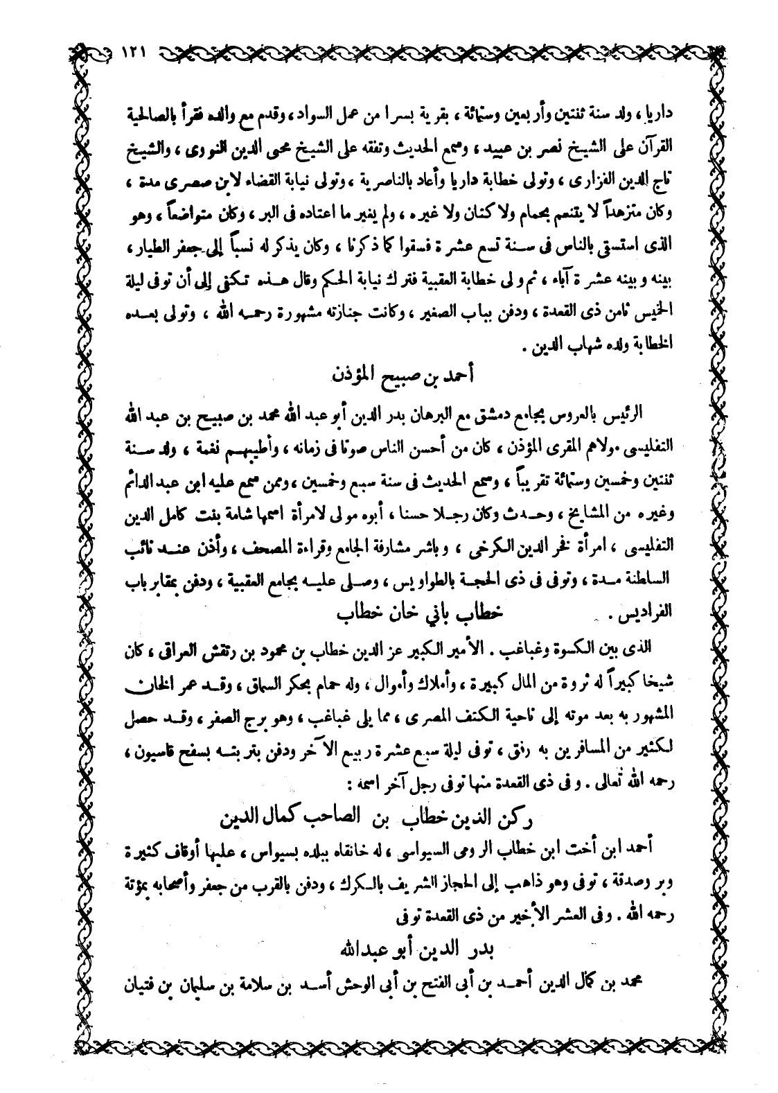 أَحْمَدَ ابْنِ أُخْتِ ابْنِ خَطَّابٍ الرُّومِيُّ السِّيوَاسِيُّ، لَهُ خَانَقَاهْ بِبَلَدِهِ بِسِيوَاسَ، عَلَيْهَا أَوْقَافٌ كَثِيرَةٌ وَبِرٌّ وَصَدَقَةٌ، تُوُفِّيَ وَهُوَ ذَاهِبٌ إِلَى الْحِجَازِ الشَّرِيفِ بِالْكَرَكِ، وَدُفِنَ بِالْقُرْبِ مِنْ جَعْفَرٍ وَأَصْحَابِهِ بِمُؤْتَةَ رَحِمَهُ اللَّهُ.