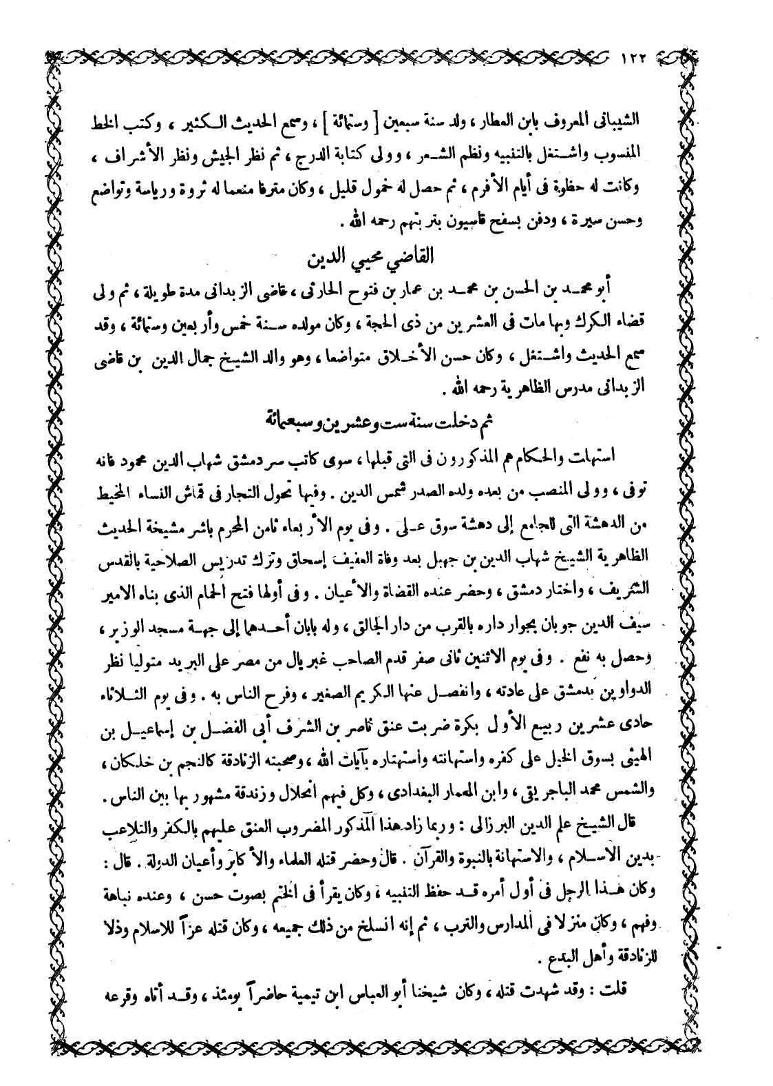 قلت: وقد شهدت قتله، وكان شيخنا أَبُو الْعَبَّاسِ ابْنُ تَيْمِيَّةَ حَاضِرًا يَوْمَئِذٍ، وَقَدْ أتاه وقرعه