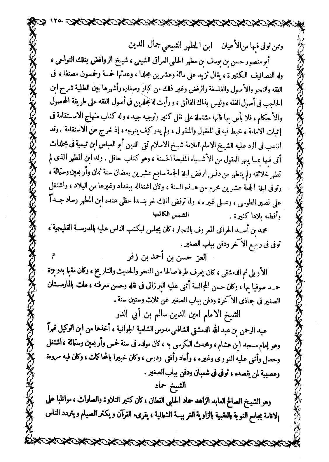 أَبُو مَنْصُورٍ حَسَنُ بْنُ يوسف بن مطهر الحلبي الْعِرَاقِيُّ الشِّيعِيُّ، شَيْخُ الرَّوَافِضِ بِتِلْكَ النَّوَاحِي، وَلَهُ التَّصَانِيفُ الْكَثِيرَةُ، يُقَالُ تَزِيدُ عَلَى مِائَةٍ وَعِشْرِينَ مُجَلَّدًا، وَعِدَّتُهَا خَمْسَةٌ وَخَمْسُونَ مُصَنَّفًا، فِي الْفِقْهِ وَالنَّحْوِ وَالْأُصُولِ وَالْفَلْسَفَةِ وَالرَّفْضِ وَغَيْرِ ذَلِكَ مِنْ كبار وصغار، وأشهرها بين الطلبة شرح ابْنِ الْحَاجِبِ فِي أُصُولِ الْفِقْهِ، وَلَيْسَ بِذَاكَ الْفَائِقِ، وَرَأَيْتُ لَهُ مُجَلَّدَيْنِ فِي أُصُولِ الْفِقْهِ على طريقة المحصول والأحكام، فلا بَأْسَ بِهَا فَإِنَّهَا مُشْتَمِلَةٌ عَلَى نَقْلٍ كَثِيرٍ وتوجيه جَيِّدٍ، وَلَهُ كِتَابُ مِنْهَاجِ الِاسْتِقَامَةِ فِي إِثْبَاتِ الْإِمَامَةِ، خَبَطَ فِيهِ فِي الْمَعْقُولِ وَالْمَنْقُولِ، وَلَمْ يَدْرِ كَيْفَ يَتَوَجَّهُ، إِذْ خَرَجَ عَنِ الِاسْتِقَامَةِ. وقد انتدب في الرد عليه الشَّيْخُ الْإِمَامُ الْعَلَّامَةُ شَيْخُ الْإِسْلَامِ تَقِيُّ الدِّينِ أَبُو الْعَبَّاسِ ابْنُ تَيْمِيَّةَ فِي مُجَلَّدَاتٍ أَتَى فِيهَا بِمَا يُبْهِرُ الْعُقُولَ مِنَ الْأَشْيَاءِ الْمَلِيحَةِ الْحَسَنَةِ، وَهُوَ كِتَابٌ حَافِلٌ. وُلِدَ ابْنُ الْمُطَهَّرِ الَّذِي لَمْ تَطْهُرْ خَلَائِقُهُ وَلَمْ يَتَطَهَّرْ مِنْ دنس الرفض لَيْلَةِ الْجُمُعَةِ سَابِعِ عِشْرِينَ رَمَضَانَ سَنَةَ ثَمَانٍ وأربعين وستمائة، وتوفى ليلة الجمعة عشرين محرم مِنْ هَذِهِ السَّنَةِ، وَكَانَ اشْتِغَالُهُ بِبَغْدَادَ وَغَيْرِهَا من البلاد، واشتغل على نصير الطُّوسِيِّ، وَعَلَى غَيْرِهِ، وَلَمَّا تَرَفَّضَ الْمَلِكُ خَرْبَنْدَا حَظِيَ عِنْدَهُ ابْنُ الْمُطَهَّرِ وَسَادَ جَدًّا وَأَقْطَعَهُ بِلَادًا كَثِيرَةً.