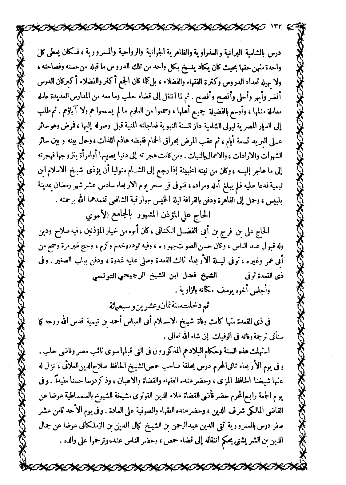 درس بالشامية البرانية والعذراوية والظاهرية الجوانية وَالرَّوَاحِيَّةِ وَالْمَسْرُورِيَّةِ، فَكَانَ يُعْطِي كُلَّ وَاحِدَةٍ مِنْهُنَّ حَقَّهَا بِحَيْثُ كَانَ يَكَادُ يَنْسَخُ بِكُلِّ وَاحِدٍ مِنْ تِلْكَ الدُّرُوسِ مَا قَبْلَهُ مَنْ حُسْنِهِ وفصاحته، ولا يهيله تَعْدَادُ الدُّرُوسِ وَكَثْرَةُ الْفُقَهَاءِ وَالْفُضَلَاءِ، بَلْ كُلَّمَا كَانَ الْجَمْعُ أَكْثَرَ وَالْفُضَلَاءُ أَكْبَرَ كَانَ الدَّرْسُ أنضر وأبهر وأحلى وَأَنْصَحَ وَأَفْصَحَ. ثُمَّ لَمَّا انْتَقَلَ إِلَى قَضَاءِ حَلَبَ وَمَا مَعَهُ مِنَ الْمَدَارِسِ الْعَدِيدَةِ عَامَلَهُ معاملة مثلها، وأوسع بالفضيلة جَمِيعَ أَهْلِهَا، وَسَمِعُوا مِنَ الْعُلُومِ مَا لَمْ يَسْمَعُوا هُمْ وَلَا آبَاؤُهُمْ. ثُمَّ طُلِبَ إِلَى الدِّيَارِ الْمِصْرِيَّةِ لِيُوَلَّى الشَّامِيَّةَ دَارَ السُّنَّةِ النَّبَوِيَّةِ فَعَاجَلَتْهُ الْمَنِيَّةُ قَبْلَ وُصُولِهِ إِلَيْهَا، فَمَرِضَ وَهُوَ سَائِرٌ عَلَى الْبَرِيدِ تِسْعَةَ أَيَّامٍ، ثُمَّ عَقَبَ المرض بحراق الْحِمَامِ فَقَبَضَهُ هَاذِمُ اللَّذَّاتِ، وَحَالَ بَيْنَهُ وَبَيْنَ سَائِرِ الشَّهَوَاتِ وَالْإِرَادَاتِ، وَالْأَعْمَالُ بِالنِّيَّاتِ. وَمَنْ كَانَتْ هِجْرَتُهُ إِلَى دُنْيَا يُصِيبُهَا أَوِ امْرَأَةٍ يَتَزَوَّجُهَا فَهِجْرَتُهُ إِلَى مَا هَاجَرَ إِلَيْهِ، وَكَانَ مِنْ نِيَّتِهِ الْخَبِيثَةِ إِذَا رَجَعَ إِلَى الشَّامِ مُتَوَلِّيًا أَنْ يُؤْذِيَ شَيْخَ الْإِسْلَامِ ابْنَ تَيْمِيَّةَ فَدَعَا عَلَيْهِ فَلَمْ يَبْلُغْ أَمَلَهُ وَمُرَادَهُ، فَتُوُفِّيَ فِي سَحَرِ يَوْمِ الْأَرْبِعَاءِ سَادِسَ عَشَرَ شَهْرِ رَمَضَانَ بِمَدِينَةِ بُلْبَيْسَ، وَحُمِلَ إِلَى الْقَاهِرَةِ وَدُفِنَ بِالْقَرَافَةِ لَيْلَةَ الْخَمِيسِ جِوَارَ قُبَّةِ الشَّافِعِيِّ تَغَمَّدَهُمَا اللَّهُ برحمته.