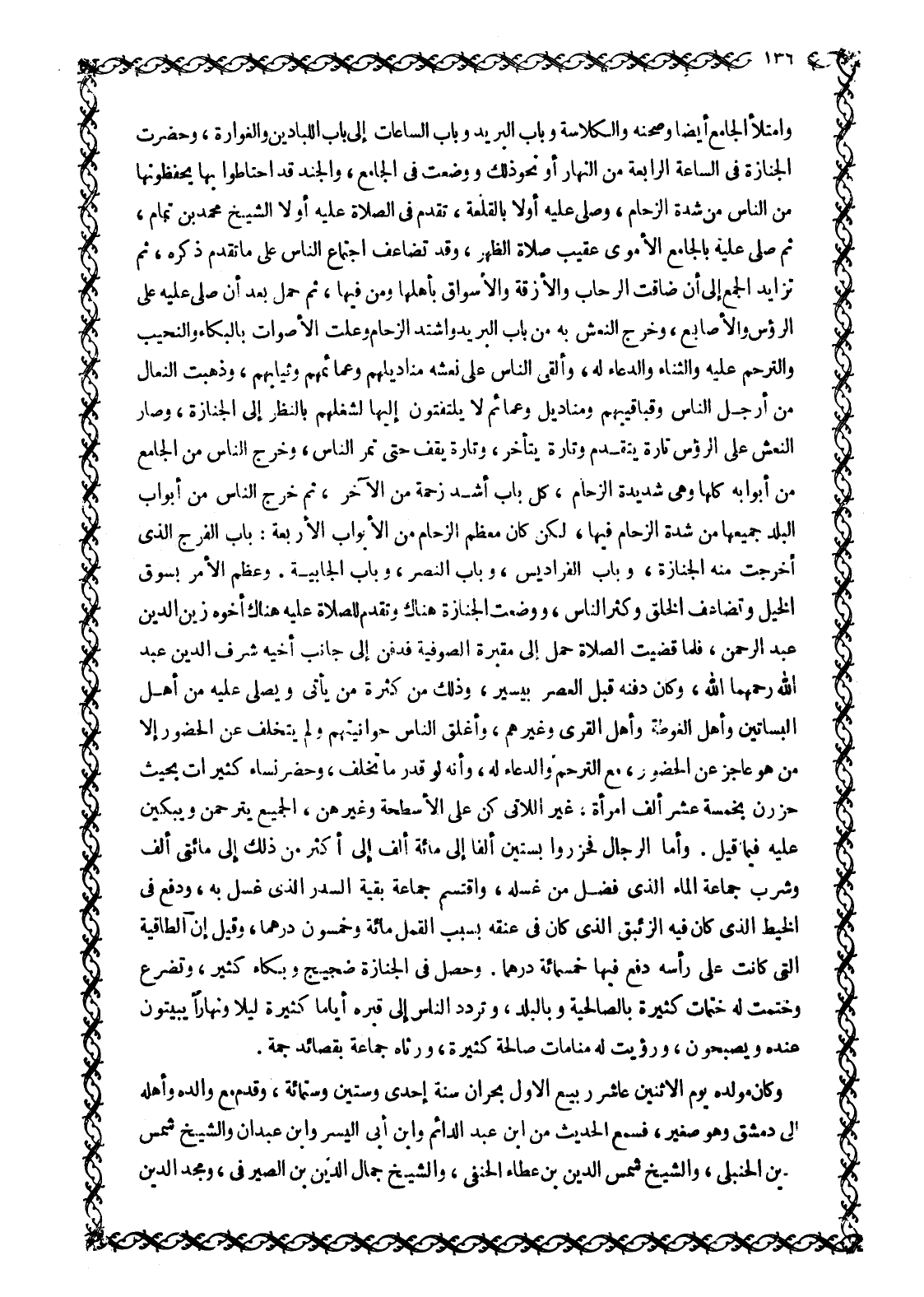 وامتلأ الجامع أيضا وَصَحْنُهُ وَالْكَلَّاسَةُ وَبَابُ الْبَرِيدِ وَبَابُ السَّاعَاتِ إِلَى باب اللبادين والغوارة، وَحَضَرَتِ الْجِنَازَةُ فِي السَّاعَةِ الرَّابِعَةِ مِنَ النَّهَارِ أَوْ نَحْوِ ذَلِكَ وَوُضِعَتْ فِي الْجَامِعِ، وَالْجُنْدُ قد احتاطوا بها يَحْفَظُونَهَا مِنَ النَّاسِ مِنْ شِدَّةِ الزِّحَامِ، وَصُلِّيَ عَلَيْهِ أَوَّلًا بِالْقَلْعَةِ، تَقَدَّمَ فِي الصَّلَاةِ عَلَيْهِ أولا الشَّيْخُ مُحَمَّدُ بْنُ تَمَّامٍ، ثُمَّ صُلِّيَ عَلَيْهِ بالجامع الأموي عقيب صلاة الظهر، وقد تضاعف اجتماع الناس على ما تقدم ذكره، ثم تزايد الجمع إلى أن ضاقت الرحاب والأزقة والأسواق بأهلها ومن فيها، ثم حمل بعد أن صلى عليه على الرءوس والأصابع، وخرج النعش به من باب البريد واشتد الزحام وعلت الأصوات بالبكاء والنحيب والترحم عليه والثناء والدعاء له، وألقى الناس على نعشه مناديلهم وعمائمهم وثيابهم، وذهبت النعال من أرجل الناس وقباقيبهم ومناديل وعمائم لا يلتفتون إليها لشغلهم بالنظر إلى الجنازة، وَصَارَ النَّعْشُ عَلَى الرُّءُوسِ تَارَةً يَتَقَدَّمُ وَتَارَةً يتأخر، وتارة يقف حتى تمر الناس، وَخَرَجَ النَّاسُ مِنَ الْجَامِعِ مِنْ أَبْوَابِهِ كُلِّهَا وهي شديدة الزحام، كل باب أشد زحمة من الآخر، ثم خرج الناس من أبواب البلد جميعها من شدة الزحام فيها، لكن كان معظم الزحام مِنَ الْأَبْوَابِ الْأَرْبَعَةِ: بَابِ الْفَرَجِ الَّذِي أُخْرِجَتْ مِنْهُ الْجِنَازَةُ، وَبَابِ الْفَرَادِيسِ، وَبَابِ النَّصْرِ، وَبَابِ الجابية. وعظم الأمر بسوق الخيل وتضاعف الخلق وكثر الناس، ووضعت الجنازة هناك وَتَقَدَّمَ لِلصَّلَاةِ عَلَيْهِ هُنَاكَ أَخُوهُ زَيْنُ الدِّينِ عبد الرحمن، فلما قضيت الصلاة حمل إِلَى مَقْبَرَةِ الصُّوفِيَّةِ فَدُفِنَ إِلَى جَانِبِ أَخِيهِ شَرَفِ الدِّينِ عَبْدِ اللَّهِ رَحِمَهُمَا اللَّهُ، وَكَانَ دفنه قبل العصر بيسير، وذلك من كثرة من يأتى ويصلى عليه من أهل البساتين وأهل الغوطة وأهل القرى وغيرهم، وأغلق النَّاسُ حَوَانِيتَهُمْ وَلَمْ يَتَخَلَّفْ عَنِ الْحُضُورِ إِلَّا من هو عاجز عن الحضور، مع الترحم والدعاء له، وأنه لو قدر ما تخلف، وحضر نساء كثيرات بحيث حزرن بخمسة عشر ألف امرأة، غير اللاتي كن على الأسطحة وغيرهن، الجميع يترحمن ويبكين عليه فيما قيل. وأما الرجال فحزروا بستين ألفا إلى مائة ألف إلى أكثر من ذلك إِلَى مِائَتَيْ أَلْفٍ وَشَرِبَ جَمَاعَةٌ الْمَاءَ الَّذِي فَضَلَ مِنْ غُسْلِهِ، وَاقْتَسَمَ جَمَاعَةٌ بَقِيَّةَ السِّدْرِ الّذي غسل به، ودفع في الْخَيْطَ الَّذِي كَانَ فِيهِ الزِّئْبَقُ الَّذِي كَانَ في عنقه بسبب القمل مائة وخمسون درهما، وَقِيلَ إِنَّ الطَّاقِيَّةَ الَّتِي كَانَتْ عَلَى رَأْسِهِ دفع فيها خمسمائة درهما. وحصل في الجنازة ضجيج وبكاء كثير، وتضرع وختمت له ختمات كثيرة بالصالحية وبالبلد، وَتَرَدَّدَ النَّاسُ إِلَى قَبْرِهِ أَيَّامًا كَثِيرَةً لَيْلًا ونهارا يبيتون عنده ويصبحون، ورئيت له منامات صالحة كثيرة، وَرَثَاهُ جَمَاعَةٌ بِقَصَائِدَ جَمَّةٍ.