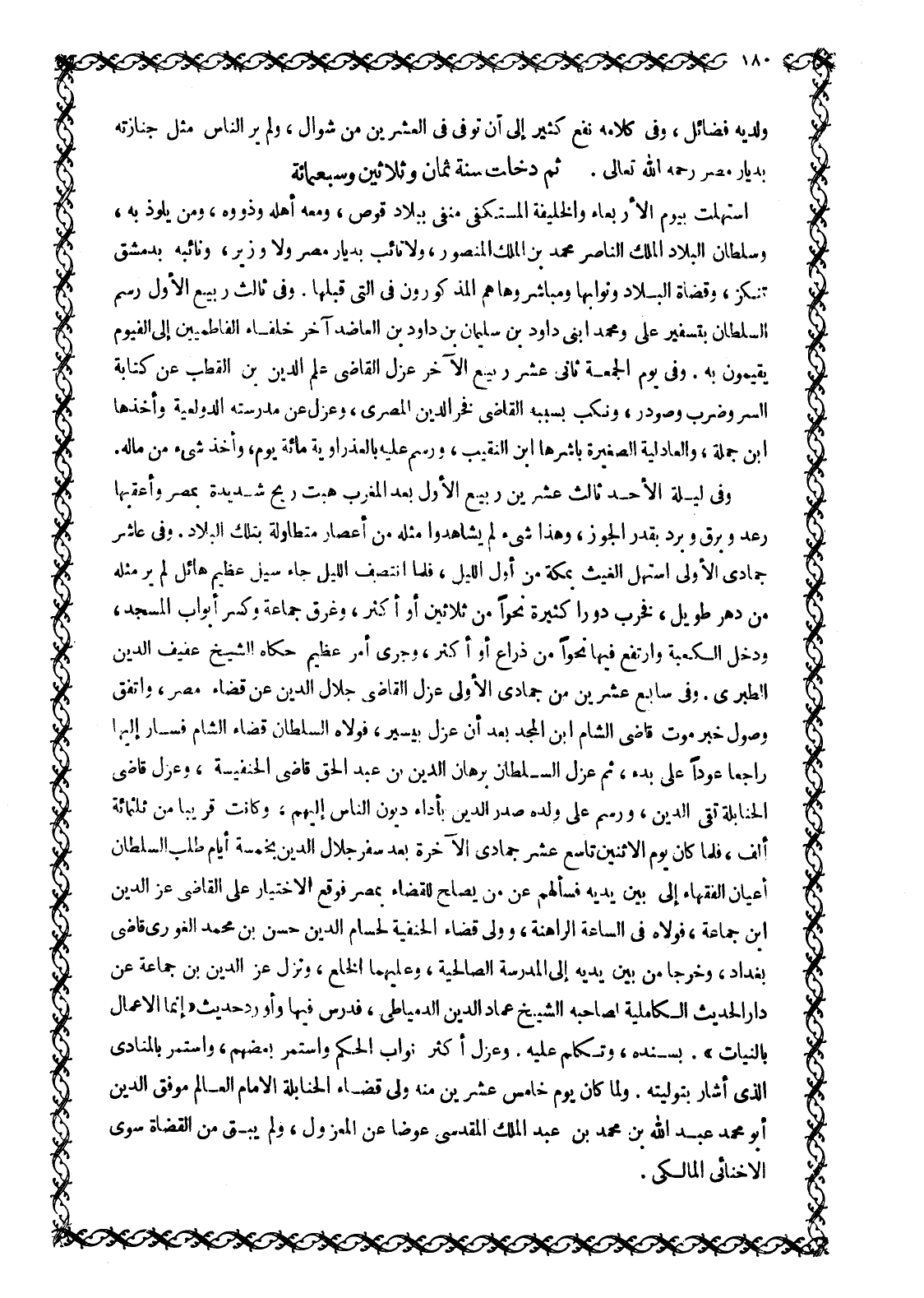 وَفِي لَيْلَةِ الْأَحَدِ ثَالِثِ عِشْرِينَ رَبِيعٍ الْأَوَّلِ بَعْدَ الْمَغْرِبِ هَبَّتْ رِيحٌ شَدِيدَةٌ بِمِصْرَ وَأَعْقَبَهَا رَعْدٌ وَبَرْقٌ وَبَرَدٌ بِقَدْرِ الْجَوْزِ، وَهَذَا شَيْءٌ لَمْ يُشَاهِدُوا مِثْلَهُ مِنْ أَعْصَارٍ مُتَطَاوِلَةٍ بِتِلْكَ الْبِلَادِ. وَفِي عَاشِرِ جُمَادَى الْأُولَى اسْتَهَلَّ الْغَيْثُ بِمَكَّةَ مِنْ أَوَّلِ اللَّيْلِ، فَلَمَّا انْتَصَفَ اللَّيْلُ جَاءَ سَيْلٌ عَظِيمٌ هَائِلٌ لَمْ يُرَ مِثْلُهُ مِنْ دَهْرٍ طَوِيلٍ، فَخَرَّبَ دُورًا كَثِيرَةً نَحْوًا مِنْ ثَلَاثِينَ أَوْ أَكْثَرَ، وَغَرَّقَ جَمَاعَةً وَكَسَرَ أَبْوَابَ الْمَسْجِدِ، وَدَخَلَ الْكَعْبَةَ وَارْتَفَعَ فِيهَا نَحْوًا مِنْ ذِرَاعٍ أَوْ أَكْثَرَ، وَجَرَى أَمْرٌ عَظِيمٌ حَكَاهُ الشَّيْخُ عَفِيفُ الدين الطبري. وَفِي سَابِعِ عِشْرِينَ مِنْ جُمَادَى الْأُولَى عُزِلَ القاضي جلال الدين عَنْ قَضَاءِ مِصْرَ، وَاتَّفَقَ وَصُولُ خَبَرِ مَوْتِ قَاضِي الشَّامِ ابْنِ الْمَجْدِ بَعْدَ أَنْ عُزِلَ بِيَسِيرٍ، فَوَلَّاهُ السُّلْطَانُ قَضَاءَ الشَّامِ فَسَارَ إِلَيْهَا رَاجِعًا عَوْدًا عَلَى بَدْءٍ، ثُمَّ عَزَلَ السُّلْطَانُ بُرْهَانَ الدِّينِ بْنَ عَبْدِ الْحَقِّ قَاضِيَ الْحَنَفِيَّةِ، وَعَزَلَ قَاضِيَ الْحَنَابِلَةِ تَقِيَّ الدِّينِ، وَرَسَمَ عَلَى وَلَدِهِ صَدْرِ الدِّينِ بِأَدَاءِ دُيُونِ النَّاسِ إِلَيْهِمْ، وَكَانَتْ قَرِيبًا مِنْ ثَلَاثِمِائَةِ أَلْفٍ، فَلَمَّا كَانَ يَوْمُ الِاثْنَيْنِ تَاسِعَ عَشَرَ جُمَادَى الْآخِرَةِ بَعْدَ سَفَرِ جَلَالِ الدِّينِ بِخَمْسَةِ أَيَّامٍ طَلَبَ السُّلْطَانُ أعيان الفقهاء إلى بين يديه فسألهم عن من يَصْلُحُ لِلْقَضَاءِ بِمِصْرَ فَوَقَعَ الِاخْتِيَارُ عَلَى الْقَاضِي عز الدين ابن جَمَاعَةَ، فَوَلَّاهُ فِي السَّاعَةِ الرَّاهِنَةِ، وَوَلَّى قَضَاءَ الْحَنَفِيَّةِ لِحُسَامِ الدِّينِ حَسَنِ بْنِ مُحَمَّدٍ الْغُورِيِّ قَاضِي بَغْدَادَ، وَخَرَجَا مِنْ بَيْنِ يَدَيْهِ إِلَى الْمَدْرَسَةِ الصَّالِحِيَّةِ، وَعَلَيْهِمَا الْخُلَعُ، وَنَزَلَ عِزُّ الدِّينِ بْنُ جَمَاعَةَ عَنْ دَارِ الْحَدِيثِ الْكَامِلِيَّةِ لِصَاحِبِهِ الشَّيْخِ عِمَادِ الدِّينِ الدِّمْيَاطِيِّ، فَدَرَّسَ فِيهَا وَأَوْرَدَ حَدِيثَ «إِنَّمَا الْأَعْمَالُ بِالنِّيَّاتِ» . بِسَنَدِهِ، وَتَكَلَّمَ عَلَيْهِ. وعزل أكثر نواب الحكم واستمر بعضهم، واستمر بالمنادي الَّذِي أَشَارَ بِتَوْلِيَتِهِ. وَلَمَّا كَانَ يَوْمُ خَامِسِ عِشْرِينَ مِنْهُ وَلِيَ قَضَاءَ الْحَنَابِلَةِ الْإِمَامُ الْعَالِمُ مُوَفَّقُ الدِّينِ أَبُو مُحَمَّدٍ عَبْدُ اللَّهِ بْنُ مُحَمَّدِ بْنِ عَبْدِ الْمَلِكِ الْمَقْدِسِيُّ عِوَضًا عَنِ الْمَعْزُولِ، وَلَمْ يَبْقَ مِنَ الْقُضَاةِ سِوَى الْأَخْنَائِيِّ المالكي.
