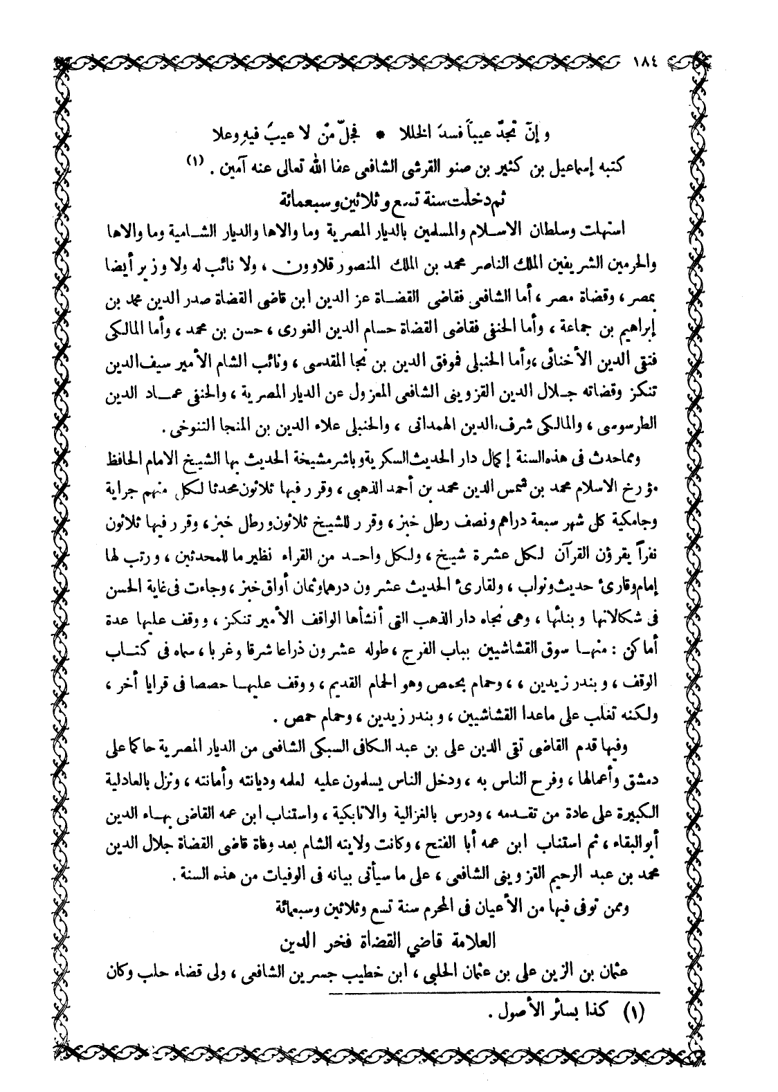 اسْتَهَلَّتْ وَسُلْطَانُ الْإِسْلَامِ وَالْمُسْلِمِينَ بِالدِّيَارِ الْمِصْرِيَّةِ وَمَا وَالَاهَا وَالدِّيَارِ الشَّامِيَّةِ وَمَا وَالَاهَا وَالْحَرَمَيْنِ الشَّرِيفَيْنِ الْمَلِكِ النَّاصِرِ مُحَمَّدِ بْنِ الْمَلِكِ الْمَنْصُورِ قَلَاوُونَ، وَلَا نَائِبَ لَهُ وَلَا وَزِيرَ أَيْضًا بِمِصْرَ، وَقُضَاةُ مِصْرَ، أَمَّا الشَّافِعِيُّ فَقَاضِي الْقُضَاةِ عِزُّ الدين ابن قاضى القضاة صدر الدِّينِ مُحَمَّدِ بْنِ إِبْرَاهِيمَ بْنِ جَمَاعَةَ، وَأَمَّا الْحَنَفِيُّ فَقَاضِي الْقُضَاةِ حُسَامُ الدِّينِ الْغُورِيُّ، حَسَنُ بْنُ مُحَمَّدٍ، وَأَمَّا الْمَالِكِيُّ فَتَقِيُّ الدِّينِ الْأَخْنَائِيُّ، وَأَمَّا الْحَنْبَلِيُّ فَمُوَفَّقُ الدِّينِ بْنُ نَجَا الْمَقْدِسِيُّ، وَنَائِبُ الشَّامِ الْأَمِيرُ سَيْفُ الدِّينِ تَنْكِزُ وَقُضَاتُهُ جَلَالُ الدِّينِ الْقَزْوِينِيُّ الشَّافِعِيُّ الْمَعْزُولُ عَنِ الدِّيَارِ الْمِصْرِيَّةِ، وَالْحَنَفِيُّ عِمَادُ الدِّينِ الطَّرَسُوسِيُّ، وَالْمَالِكِيُّ شَرَفُ الدِّينِ الْهَمْدَانِيُّ، وَالْحَنْبَلِيُّ عَلَاءُ الدِّينِ بْنُ الْمُنَجَّا التَّنُوخِيُّ.