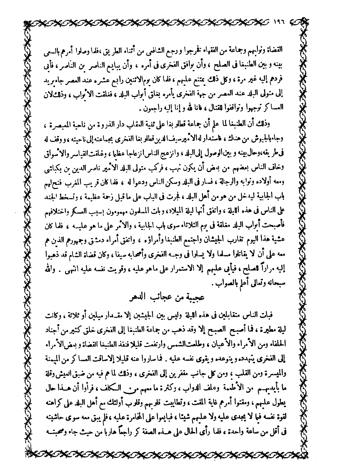 الْقُضَاةِ وَنُوَّابِهِمْ وَجَمَاعَةٍ مِنَ الْفُقَهَاءِ فَخَرَجُوا وَرَجَعَ الشَّافِعِيُّ مِنْ أَثْنَاءِ الطَّرِيقِ، فَلَمَّا وَصَلُوا أَمْرَهُمْ بِالسَّعْيِ بَيْنَهُ وَبَيْنَ أُلْطُنْبُغَا فِي الصُّلْحِ، وَأَنْ يُوَافِقَ الْفَخْرِيَّ فِي أَمْرِهِ، وَأَنْ يُبَايِعَ النَّاصِرَ بن الناصر، فأبى فَرَدَّهُمْ إِلَيْهِ غَيْرَ مَرَّةٍ، وَكُلُّ ذَلِكَ يَمْتَنِعُ عَلَيْهِمْ، فَلَمَّا كَانَ يَوْمُ الِاثْنَيْنِ رَابِعَ عَشَرَهُ عِنْدَ الْعَصْرِ جَاءَ بَرِيدٌ إِلَى مُتَوَلِّي الْبَلَدِ عِنْدَ الْعَصْرِ مِنْ جِهَةِ الْفَخْرِيِّ يَأْمُرُهُ بِغَلْقِ أَبْوَابِ الْبَلَدِ، فَغُلِّقَتِ الْأَبْوَابُ، وَذَلِكَ لِأَنَّ الْعَسَاكِرَ توجهوا وتواقفوا للقتال، ف إِنَّا لِلَّهِ وَإِنَّا إِلَيْهِ راجِعُونَ. 2: 156 وَذَلِكَ أَنَّ أُلْطُنْبُغَا لَمَّا عَلِمَ أَنَّ جَمَاعَةَ قُطْلُوبُغَا عَلَى ثَنِيَّةِ العقاب دار الذروة من ناحية المعيصرة، وجاء بالجيوش من هناك، فَاسْتَدَارَ لَهُ الْأَمِيرُ سَيْفُ الدِّينِ قُطْلُوبُغَا الْفَخْرِيُّ بِجَمَاعَتِهِ إِلَى نَاحِيَتِهِ، وَوَقَفَ لَهُ فِي طَرِيقِهِ، وَحَالَ بَيْنَهُ وَبَيْنَ الْوُصُولِ إِلَى الْبَلَدِ، وَانْزَعَجَ النَّاسُ انْزِعَاجًا عَظِيمًا، وَغُلِّقَتِ الْقَيَاسِرُ وَالْأَسْوَاقُ وَخَافَ الناس بعضهم من بعض أن يكون نهب، فَرَكِبَ مُتَوَلِّي الْبَلَدِ الْأَمِيرُ نَاصِرُ الدِّينِ بْنُ بكباشى وَمَعَهُ أَوْلَادُهُ وَنُوَّابُهُ وَالرَّجَّالَةُ، فَسَارَ فِي الْبَلَدِ وَسَكَّنَ النَّاسَ وَدَعَوْا لَهُ، فَلَمَّا كَانَ قُرَيْبُ الْمَغْرِبِ فَتَحَ لَهُمْ بَابَ الْجَابِيَةِ لِيَدْخُلَ مَنْ هُوَ مِنْ أَهْلِ الْبَلَدِ، فَجَرَتْ فِي الْبَابِ عَلَى مَا قِيلَ زَحْمَةٌ عَظِيمَةٌ، وَتَسَخَّطَ الْجُنْدُ عَلَى النَّاسِ فِي هَذِهِ اللَّيْلَةِ، وَاتُّفِقَ أَنَّهَا ليلة الميلاد، وبات المسلمون مهمومون بِسَبَبِ الْعَسْكَرِ وَاخْتِلَافِهِمْ فَأَصْبَحَتْ أَبْوَابُ الْبَلَدِ مُغْلَقَةً فِي يَوْمِ الثُّلَاثَاءِ سِوَى بَابِ الْجَابِيَةِ، وَالْأَمْرُ عَلَى مَا هُوَ عَلَيْهِ، فَلَمَّا كَانَ عَشِيَّةُ هَذَا الْيَوْمِ تَقَارَبَ الْجَيْشَانِ وَاجْتَمَعَ أُلْطُنْبُغَا وَأُمَرَاؤُهُ، واتفق أمراء دمشق وجمهورهم الَّذِينَ هُمْ مَعَهُ عَلَى أَنْ لَا يُقَاتِلُوا مُسْلِمًا وَلَا يَسُلُّوا فِي وَجْهِ الْفَخْرِيِّ وَأَصْحَابِهِ سَيْفًا، وَكَانَ قُضَاةُ الشَّامِ قَدْ ذَهَبُوا إِلَيْهِ مِرَارًا لِلصُّلْحِ، فَيَأْبَى عَلَيْهِمْ إِلَّا الِاسْتِمْرَارَ عَلَى ما هو عليه، وقويت نفسه عليه انتهى. والله سبحانه وتعالى أعلم بالصواب.