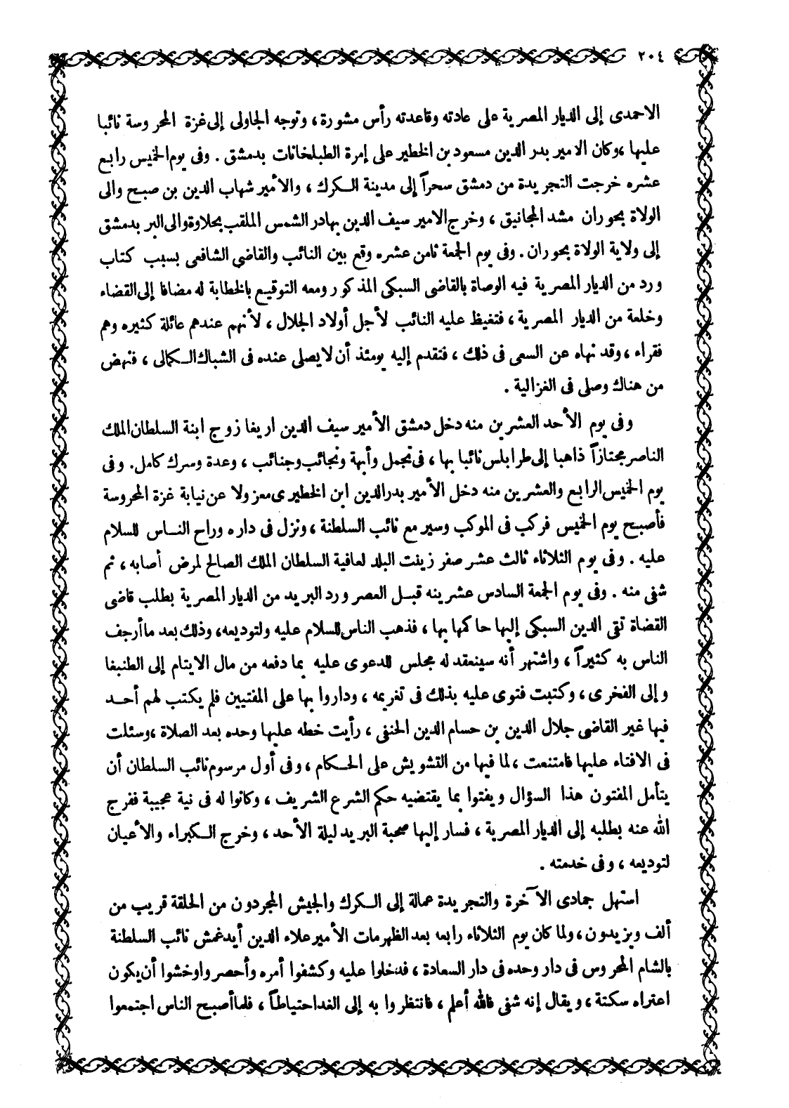 وَفِي يَوْمِ الْأَحَدِ الْعِشْرِينَ مِنْهُ دَخَلَ دمشق الأمير سيف الدين اريغا زَوْجُ ابْنَةِ السُّلْطَانِ الْمَلِكِ النَّاصِرِ مُجْتَازًا ذَاهِبًا إِلَى طَرَابُلُسَ نَائِبًا بِهَا، فِي تَجَمُّلٍ وَأُبَّهَةٍ ونجائب وجنائب، وَعِدَّةٍ وَسَرْكٍ كَامِلٍ. وَفِي يَوْمِ الْخَمِيسِ الرَّابِعِ والعشرين منه دخل الأمير بدر الدين ابن الخطيريّ مَعْزُولًا عَنْ نِيَابَةِ غَزَّةَ الْمَحْرُوسَةِ فَأَصْبَحَ يَوْمَ الْخَمِيسِ فَرَكِبَ فِي الْمَوْكِبِ وَسُيِّرَ مَعَ نَائِبِ السَّلْطَنَةِ، وَنَزَلَ فِي دَارِهِ وَرَاحَ النَّاسُ لِلسَّلَامِ عليه. وفي يوم الثلاثاء ثالث عشر صفر زُيِّنَتِ الْبَلَدُ لِعَافِيَةِ السُّلْطَانِ الْمَلِكِ الصَّالِحِ لِمَرَضٍ أَصَابَهُ، ثُمَّ شُفِيَ مِنْهُ. وَفِي يَوْمِ الْجُمُعَةِ السادس عشرينه قَبْلَ الْعَصْرِ وَرَدَ الْبَرِيدُ مِنَ الدِّيَارِ الْمِصْرِيَّةِ بِطَلَبِ قَاضِي الْقُضَاةِ تَقِيِّ الدِّينِ السُّبْكِيِّ إِلَيْهَا حاكمها بِهَا، فَذَهَبَ النَّاسُ لِلسَّلَامِ عَلَيْهِ وَلِتَوْدِيعِهِ، وَذَلِكَ بَعْدَ مَا أَرْجَفَ النَّاسُ بِهِ كَثِيرًا، وَاشْتَهَرَ أَنَّهُ سَيَنْعَقِدُ لَهُ مَجْلِسٌ لِلدَّعْوَى عَلَيْهِ بِمَا دَفَعَهُ مِنْ مَالِ الْأَيْتَامِ إِلَى أُلْطُنْبُغَا وَإِلَى الْفَخْرِيِّ، وَكُتِبَتْ فَتْوَى عَلَيْهِ بِذَلِكَ فِي تَغْرِيمِهِ، وَدَارُوا بِهَا عَلَى الْمُفْتِينَ فَلَمْ يَكْتُبْ لَهُمْ أَحَدٌ فِيهَا غَيْرَ الْقَاضِي جَلَالِ الدِّينِ بْنِ حُسَامِ الدِّينِ الْحَنَفِيِّ، رَأَيْتُ خَطَّهُ عَلَيْهَا وَحْدَهُ بَعْدَ الصَّلَاةِ، وَسُئِلْتُ فِي الْإِفْتَاءِ عَلَيْهَا فَامْتَنَعْتُ، لِمَا فِيهَا مِنَ التَّشْوِيشِ عَلَى الْحُكَّامِ، وَفِي أَوَّلِ مَرْسُومِ نَائِبِ السُّلْطَانِ أَنْ يَتَأَمَّلَ الْمُفْتُونَ هَذَا السُّؤَالَ وَيُفْتُوا بِمَا يَقْتَضِيهِ حُكْمُ الشَّرْعِ الشَّرِيفِ، وَكَانُوا لَهُ فِي نِيَّةٍ عَجِيبَةٍ فَفَرَّجَ اللَّهُ عَنْهُ بِطَلَبِهِ إِلَى الدِّيَارِ الْمِصْرِيَّةِ، فَسَارَ إِلَيْهَا صُحْبَةَ الْبَرِيدِ لَيْلَةَ الْأَحَدِ، وَخَرَجَ الْكُبَرَاءُ وَالْأَعْيَانُ لِتَوْدِيعِهِ، وَفِي خِدْمَتِهِ.