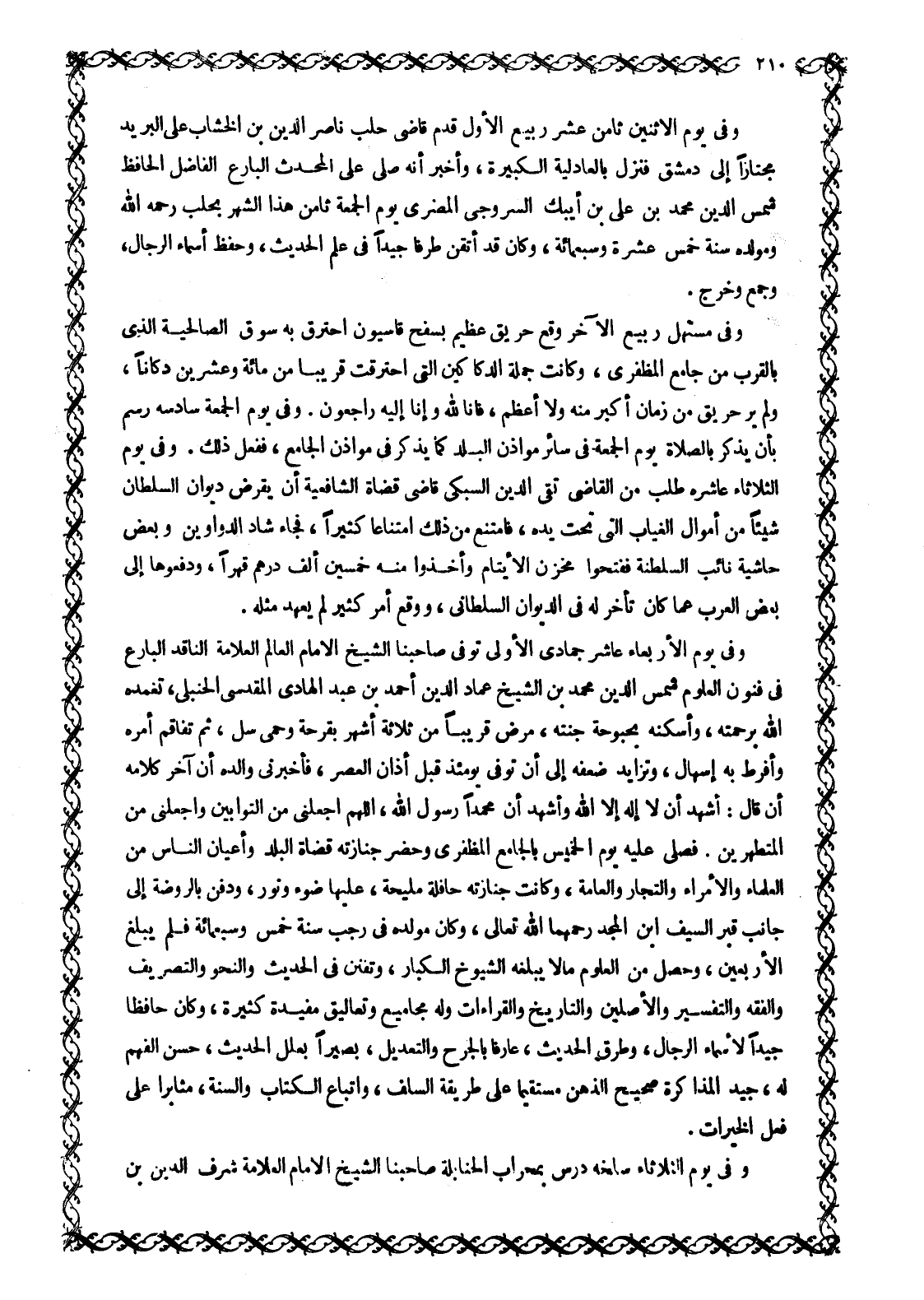 وَفِي يَوْمِ الْأَرْبِعَاءِ عَاشِرِ جُمَادَى الْأُولَى تُوُفِّيَ صَاحِبُنَا الشَّيْخُ الْإِمَامُ الْعَالِمُ الْعَلَّامَةُ النَّاقِدُ الْبَارِعُ فِي فُنُونِ الْعُلُومِ شَمْسُ الدين محمد بن الشَّيْخِ عِمَادِ الدِّينِ أَحْمَدَ بْنِ عَبْدِ الْهَادِي الْمَقْدِسِيُّ الْحَنْبَلِيُّ، تَغَمَّدَهُ اللَّهُ بِرَحْمَتِهِ، وَأَسْكَنَهُ بُحْبُوحَةَ جَنَّتِهِ، مَرِضَ قَرِيبًا مِنْ ثَلَاثَةِ أَشْهُرٍ بِقُرْحَةٍ وَحُمَّى سُلٍّ، ثُمَّ تَفَاقَمَ أَمْرُهُ وَأَفْرَطَ بِهِ إِسْهَالٌ، وَتَزَايَدَ ضَعْفُهُ إِلَى أَنْ تُوُفِّيَ يَوْمَئِذٍ قَبْلَ أَذَانِ الْعَصْرِ، فَأَخْبَرَنِي وَالِدُهُ أَنَّ آخِرَ كَلَامِهِ أَنْ قَالَ: أَشْهَدُ أَنْ لَا إِلَهَ إِلَّا اللَّهُ وَأَشْهَدُ أَنَّ مُحَمَّدًا رَسُولُ اللَّهِ، اللَّهمّ اجْعَلْنِي مِنَ التَّوَّابِينَ وَاجْعَلْنِي مِنَ الْمُتَطَهِّرِينَ. فصلى عليه يَوْمِ الْخَمِيسِ بِالْجَامِعِ الْمُظَفَّرِيِّ وَحَضَرَ جَنَازَتَهُ قُضَاةُ الْبَلَدِ وَأَعْيَانُ النَّاسِ مِنَ الْعُلَمَاءِ وَالْأُمَرَاءِ وَالتُّجَّارِ وَالْعَامَّةِ، وَكَانَتْ جَنَازَتُهُ حَافِلَةً مَلِيحَةً، عَلَيْهَا ضَوْءٌ وَنُورٌ، وَدُفِنَ بِالرَّوْضَةِ إِلَى جَانِبِ قَبْرِ السَّيْفِ ابن الْمَجْدِ رَحِمَهُمَا اللَّهُ تَعَالَى، وَكَانَ مَوْلِدُهُ فِي رَجَبٍ سَنَةَ خَمْسٍ وَسَبْعِمِائَةٍ فَلَمْ يَبْلُغِ الْأَرْبَعِينَ، وَحَصَّلَ مِنَ الْعُلُومِ مَا لَا يَبْلُغُهُ الشُّيُوخُ الْكِبَارُ، وَتَفَنَّنَ فِي الْحَدِيثِ وَالنَّحْوِ وَالتَّصْرِيفِ وَالْفِقْهِ وَالتَّفْسِيرِ وَالْأَصْلَيْنِ وَالتَّارِيخِ وَالْقِرَاءَاتِ وَلَهُ مَجَامِيعُ وَتَعَالِيقُ مُفِيدَةٌ كَثِيرَةٌ، وَكَانَ حَافِظًا جَيِّدًا لِأَسْمَاءِ الرِّجَالِ، وَطُرُقِ الْحَدِيثِ، عَارِفًا بِالْجَرْحِ وَالتَّعْدِيلِ، بَصِيرًا بِعِلَلِ الْحَدِيثِ، حَسَنَ الْفَهْمِ لَهُ، جَيِّدَ الْمُذَاكَرَةِ صَحِيحَ الذِّهْنِ مُسْتَقِيمًا عَلَى طَرِيقَةِ السَّلَفِ، وَاتِّبَاعِ الْكِتَابِ وَالسُّنَّةِ، مُثَابِرًا عَلَى فِعْلِ الْخَيِّرَاتِ.