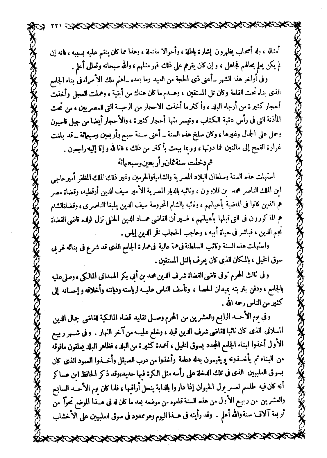 وَفِي يَوْمِ الْأَحَدِ الرَّابِعِ وَالْعِشْرِينَ مِنَ الْمُحَرَّمِ وَصَلَ تَقْلِيدُ قَضَاءِ الْمَالِكِيَّةِ لِلْقَاضِي جَمَالِ الدِّينِ الْمِسَلَّاتِيِّ الَّذِي كَانَ نَائِبًا لِلْقَاضِي شَرَفِ الدِّينِ قَبْلَهُ، وَخُلِعَ عَلَيْهِ مِنْ آخِرِ النَّهَارِ. وَفِي شَهْرِ رَبِيعٍ الْأَوَّلِ أَخَذُوا لِبِنَاءِ الْجَامِعِ الْمُجَدَّدِ بسوق الخيل، أعمدة كثيرة من البلد، فظاهر البلد يعلقون ما فوقه من البناء ثم يأخذونه ويقيمون بَدَلَهُ دِعَامَةً وَأَخَذُوا مِنْ دَرْبِ الصَّيْقَلِ وَأَخَذُوا الْعَمُودَ الَّذِي كَانَ بِسُوقِ الْعِلْبِيِّينَ الَّذِي فِي تِلْكَ الدَّخْلَةِ عَلَى رَأْسِهِ مِثْلُ الْكُرَةِ فِيهَا حَدِيدٌ، وَقَدْ ذَكَرَ الْحَافِظُ ابْنُ عَسَاكِرَ أَنَّهُ كَانَ فِيهِ طَلْسَمٌ لِعُسْرِ بَوْلِ الْحَيَوَانِ إِذَا داروا بِالدَّابَّةِ يَنْحَلُّ أَرَاقِيهَا، فَلَمَّا كَانَ يَوْمُ الْأَحَدِ السَّابِعِ وَالْعِشْرِينَ مِنْ رَبِيعٍ الْأَوَّلِ مِنْ هَذِهِ السَّنَةِ قلعوه مِنْ مَوْضِعِهِ بَعْدَ مَا كَانَ لَهُ فِي هَذَا الْمَوْضِعِ نَحْوًا مِنْ أَرْبَعَةِ آلَافِ سَنَةٍ وَاللَّهُ أَعْلَمُ. وَقَدْ رَأَيْتُهُ فِي هَذَا الْيَوْمِ وَهُوَ مَمْدُودٌ فِي سُوقِ الْعِلْبِيِّينَ عَلَى الْأَخْشَابِ