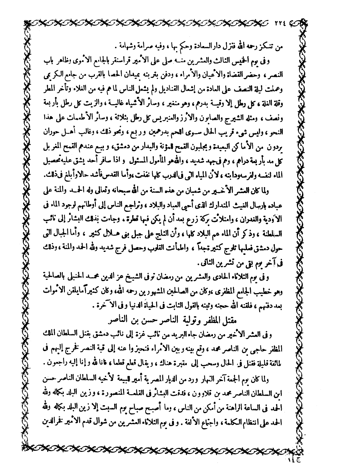 وَفِي الْعَشْرِ الْأَخِيرِ مِنْ رَمَضَانَ جَاءَ الْبَرِيدُ مِنْ نَائِبِ غَزَّةَ إِلَى نَائِبِ دِمَشْقَ بِقَتْلِ السُّلْطَانِ الْمَلِكِ الْمُظَفَّرِ حَاجِّي بْنِ النَّاصِرِ مُحَمَّدٍ، وَقَعَ بَيْنَهُ وبين الأمراء فتحيزوا عنه إلى قبة النصر فَخَرَجَ إِلَيْهِمْ فِي طَائِفَةٍ قَلِيلَةٍ فَقُتِلَ فِي الْحَالِ وَسُحِبَ إِلَى مَقْبَرَةٍ هُنَاكَ، وَيُقَالُ قُطِّعَ قطعا، ف إِنَّا لِلَّهِ وَإِنَّا إِلَيْهِ راجِعُونَ. 2: 156 وَلَمَّا كَانَ يَوْمُ الْجُمُعَةِ آخِرَ النَّهَارِ وَرَدَ مِنَ الدِّيَارِ الْمِصْرِيَّةِ أَمِيرٌ لِلْبَيْعَةِ لِأَخِيهِ السُّلْطَانِ النَّاصِرِ حَسَنٍ ابْنِ السُّلْطَانِ النَّاصِرِ مُحَمَّدِ بْنِ قَلَاوُونَ، فَدَقَّتِ الْبَشَائِرُ في القلعة المنصورة، وزين البلد بكماله وللَّه الحمد فِي السَّاعَةِ الرَّاهِنَةِ مَنْ أَمْكَنَ مِنَ النَّاسِ، وما أصبح صباح يوم السبت إلا زُيِّنَ الْبَلَدُ بِكَمَالِهِ وللَّه الْحَمْدُ عَلَى انْتِظَامِ الْكَلِمَةِ، وَاجْتِمَاعِ الْأُلْفَةِ. وَفِي يَوْمِ الثُّلَاثَاءِ الْعِشْرِينَ مِنْ شَوَّالٍ قَدِمَ الْأَمِيرُ فَخْرُ الدِّينِ