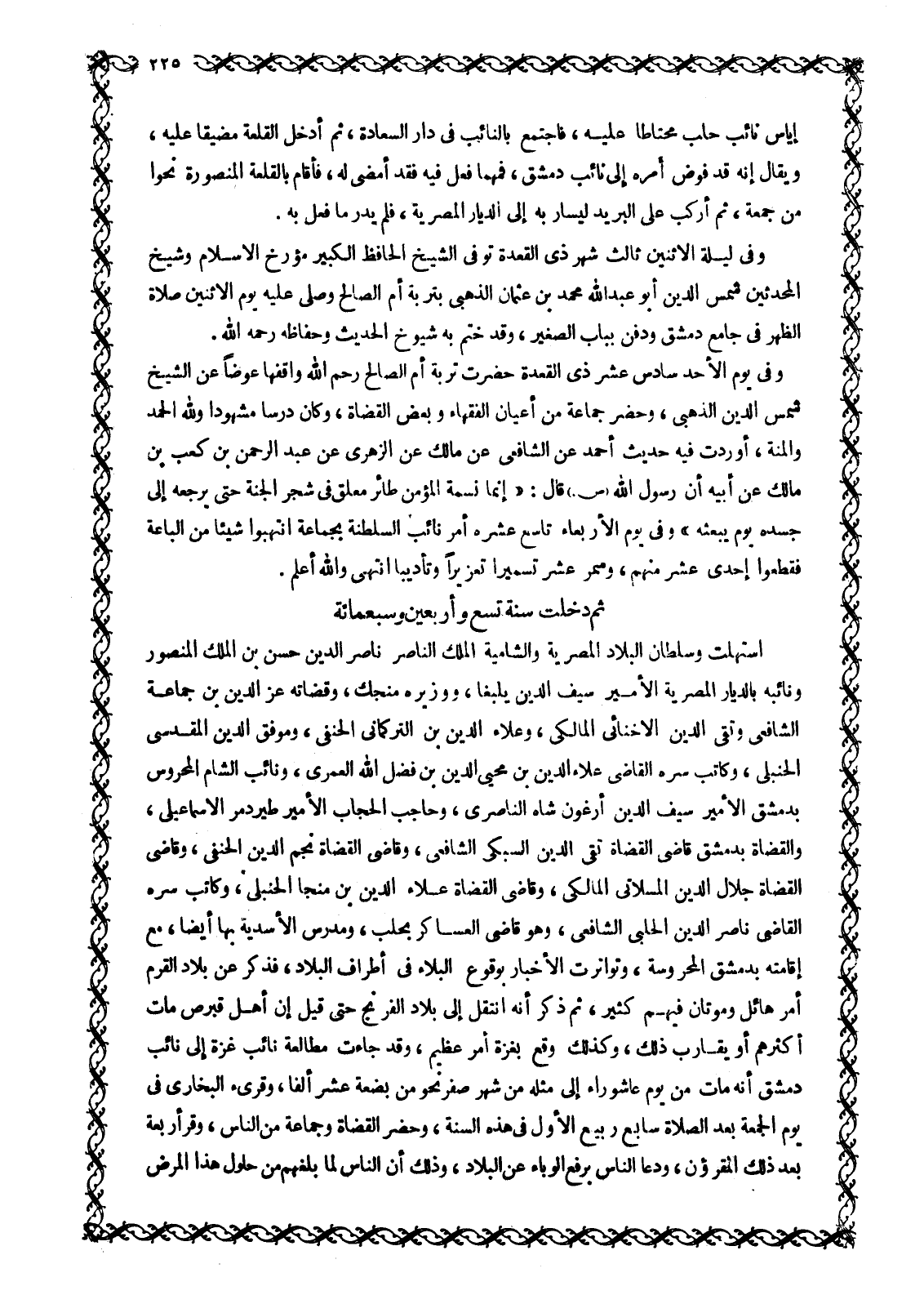 وَفِي لَيْلَةِ الِاثْنَيْنِ ثَالِثِ شَهْرِ ذِي الْقَعْدَةِ تُوُفِّيَ الشَّيْخُ الْحَافِظُ الْكَبِيرُ مُؤَرِّخُ الْإِسْلَامِ وَشَيْخُ الْمُحَدِّثِينَ شَمْسُ الدِّينِ أَبُو عَبْدِ اللَّهِ مُحَمَّدُ بْنُ عُثْمَانَ الذَّهَبِيُّ بِتُرْبَةِ أُمِّ الصَّالِحِ وَصُلِّيَ عَلَيْهِ يَوْمَ الِاثْنَيْنِ صَلَاةَ الظُّهْرِ فِي جَامِعِ دِمَشْقَ وَدُفِنَ بِبَابِ الصَّغِيرِ، وَقَدْ خُتِمَ بِهِ شُيُوخُ الْحَدِيثِ وَحُفَّاظُهُ رَحِمَهُ اللَّهُ.