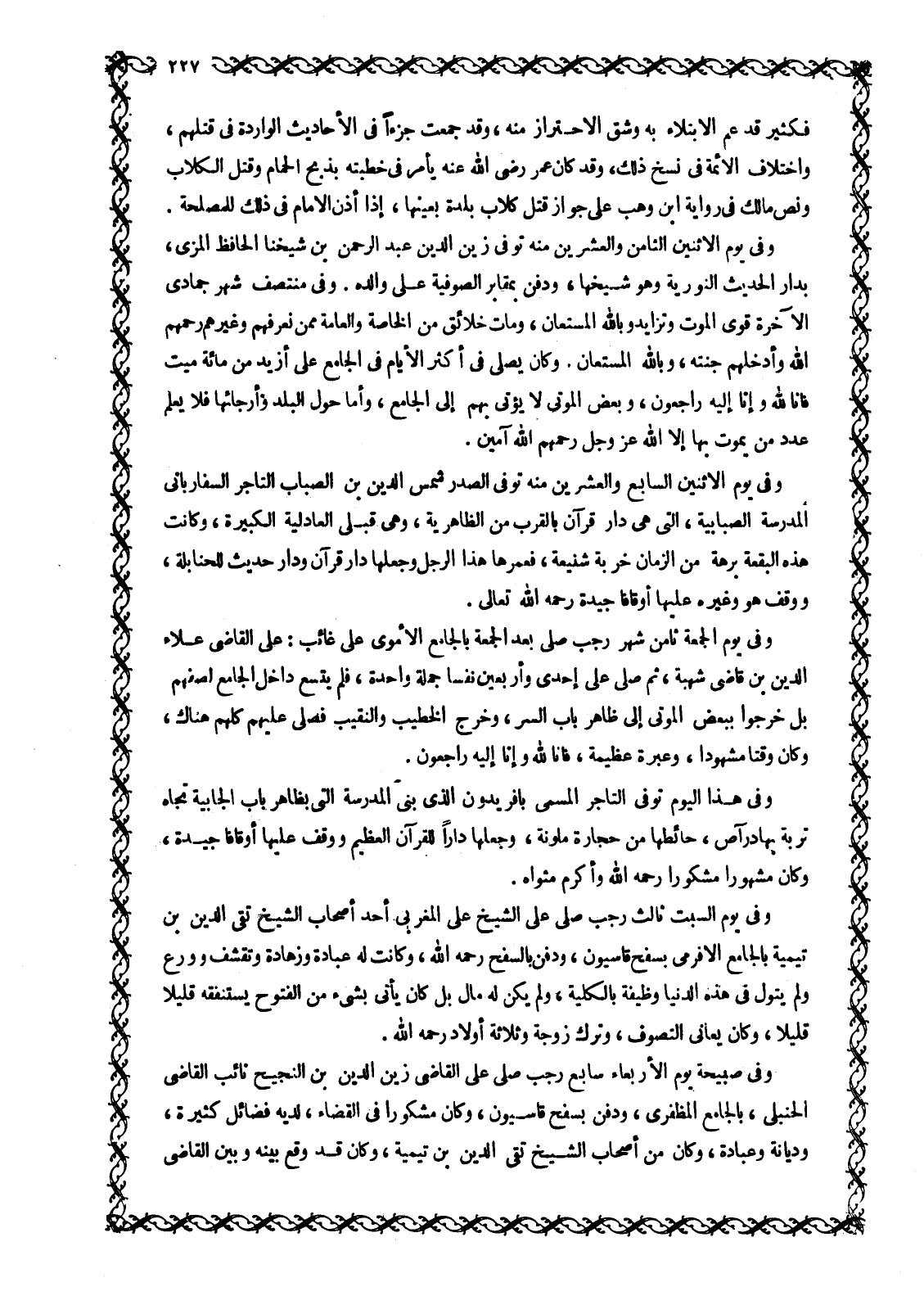 وَفِي صَبِيحَةِ يَوْمِ الْأَرْبِعَاءِ سَابِعِ رَجَبٍ صُلِّيَ عَلَى الْقَاضِي زَيْنِ الدِّينِ بْنِ النَّجِيحِ نَائِبِ الْقَاضِي الْحَنْبَلِيِّ، بِالْجَامِعِ الْمُظَفَّرِيِّ، وَدُفِنَ بِسَفْحِ قَاسِيُونَ، وَكَانَ مَشْكُورًا فِي الْقَضَاءِ، لَدَيْهِ فَضَائِلُ كَثِيرَةٌ، وَدِيَانَةٌ وَعِبَادَةٌ، وَكَانَ مِنَ اصْحَابِ الشَّيْخِ تقى الدين بن تَيْمِيَّةَ، وَكَانَ قَدْ وَقَعَ بَيْنَهُ وَبَيْنَ الْقَاضِي