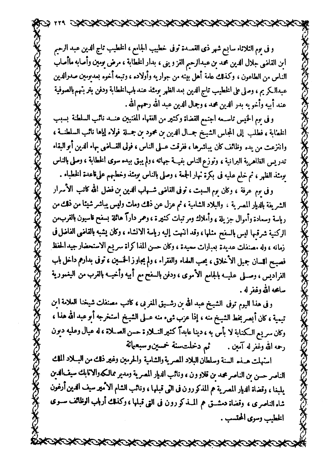 وَفِي يَوْمِ عَرَفَةَ، وَكَانَ يَوْمَ السَّبْتِ، تُوُفِّيَ الْقَاضِي شِهَابُ الدِّينِ بْنُ فَضْلِ اللَّهِ كَاتِبُ الْأَسْرَارِ الشَّرِيفَةِ بِالدِّيَارِ الْمِصْرِيَّةِ، وَالْبِلَادِ الشَّامِيَّةِ، ثُمَّ عُزِلَ عَنْ ذَلِكَ وَمَاتَ وَلَيْسَ يُبَاشِرُ شَيْئًا مِنْ ذَلِكَ مِنْ رِيَاسَةٍ وَسَعَادَةٍ وَأَمْوَالٍ جَزِيلَةٍ، وَأَمْلَاكٍ وَمُرَتَّبَاتٍ كَثِيرَةٍ، وَعَمَرَ دَارًا هَائِلَةً بِسَفْحِ قَاسِيُونَ بِالْقُرْبِ مِنَ الرُّكْنِيَّةِ شَرْقِيَّهَا لَيْسَ بِالسَّفْحِ مِثْلُهَا، وَقَدِ انْتَهَتْ إِلَيْهِ رِيَاسَةُ الْإِنْشَاءِ، وَكَانَ يُشَبَّهُ بِالْقَاضِي الْفَاضِلِ فِي زَمَانِهِ، وَلَهُ مُصَنَّفَاتٌ عَدِيدَةٌ بِعِبَارَاتٍ سَعِيدَةٍ، وَكَانَ حَسَنَ الْمُذَاكَرَةِ سَرِيعَ الِاسْتِحْضَارِ جَيِّدَ الْحِفْظِ فَصِيحَ اللِّسَانِ جَمِيلَ الْأَخْلَاقِ، يُحِبُّ الْعُلَمَاءَ وَالْفُقَرَاءَ، وَلَمْ يُجَاوِزِ الْخَمْسِينَ، تُوفِي بِدَارِهِمْ دَاخِلَ بَابِ الْفَرَادِيسِ، وَصُلِّيَ عَلَيْهِ بِالْجَامِعِ الْأُمَوِيِّ، وَدُفِنَ بِالسَّفْحِ مَعَ أَبِيهِ وَأَخِيهِ بِالْقُرْبِ مِنَ الْيَغْمُورِيَّةِ سَامَحَهُ اللَّهُ وَغَفَرَ لَهُ.