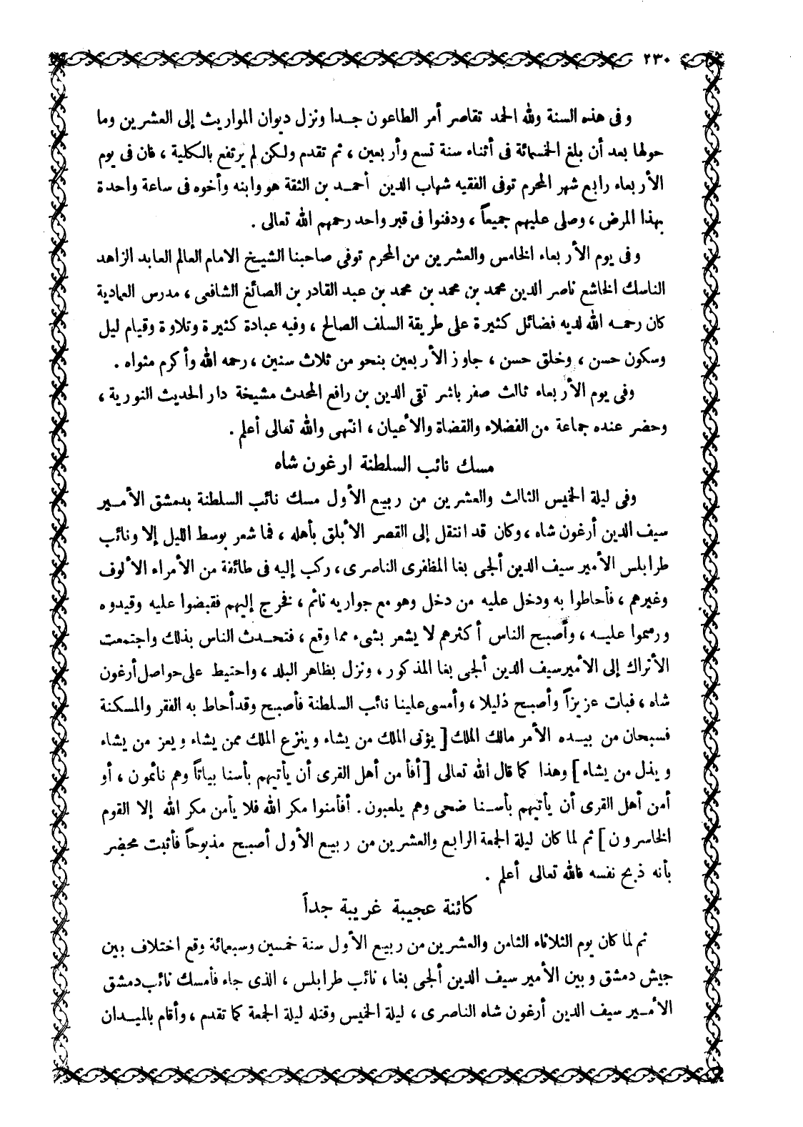 وَفِي لَيْلَةِ الْخَمِيسِ الثَّالِثِ وَالْعِشْرِينَ مِنْ رَبِيعٍ الْأَوَّلِ مُسِكَ نَائِبُ السَّلْطَنَةِ بِدِمَشْقَ الْأَمِيرُ سَيْفُ الدِّينِ أَرْغُونُ شَاهْ، وَكَانَ قَدِ انْتَقَلَ إِلَى الْقَصْرِ الْأَبْلَقِ بأهله، فما شعر بوسط اللَّيْلِ إِلَّا وَنَائِبُ طَرَابُلُسَ الْأَمِيرُ سَيْفُ الدِّينِ ألجى بغا الْمُظَفَّرِيُّ النَّاصِرِيُّ، رَكِبَ إِلَيْهِ فِي طَائِفَةٍ مِنَ الْأُمَرَاءِ الْأُلُوفِ وَغَيْرِهِمْ، فَأَحَاطُوا بِهِ وَدَخَلَ عَلَيْهِ مَنْ دَخَلَ وَهُوَ مَعَ جَوَارِيهِ نَائِمٌ، فَخَرَجَ إِلَيْهِمْ فَقَبَضُوا عَلَيْهِ وَقَيَّدُوهُ وَرَسَمُوا عَلَيْهِ، وَأَصْبَحَ النَّاسُ أَكْثَرُهُمْ لَا يَشْعُرُ بِشَيْءٍ مِمَّا وَقَعَ، فَتَحَدَّثَ النَّاسُ بِذَلِكَ وَاجْتَمَعَتِ الْأَتْرَاكُ إِلَى الْأَمِيرِ سيف الدين ألجى بغا الْمَذْكُورِ، وَنَزَلَ بِظَاهِرِ الْبَلَدِ، وَاحْتِيطَ عَلَى حَوَاصِلِ أَرْغُونَ شَاهْ، فَبَاتَ عَزِيزًا وَأَصْبَحَ ذَلِيلًا، وَأَمْسَى عَلَيْنَا نَائِبَ السَّلْطَنَةِ فَأَصْبَحَ وَقَدْ أَحَاطَ بِهِ الْفَقْرُ وَالْمَسْكَنَةُ فَسُبْحَانَ مَنْ بِيَدِهِ الْأَمْرُ مَالِكِ الْمُلْكِ يُؤْتِي الْمُلْكَ مَنْ يَشَاءُ وَيَنْزِعُ الْمُلْكَ مِمَّنْ يَشَاءُ وَيُعِزُّ مَنْ يَشَاءُ وَيُذِلُّ مَنْ يَشَاءُ وَهَذَا كَمَا قَالَ اللَّهُ تَعَالَى أَفَأَمِنَ أَهْلُ الْقُرى أَنْ يَأْتِيَهُمْ بَأْسُنا بَياتاً وَهُمْ نائِمُونَ، أَوَأَمِنَ أَهْلُ الْقُرى أَنْ يَأْتِيَهُمْ بَأْسُنا ضُحًى وَهُمْ يَلْعَبُونَ. أَفَأَمِنُوا مَكْرَ اللَّهِ فَلا يَأْمَنُ مَكْرَ الله إِلَّا الْقَوْمُ الْخاسِرُونَ 7: 97- 99 ثُمَّ لَمَّا كَانَ لَيْلَةَ الْجُمُعَةِ الرَّابِعَ وَالْعِشْرِينَ مِنْ رَبِيعٍ الْأَوَّلِ أَصْبَحَ مَذْبُوحًا فَأُثْبِتَ مَحْضَرٌ بِأَنَّهُ ذَبَحَ نَفْسَهُ فاللَّه تَعَالَى أَعْلَمُ.