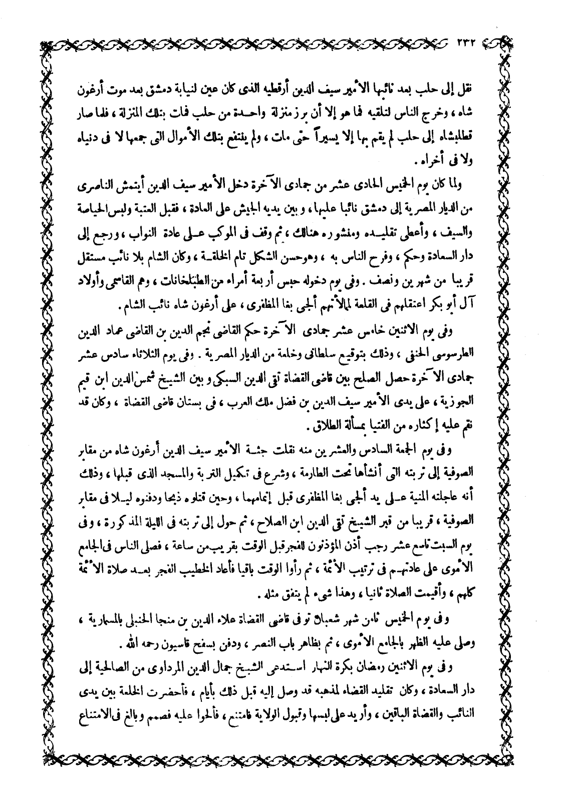 وَفِي يَوْمِ الْجُمُعَةِ السَّادِسِ وَالْعِشْرِينَ مِنْهُ نُقِلَتْ جُثَّةُ الْأَمِيرِ سَيْفِ الدِّينِ أَرْغُونَ شَاهْ مِنْ مَقَابِرِ الصُّوفِيَّةِ إِلَى تُرْبَتِهِ الَّتِي أَنْشَأَهَا تَحْتَ الطَّارِمَةِ، وَشَرَعَ فِي تَكْمِيلِ التُّرْبَةِ وَالْمَسْجِدِ الَّذِي قِبَلَهَا، وَذَلِكَ أَنَّهُ عَاجَلَتْهُ المنية على يد ألجى بغا المظفري قبل إتمامهما، وحين قتلوه ذبحا ودفنوه لَيْلًا فِي مَقَابِرِ الصُّوفِيَّةِ، قَرِيبًا مِنْ قَبْرِ الشيخ تقى الدين ابن الصَّلَاحِ، ثُمَّ حُوِّلَ إِلَى تُرْبَتِهِ فِي اللَّيْلَةِ الْمَذْكُورَةِ، وَفِي يَوْمِ السَّبْتِ تَاسِعَ عَشَرَ رَجَبٍ أَذَّنَ الْمُؤَذِّنُونَ لِلْفَجْرِ قَبْلَ الْوَقْتِ بِقَرِيبٍ مِنْ سَاعَةٍ، فَصَلَّى النَّاسُ فِي الْجَامِعِ الْأُمَوِيِّ عَلَى عَادَتِهِمْ فِي تَرْتِيبِ الْأَئِمَّةِ، ثُمَّ رَأَوُا الْوَقْتَ بَاقِيًا فَأَعَادَ الْخَطِيبُ الْفَجْرَ بَعْدَ صَلَاةِ الْأَئِمَّةِ كُلِّهِمْ، وَأُقِيمَتِ الصَّلَاةُ ثَانِيًا، وَهَذَا شَيْءٌ لَمْ يَتَّفِقْ مِثْلُهُ.