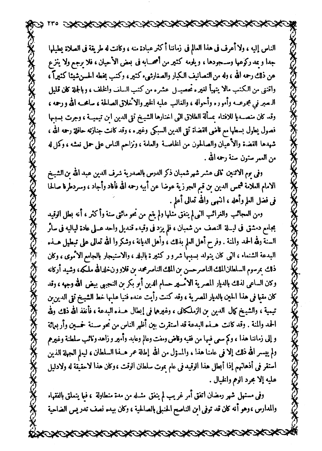 الناس إليه، ولا أعرف في هذا العالم فِي زَمَانِنَا أَكْثَرَ عِبَادَةً مِنْهُ، وَكَانَتْ لَهُ طَرِيقَةٌ فِي الصَّلَاةِ يُطِيلُهَا جِدًّا وَيَمُدُّ رُكُوعَهَا وَسُجُودَهَا، وَيَلُومُهُ كَثِيرٌ مِنْ أَصْحَابِهِ فِي بَعْضِ الْأَحْيَانِ، فَلَا يَرْجِعُ وَلَا يَنْزِعُ عَنْ ذَلِكَ رَحِمَهُ اللَّهُ، وَلَهُ مِنَ التَّصَانِيفِ الْكِبَارِ وَالصِّغَارِ شَيْءٌ كَثِيرٌ، وَكَتَبَ بِخَطِّهِ الْحَسَنِ شَيْئًا كَثِيرًا، وَاقْتَنَى مِنَ الْكُتُبِ مَا لَا يَتَهَيَّأُ لِغَيْرِهِ تَحْصِيلُ عُشْرِهِ مِنْ كُتُبِ السَّلَفِ وَالْخَلَفِ، وَبِالْجُمْلَةِ كان قليل النَّظِيرِ فِي مَجْمُوعِهِ وَأُمُورِهِ وَأَحْوَالِهِ، وَالْغَالِبُ عَلَيْهِ الْخَيْرُ وَالْأَخْلَاقُ الصَّالِحَةُ، سَامَحَهُ اللَّهُ وَرَحِمَهُ، وَقَدْ كَانَ مُتَصَدِّيًا لِلْإِفْتَاءِ بِمَسْأَلَةِ الطَّلَاقِ الَّتِي اخْتَارَهَا الشيخ تقى الدين ابن تيمية، وجرت بِسَبَبِهَا فُصُولٌ يَطُولُ بَسْطُهَا مَعَ قَاضِي الْقُضَاةِ تَقِيِّ الدِّينِ السُّبْكِيِّ وَغَيْرِهِ، وَقَدْ كَانَتْ جَنَازَتُهُ حَافِلَةً رَحِمَهُ اللَّهُ، شَهِدَهَا الْقُضَاةُ وَالْأَعْيَانُ وَالصَّالِحُونَ مِنَ الْخَاصَّةِ وَالْعَامَّةِ، وَتَزَاحَمَ النَّاسُ عَلَى حَمْلِ نَعْشِهِ، وَكَمَلَ لَهُ مِنَ الْعُمْرِ سِتُّونَ سَنَةً رَحِمَهُ اللَّهُ.
