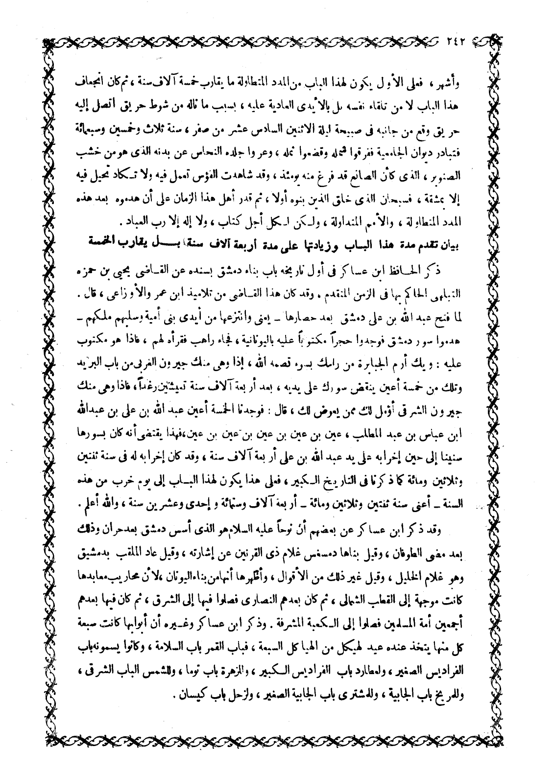 وَأَشْهَرُ، فَعَلَى الْأَوَّلِ يَكُونُ لِهَذَا الْبَابِ مِنَ الْمُدَدِ الْمُتَطَاوِلَةِ مَا يُقَارِبُ خَمْسَةَ آلَافِ سَنَةٍ، ثُمَّ كَانَ انْجِعَافُ هَذَا الْبَابِ لَا مِنْ تِلْقَاءِ نَفْسِهِ بَلْ بِالْأَيْدِي الْعَادِيَةِ عَلَيْهِ، بِسَبَبِ ما ناله من شوط حريق اتصل إليه حريق وقع من جَانِبِهِ فِي صَبِيحَةِ لَيْلَةِ الِاثْنَيْنِ السَّادِسَ عَشَرَ مِنْ صَفَرٍ، سَنَةَ ثَلَاثٍ وَخَمْسِينَ وَسَبْعِمِائَةٍ فَتَبَادَرَ ديوان الجامعية ففرقوا شمله وقضعوا ثَمْلَهُ، وَعَرَّوْا جِلْدَهُ النُّحَاسَ عَنْ بَدَنِهِ الَّذِي هُوَ مِنْ خَشَبِ الصَّنَوْبَرِ، الَّذِي كَأَنَّ الصَّانِعَ قد فرغ منه يومئذ، وقد شاهدت الفؤوس تَعْمَلُ فِيهِ وَلَا تَكَادُ تُحِيلُ فِيهِ إِلَّا بِمَشَقَّةٍ، فَسُبْحَانَ الَّذِي خَلَقَ الَّذِينَ بَنَوْهُ أَوَّلًا، ثُمَّ قَدَّرَ أَهْلَ هَذَا الزَّمَانِ عَلَى أَنْ هدموه بَعْدَ هَذِهِ الْمُدَدِ الْمُتَطَاوِلَةِ، وَالْأُمَمِ الْمُتَدَاوَلَةِ، وَلَكِنْ لكل أجل كتاب، وَلَا إِلَهَ إِلَّا رَبُّ الْعِبَادِ.