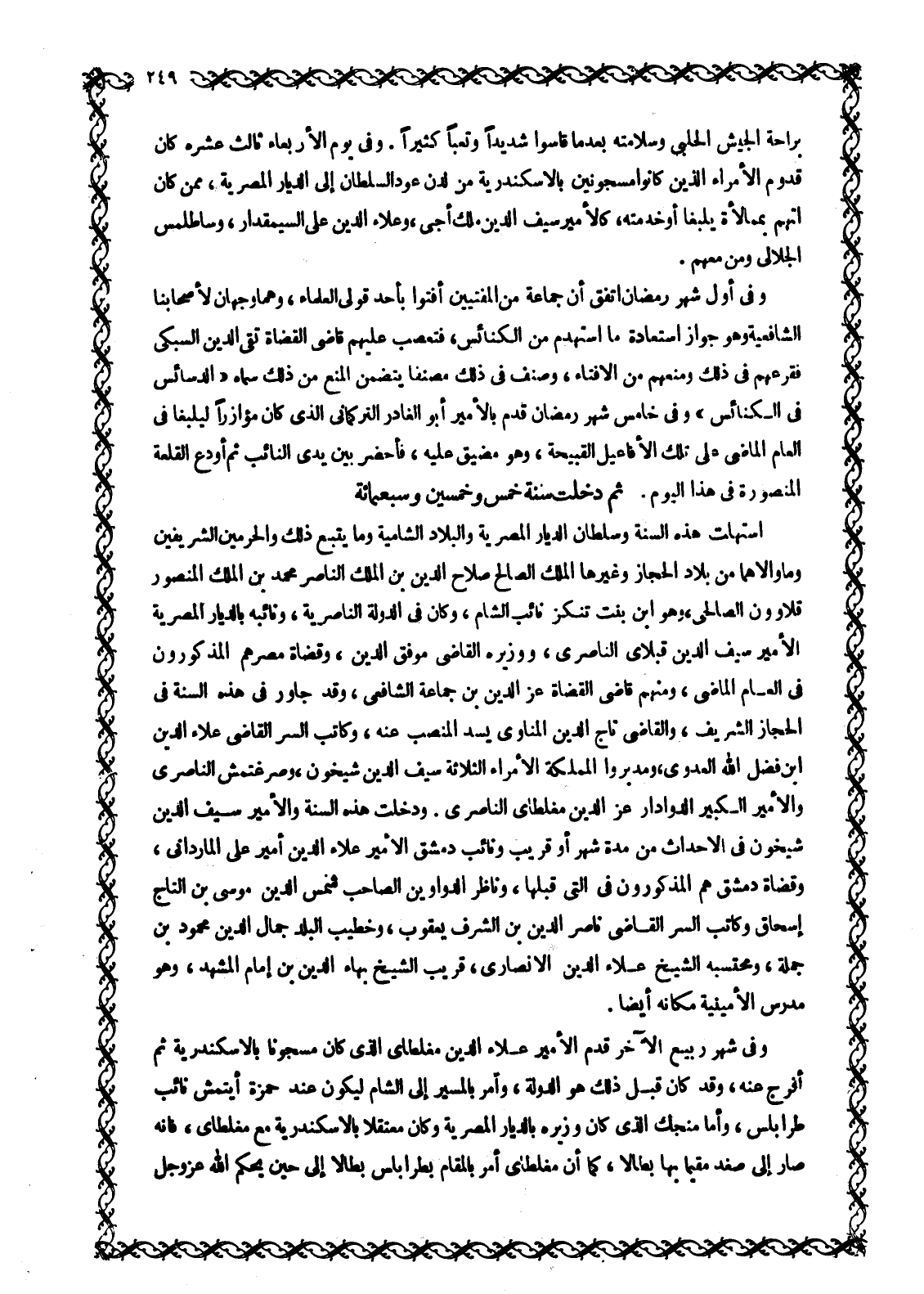 براحة الجيش الحلبي وسلامته بعد ما قَاسَوْا شَدِيدًا وَتَعَبًا كَثِيرًا. وَفِي يَوْمِ الْأَرْبِعَاءِ ثَالِثَ عَشَرَهُ كَانَ قُدُومُ الْأُمَرَاءِ الَّذِينَ كَانُوا مَسْجُونِينَ بِالْإِسْكَنْدَرِيَّةِ مِنْ لَدُنْ عَوْدِ السُّلْطَانِ إِلَى الديار المصرية، ممن كان اتهم بممالأة يلبغا أو خدمته، كالأمير سيف الدين ملك أجى، وعلاء الدين على السيمقدار، وساطلمس الْجَلَالِيِّ وَمَنْ مَعَهُمْ.
